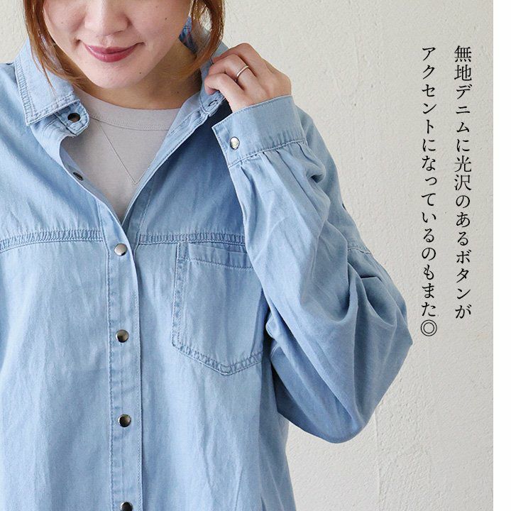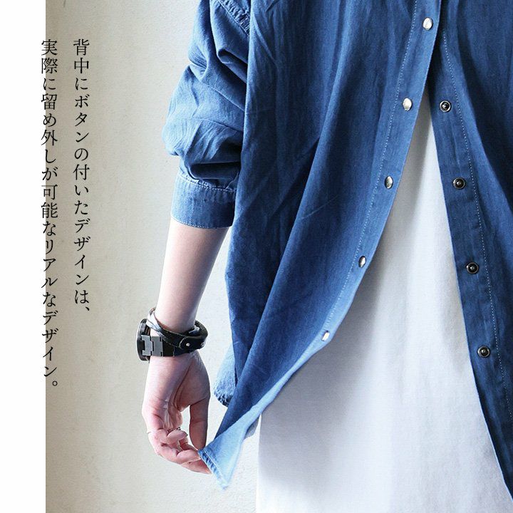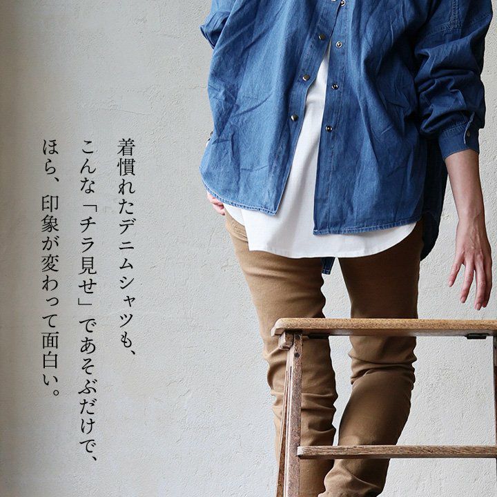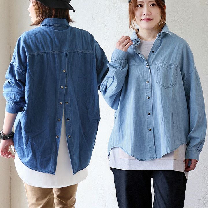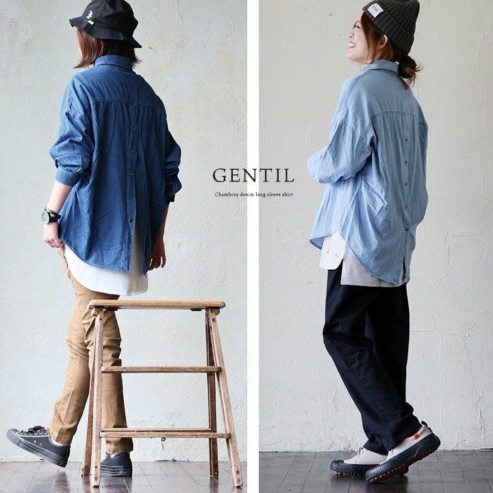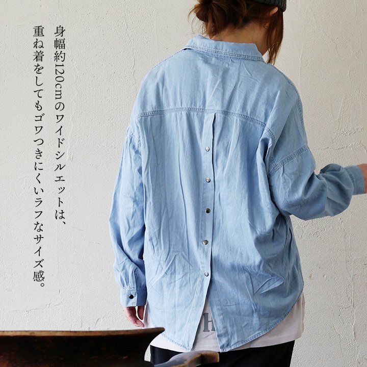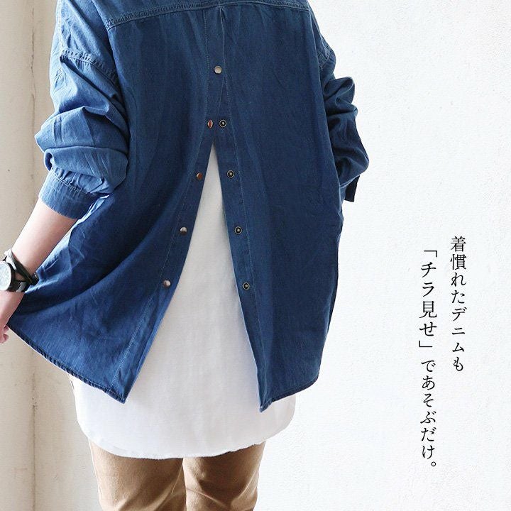着慣れたデニムも「チラ見せ」であそぶだけ。 シャツ 長袖 デニムシャツ レディース バックボタン 重ね着 コットン ポリエステル シャンブレー 薄手 紫外線 冷房対策 羽織り 体型カバー 着痩せ すっきり カジュアル パティ GENTIL ジャンティ