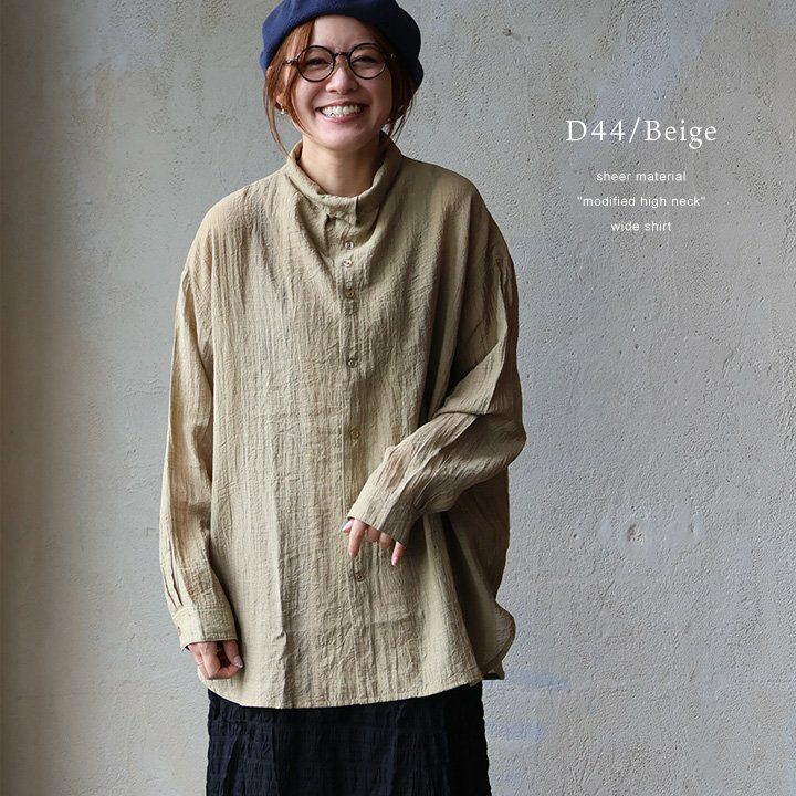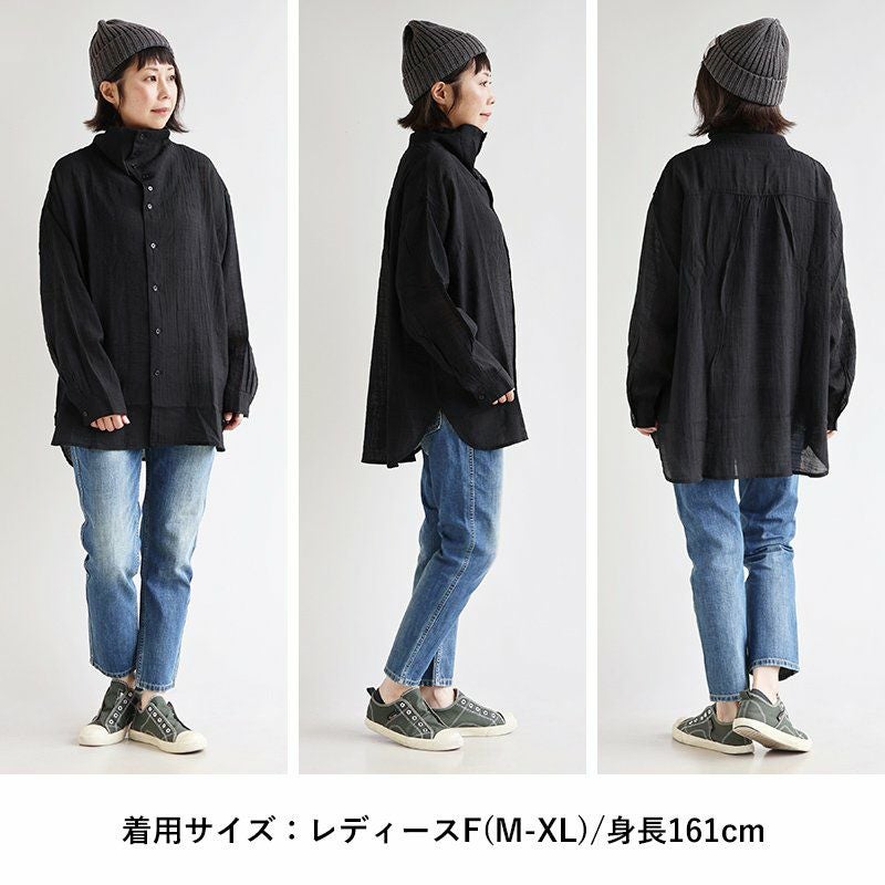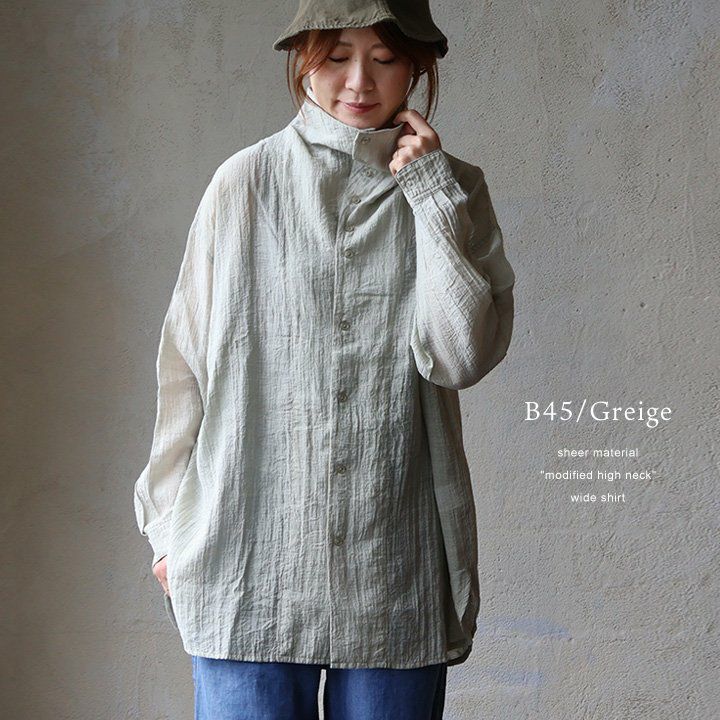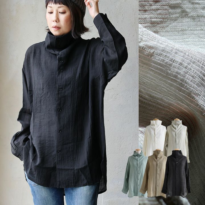 ひと際異彩を放つ、この「ひと癖」がいいんです。 【メール便50】 シャツ 長袖 涼しい レディース 変形ネック ハイネック タートル 連ボタン ワイド 着痩せ 首元 お尻 体系 カバー 薄手 軽い シアー 晩夏 初秋 UV エアコン対策 大きいサイズ カジュアル メンズライク パティ GENTIL ジャンティ