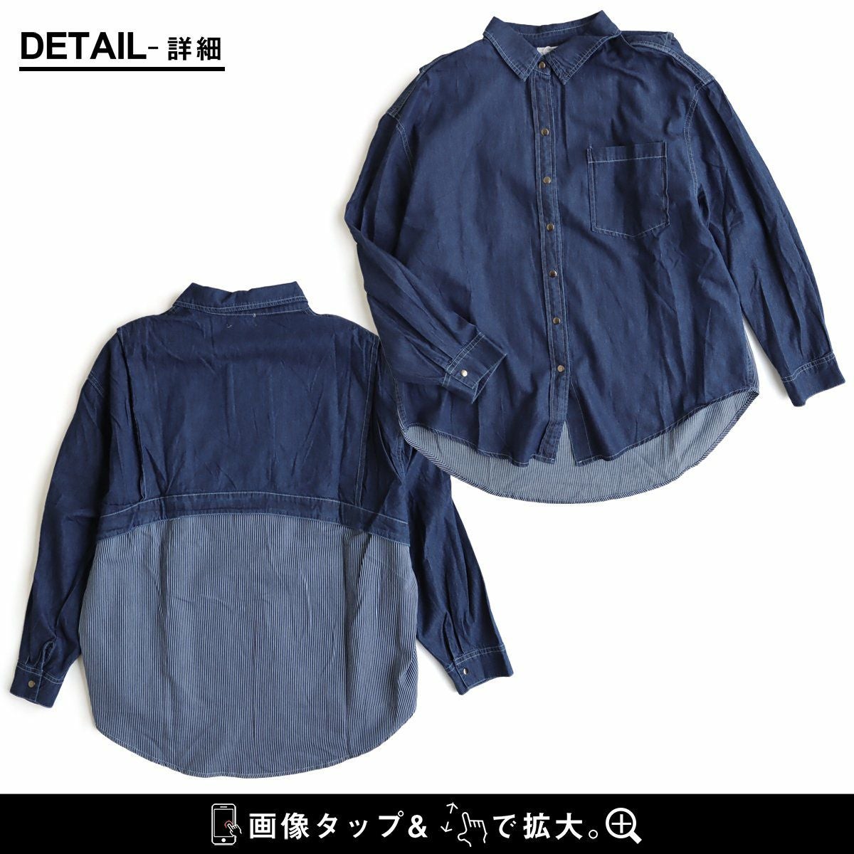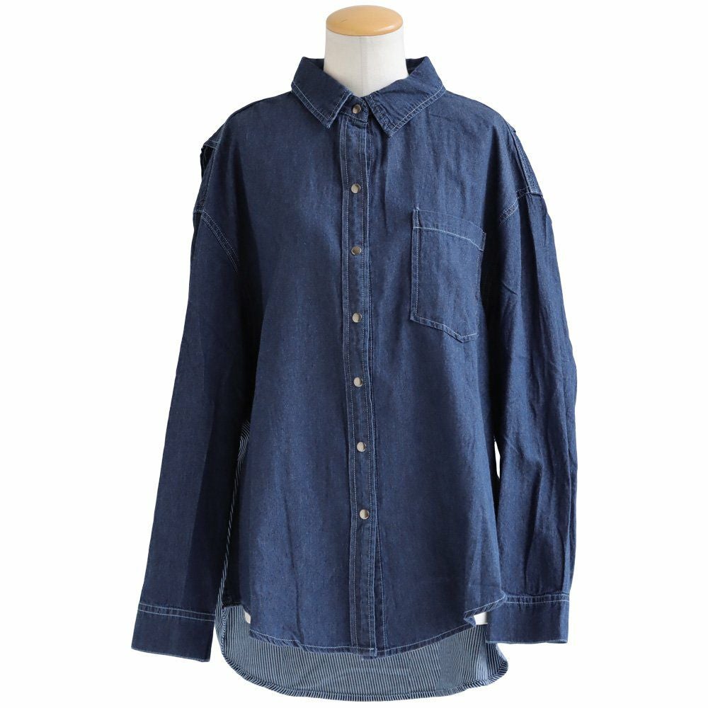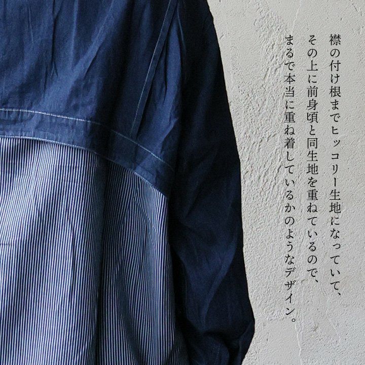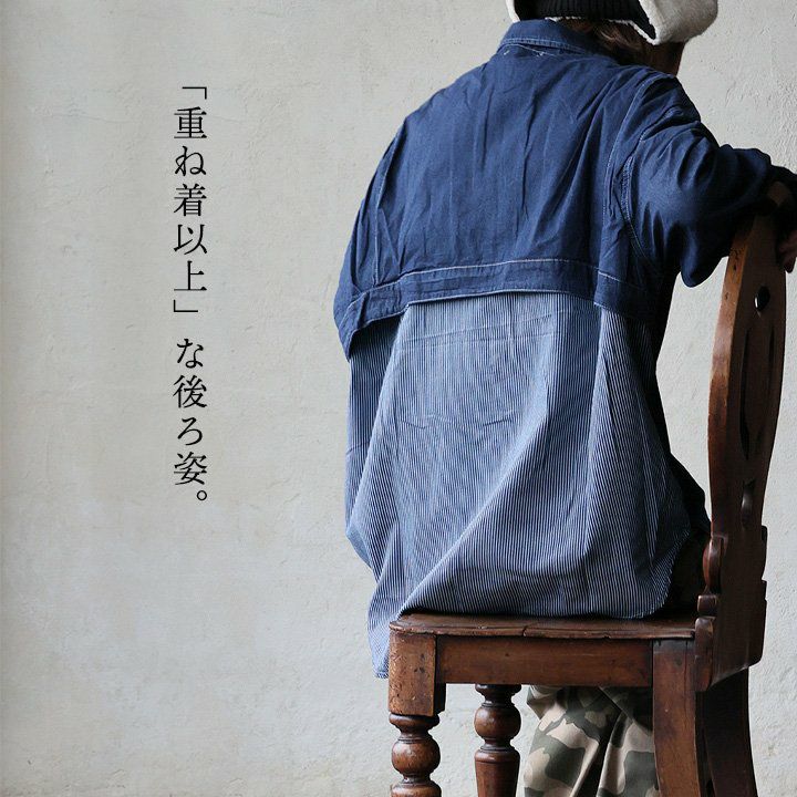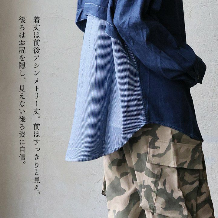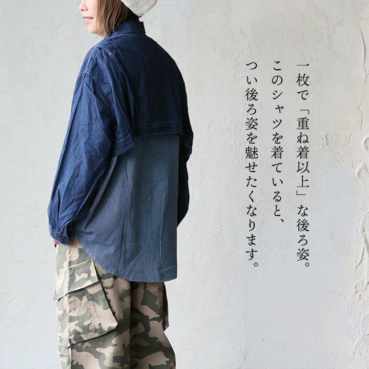 「重ね着以上」な後ろ姿。 シャツ 長袖 レディース お尻隠れる コットン ポリエステル 配色 ヒッコリー 重ね着風 薄手 軽い ゆったり 大きいサイズ 体型カバー カジュアル 秋 冬 春 パティ GENTIL ジャンティ