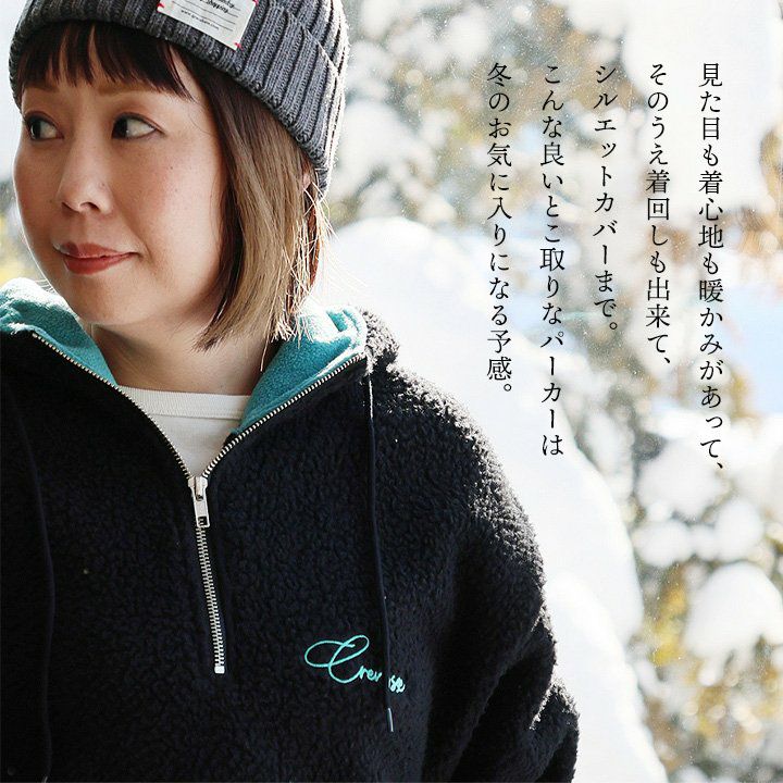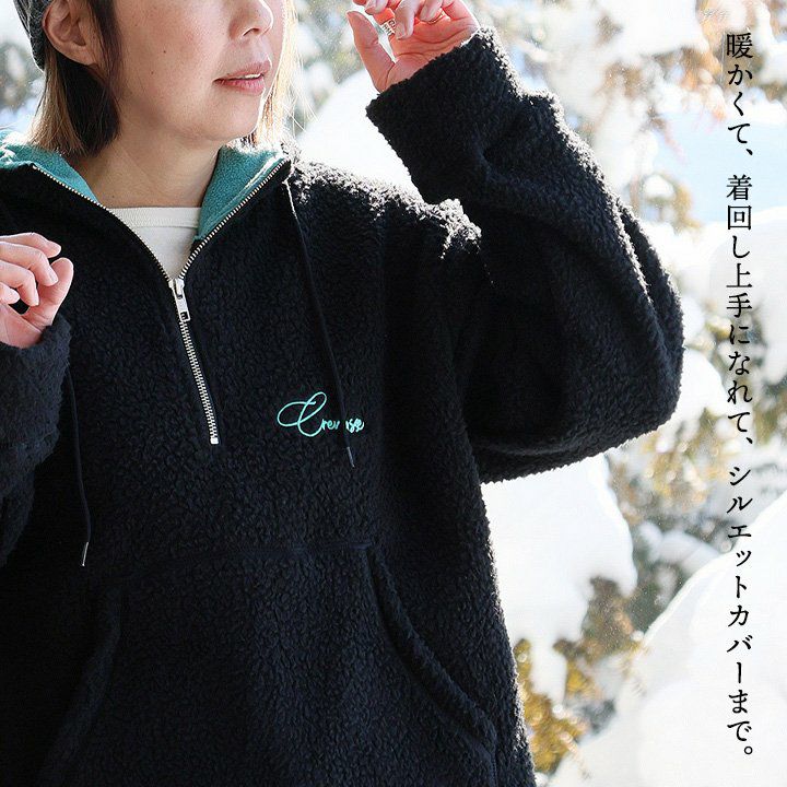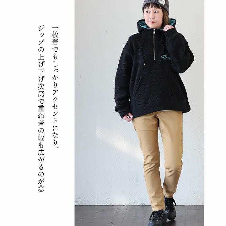 暖かくて、着回し上手になれて、シルエットカバーまで。 パーカー 長袖 レディース ハーフジップ ボア ロゴ 刺繍 ワンポイント カンガルーポケット 大きいサイズ 体型カバー カジュアル 秋 冬 パティ GENTIL ジャンティ