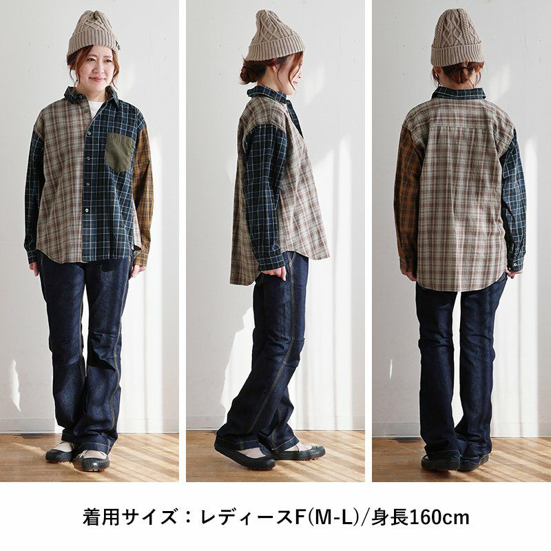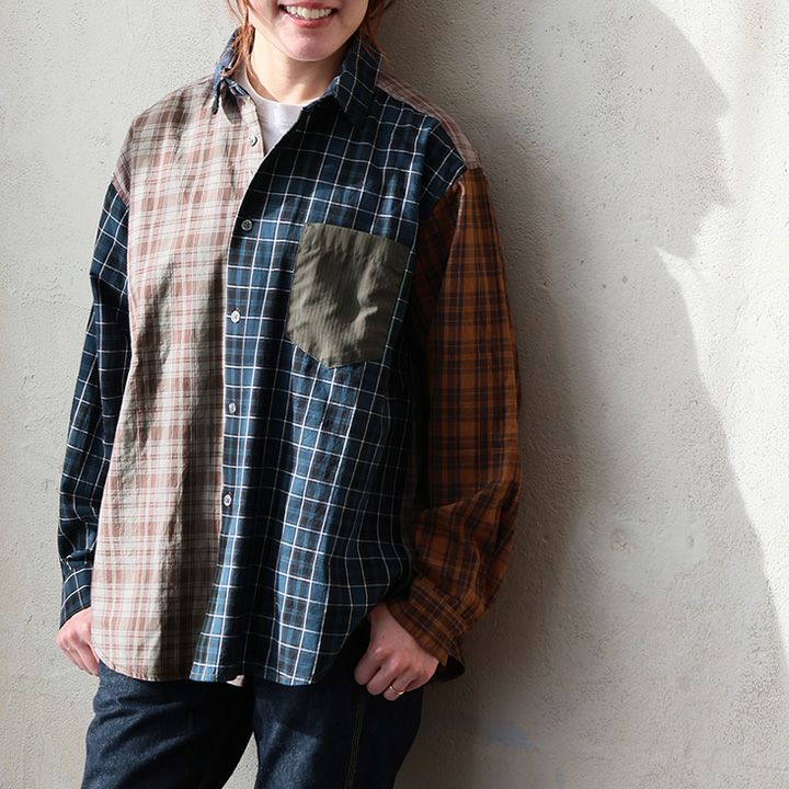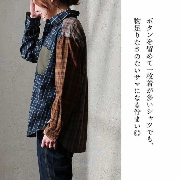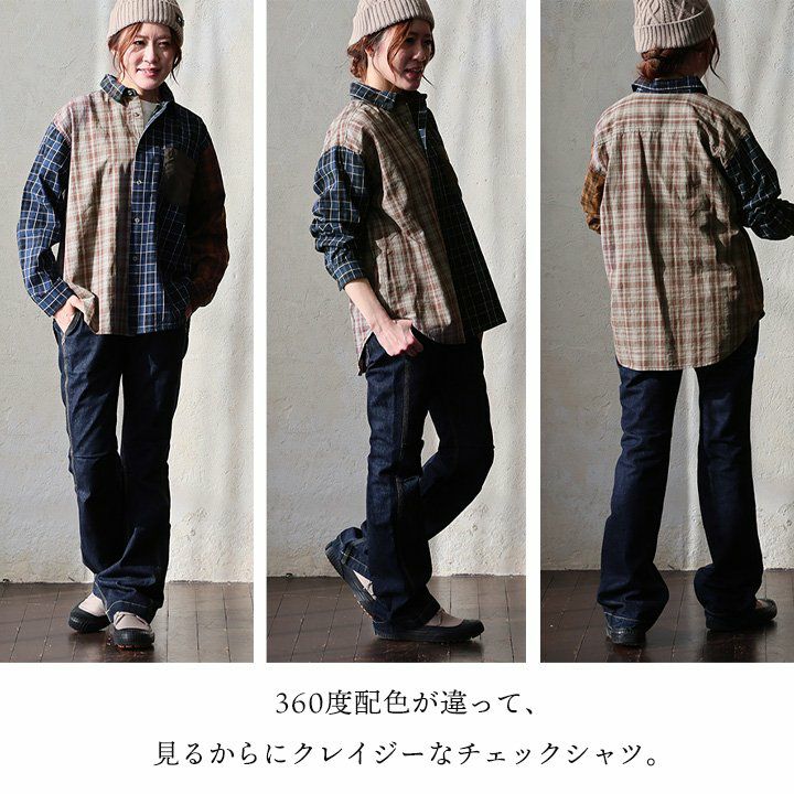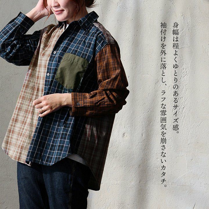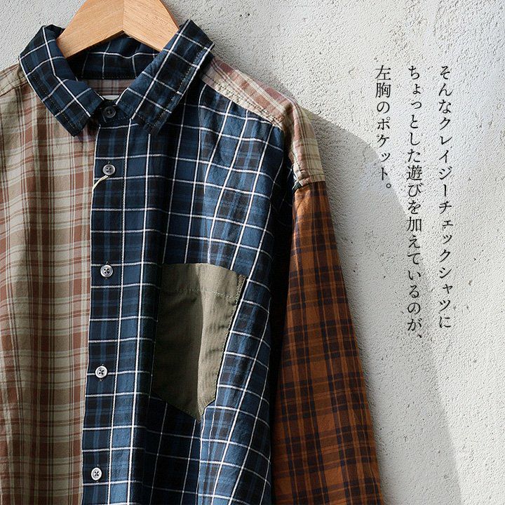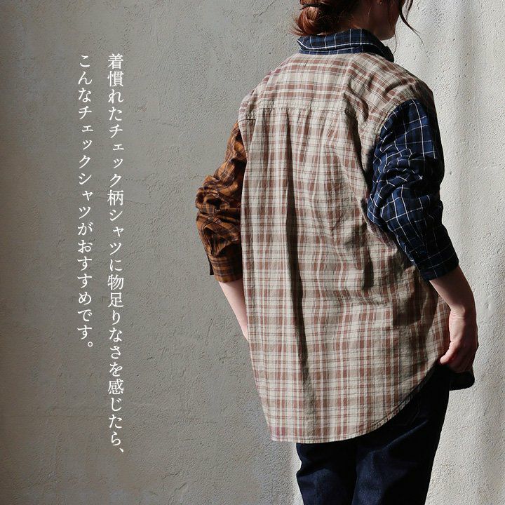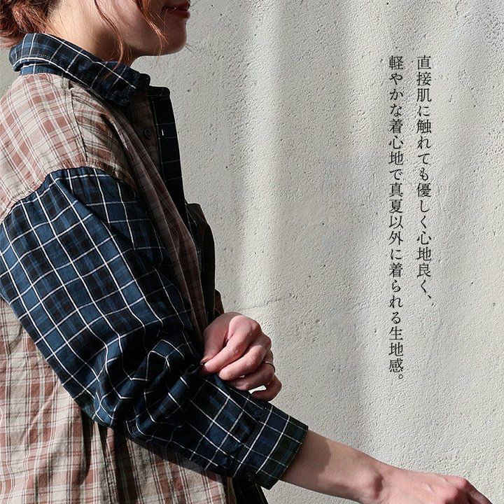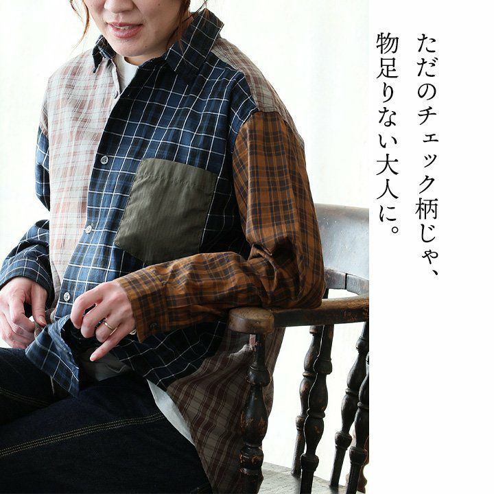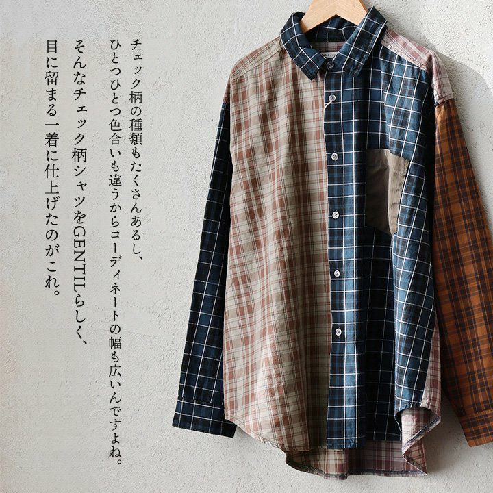 ただのチェック柄じゃ、物足りない大人に。 【メール便50】 シャツ 長袖 レディース レギュラーカラー チェック柄 クレイジー 胸ポケット 異素材切り替え 綿100 コットン 薄手 軽い ゆったり 大きいサイズ カジュアル パティ GENTIL ジャンティ