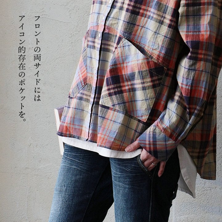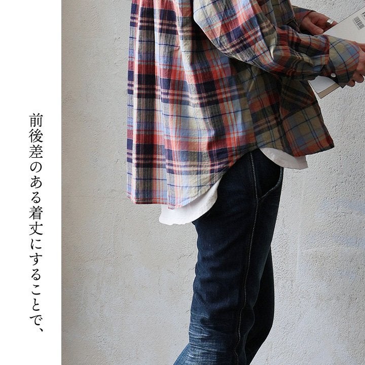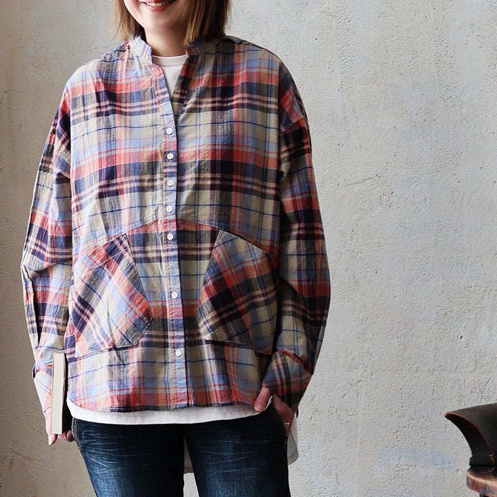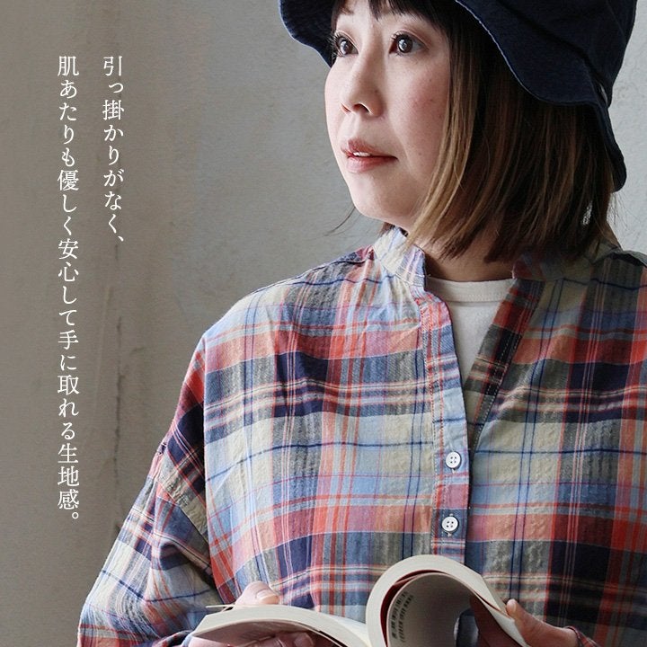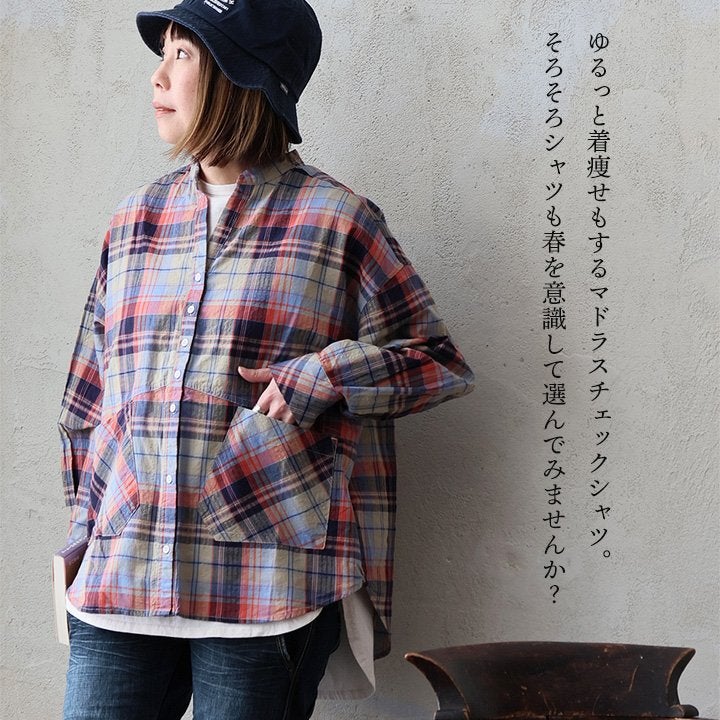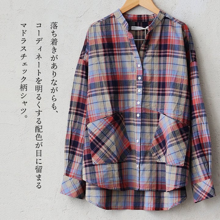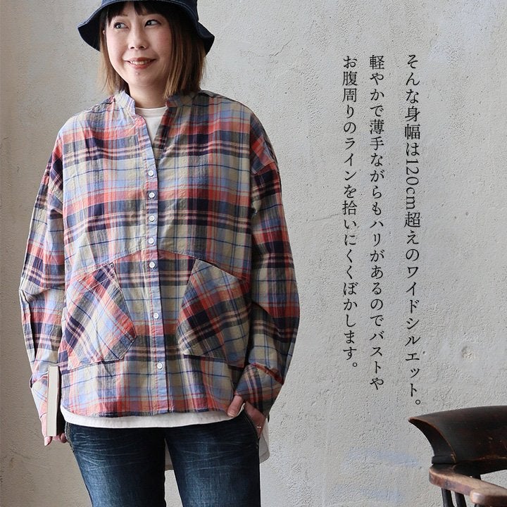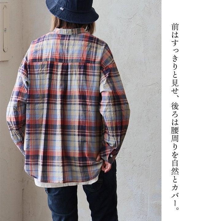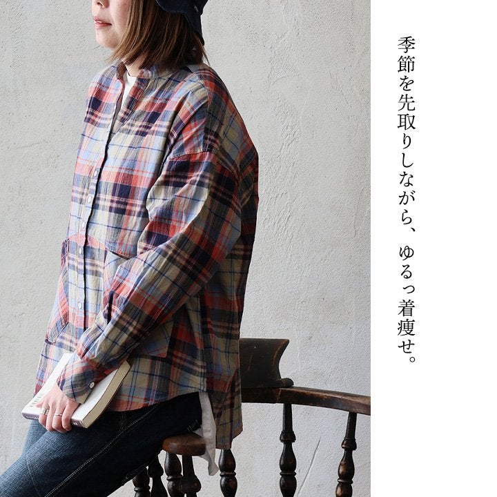 季節を先取りしながら、ゆるっ着痩せ。 シャツ 長袖 レディース バンドカラー スキッパー風 マドラスチェック柄 綿100 コットン 薄手 軽い ゆったり 大きいサイズ 体型カバー カジュアル 春 パティ GENTIL ジャンティ