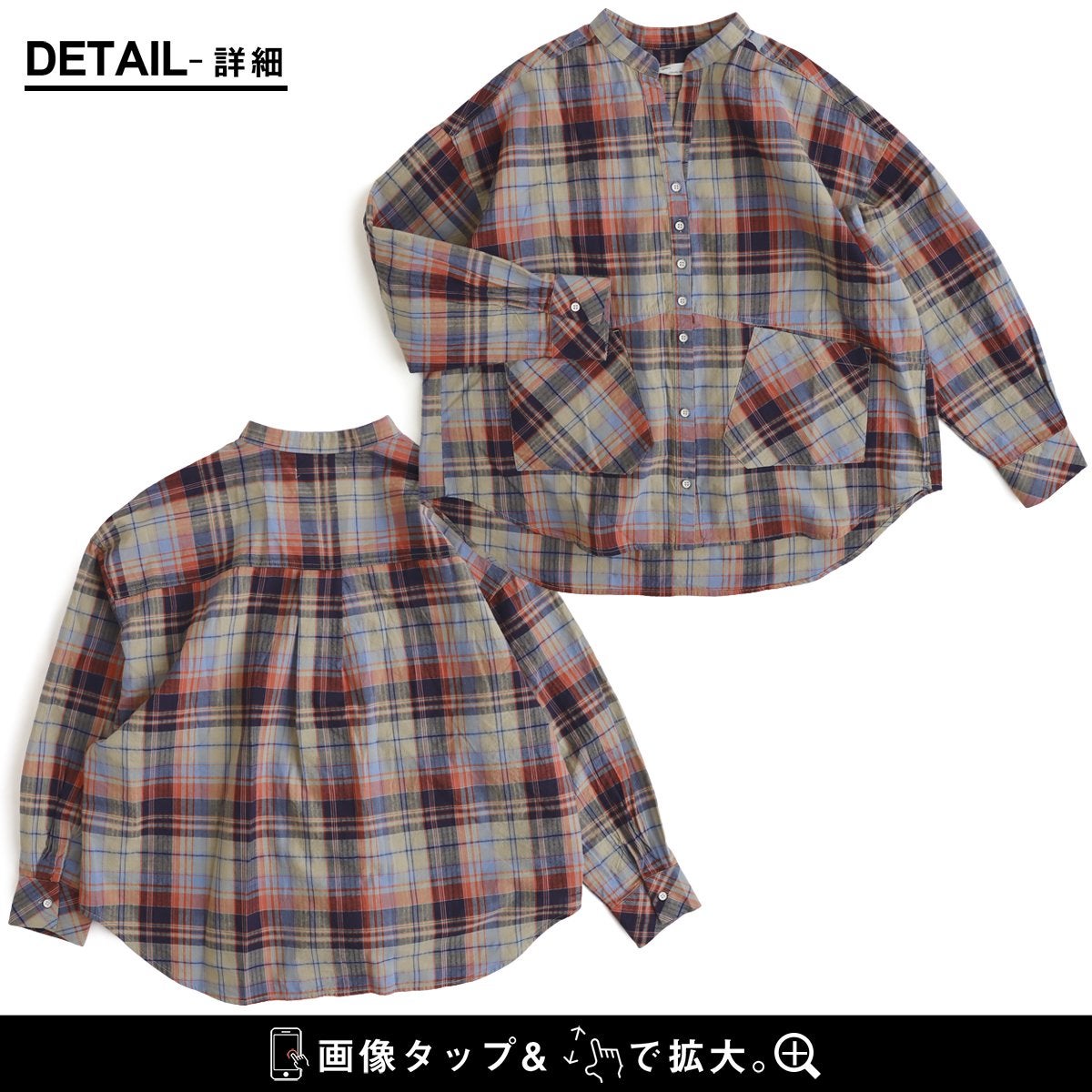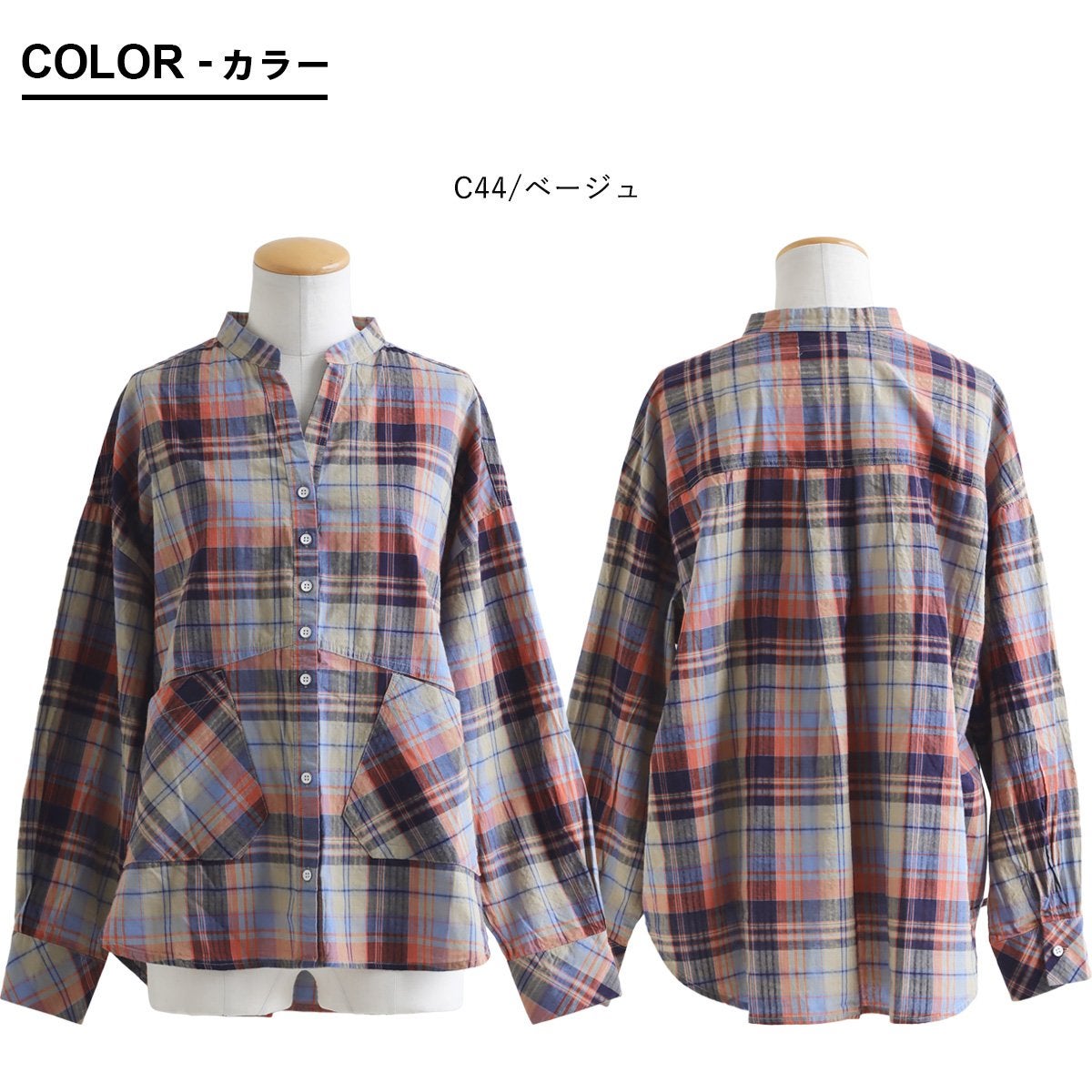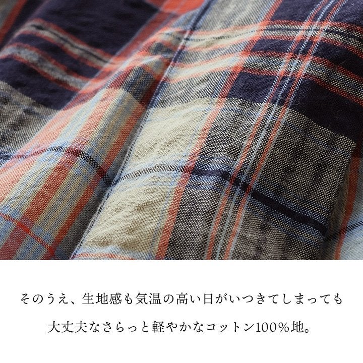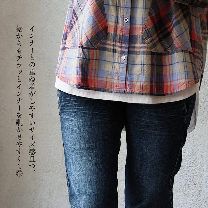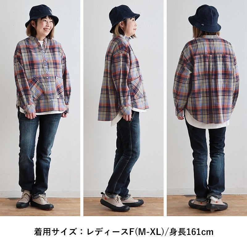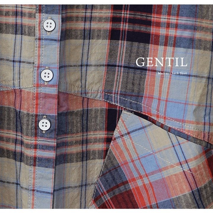 季節を先取りしながら、ゆるっ着痩せ。 シャツ 長袖 レディース バンドカラー スキッパー風 マドラスチェック柄 綿100 コットン 薄手 軽い ゆったり 大きいサイズ 体型カバー カジュアル 春 パティ GENTIL ジャンティ