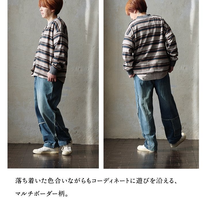 コーディネートを盛り上げる「レトロボーダー」。 ロンT カットソー 長袖 レディース マルチボーダー 配色 リブ切り替え 綿100 コットン 伸縮性 ゆったり 大きいサイズ カジュアル 重ね着 秋 パティ GENTIL ジャンティ
