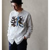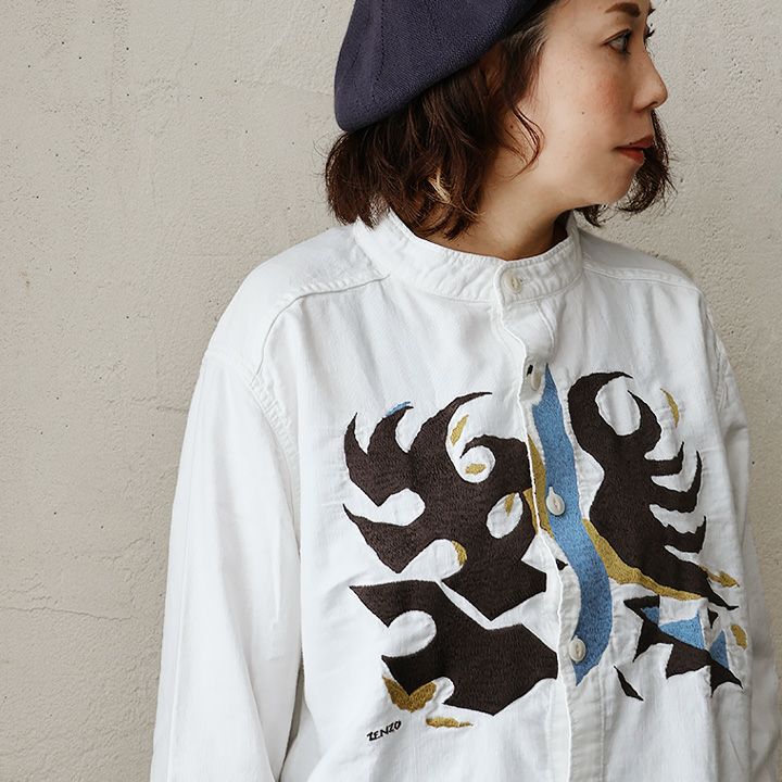 真っ白な生地に映える「炎」。 TIGRE BROCANTE ティグルブロカンテ シャツ 長袖 メンズ レディース バンドカラー 刺繍 炎 綿100% コットン 日本製 しっかり生地 丈夫 すっきり 大きいサイズ カジュアル ヴィンテージ パティ