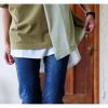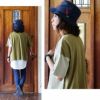 古着のような風合いの生地感。コットン100%生地でリメイク風のデザインが特徴で、丈夫でくたっとした柔らかさがあり伸縮性も程よくあります。透け感はありません。