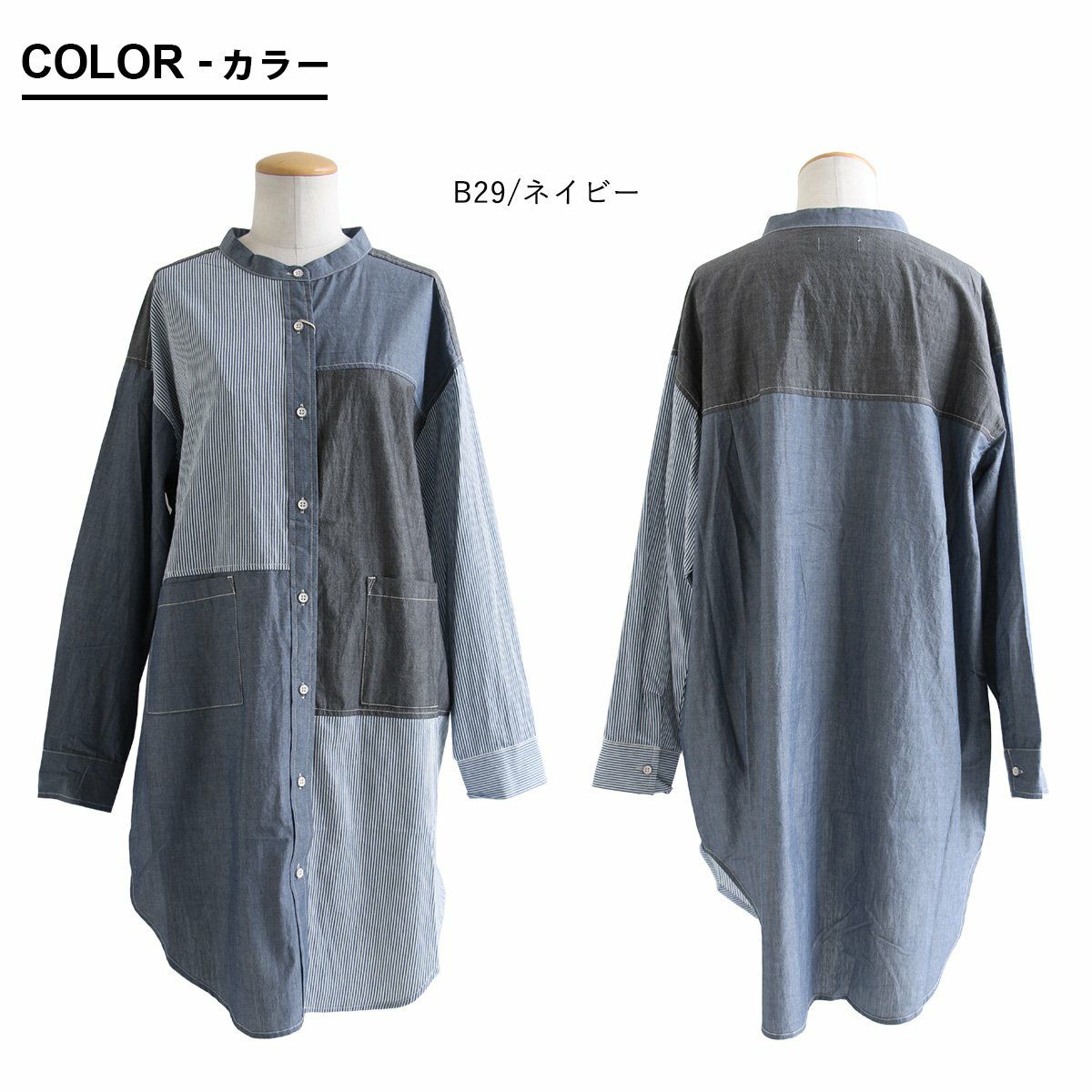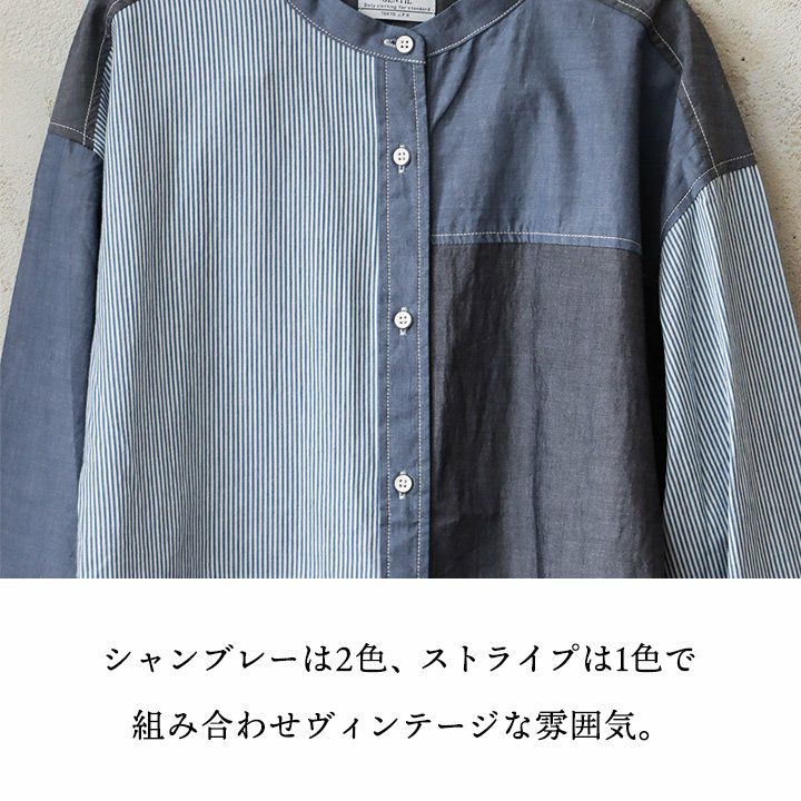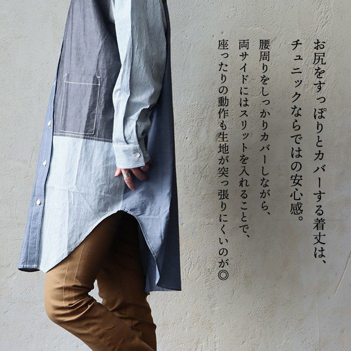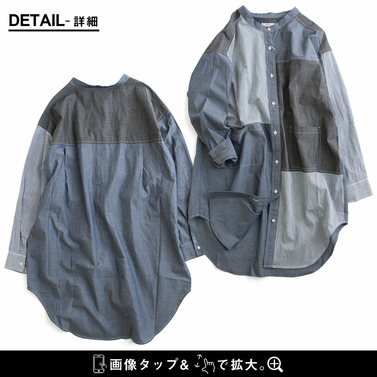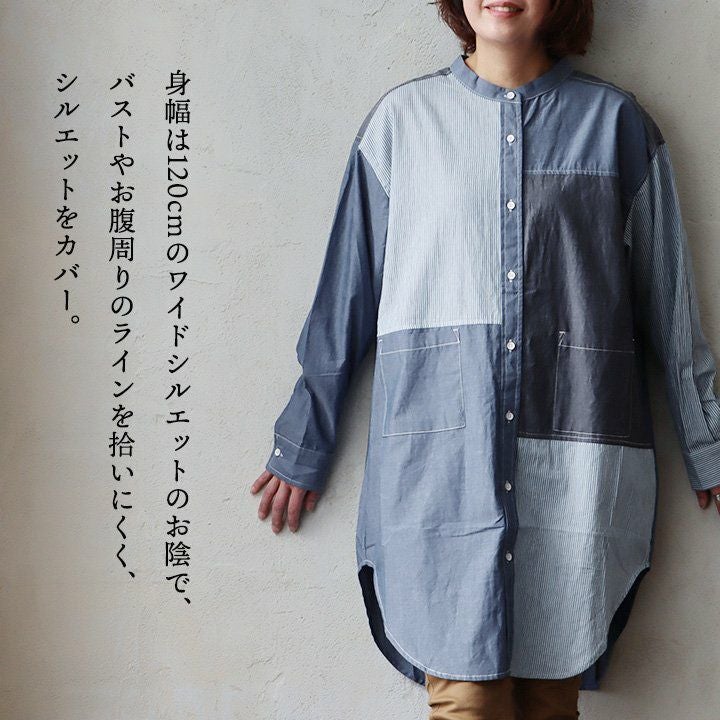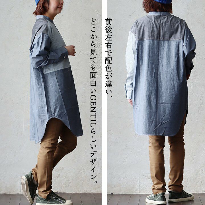 雰囲気の違う生地で、ヴィンテージライクな存在感。 チュニックシャツ シャツ 長袖 レディース バンドカラー 無地 ストライプ 配色 綿100 コットン シャンブレー 薄手 軽い ゆったり お尻隠れる 大きいサイズ 体型カバー カジュアル 春 パティ GENTIL ジャンティ