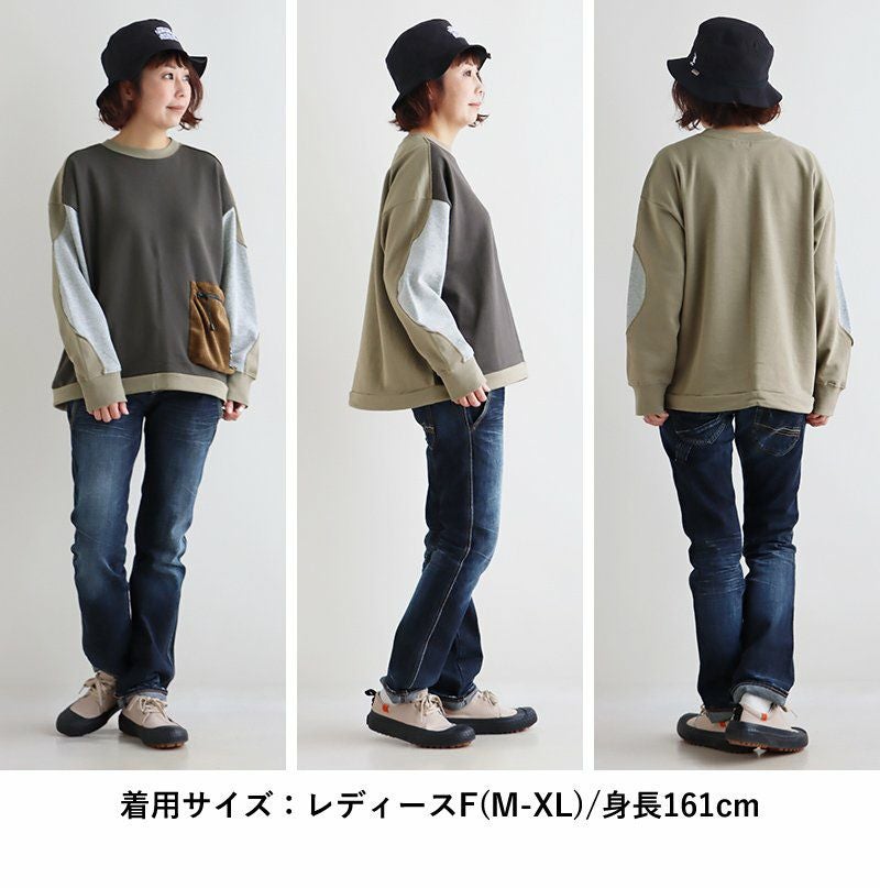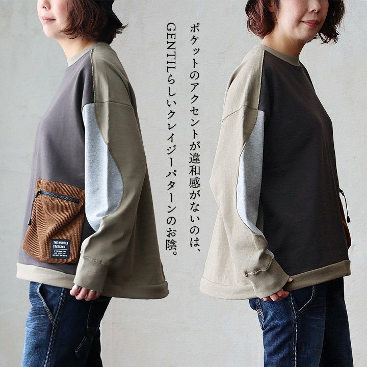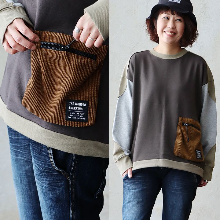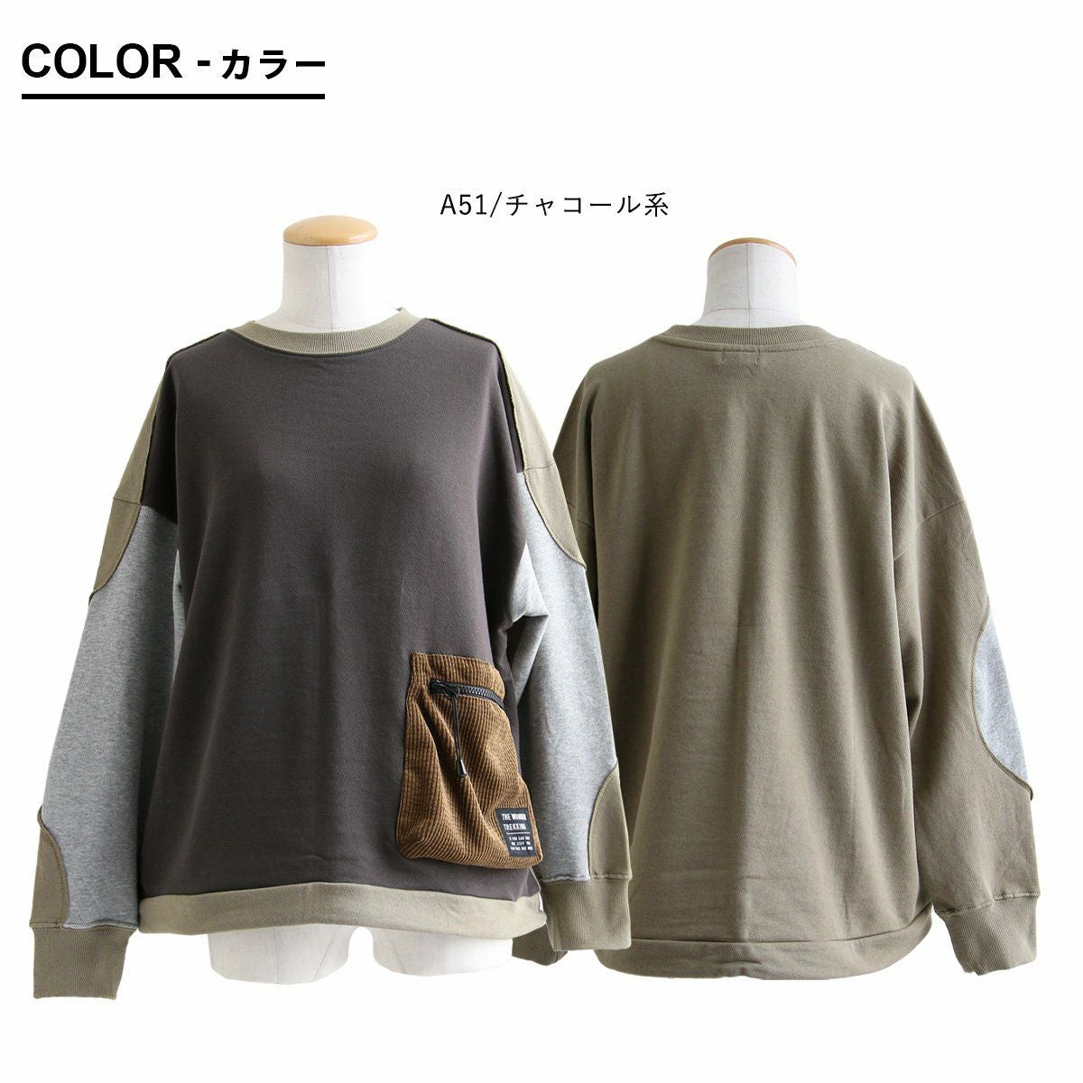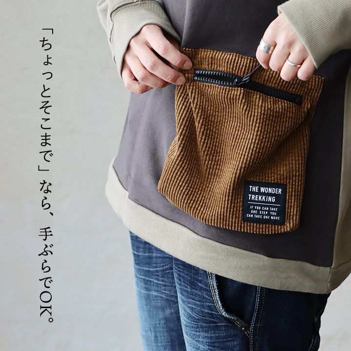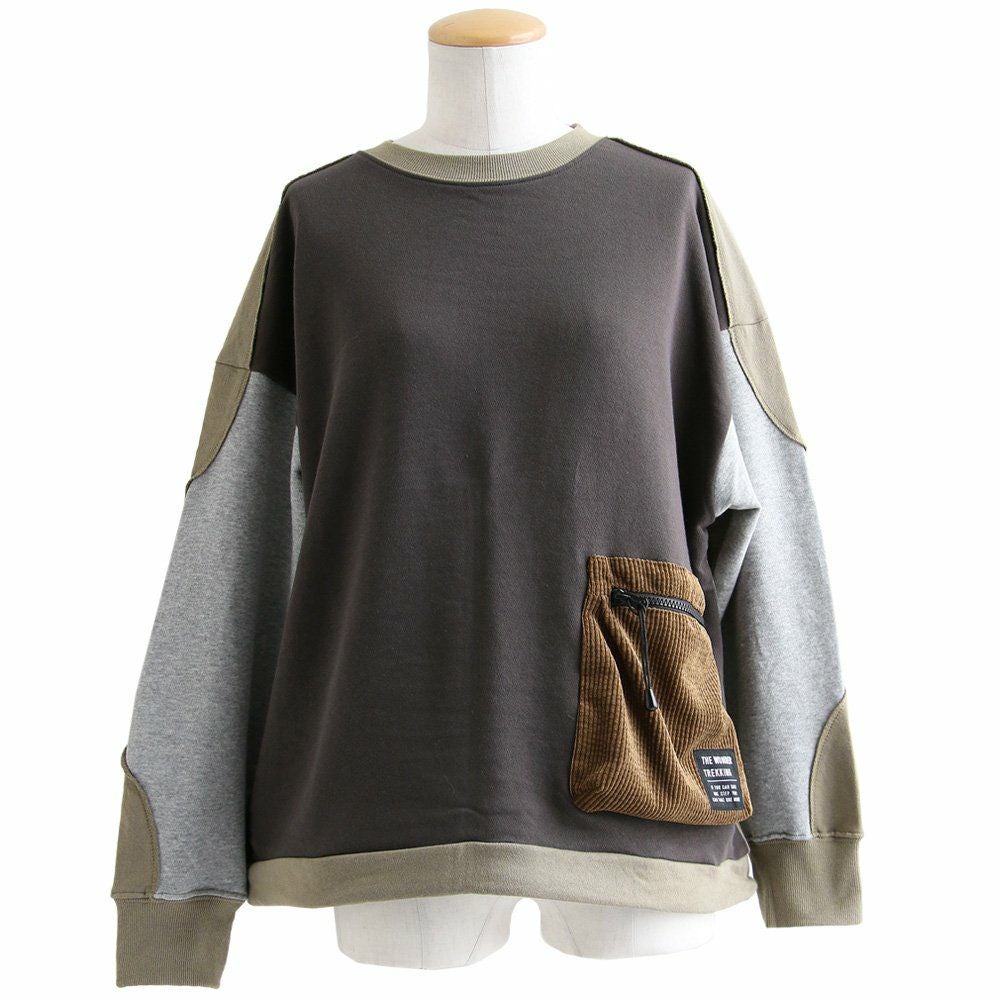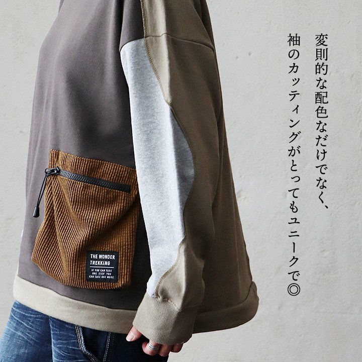 「ちょっとそこまで」なら、手ぶらでOK。 トレーナー 長袖 レディース ポケット ミニバッグ バッグ要らず 変則 クレイジー 配色 切り替え ミニ 裏毛 スウェット ワイド ゆったり 着痩せ 裾 絞れる カジュアル 秋 冬 パティ GENTIL ジャンティ