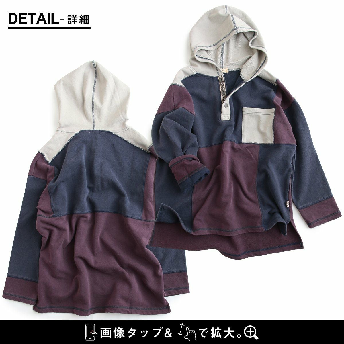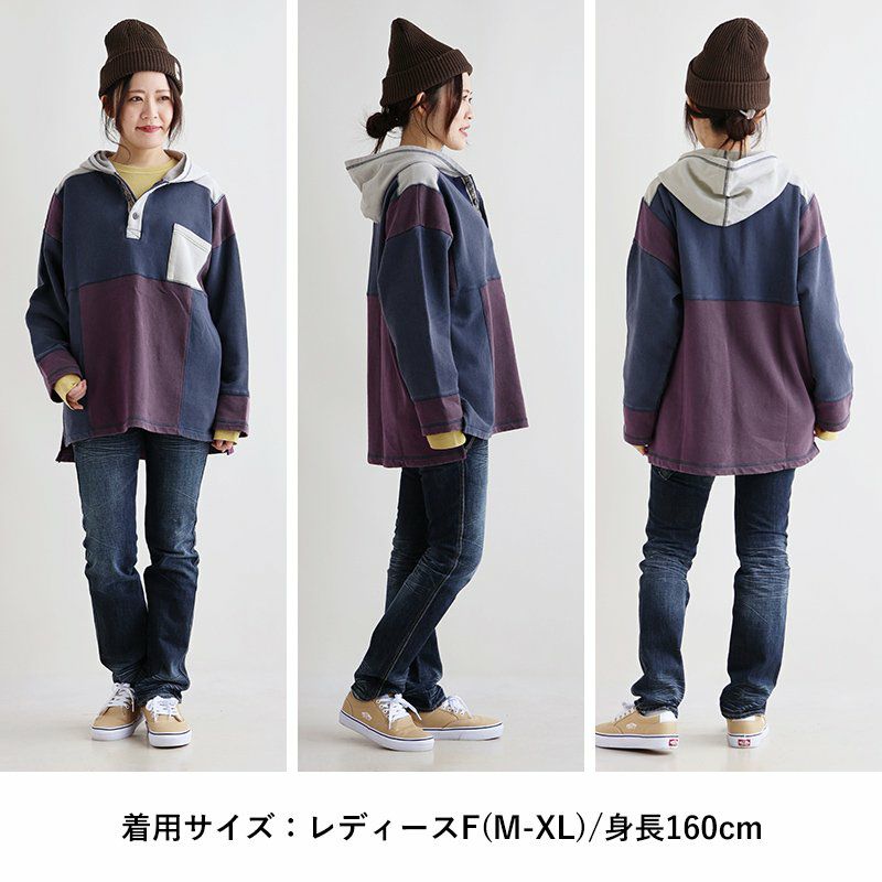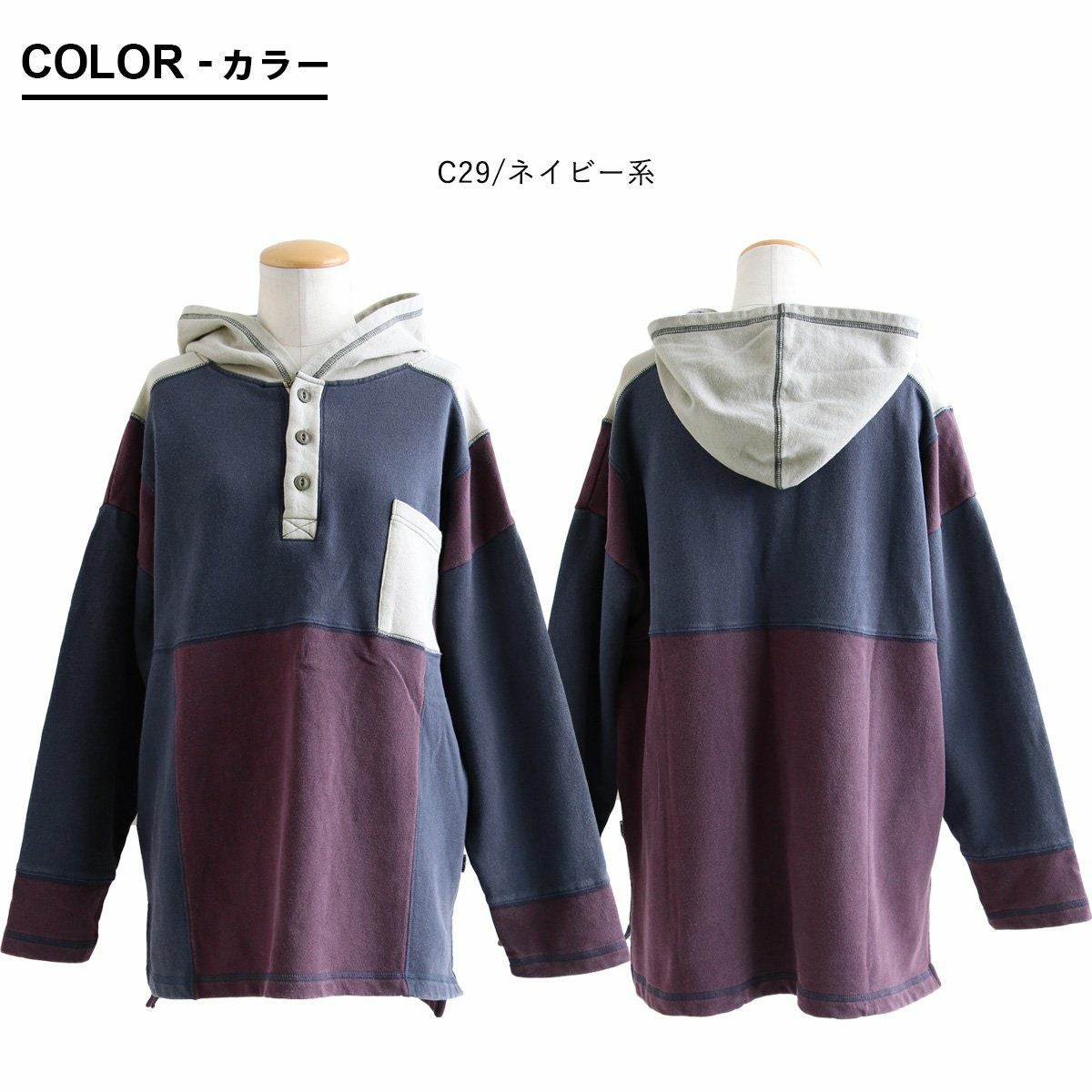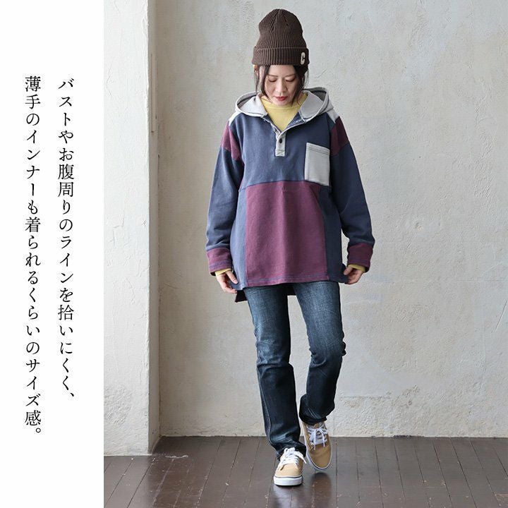 古着っぽい、遊び心。 パーカー 長袖 レディース ヘンリーネック 配色切り替え リメイク風 綿100 コットン 裏毛 伸縮性 ゆったり 大きいサイズ 体型カバー カジュアル メンズライク 秋 冬 パティ GENTIL ジャンティ