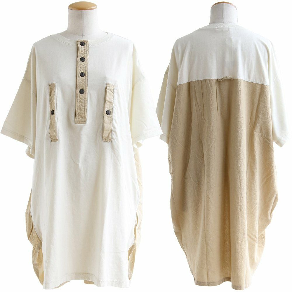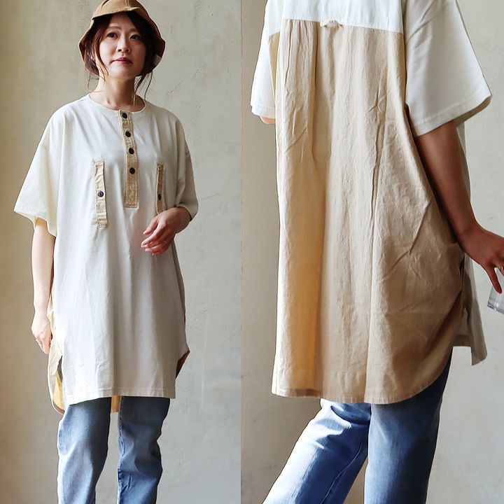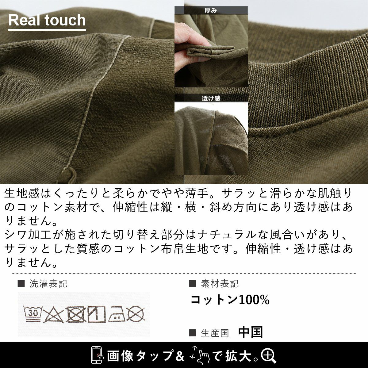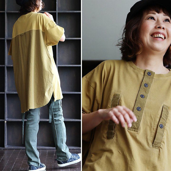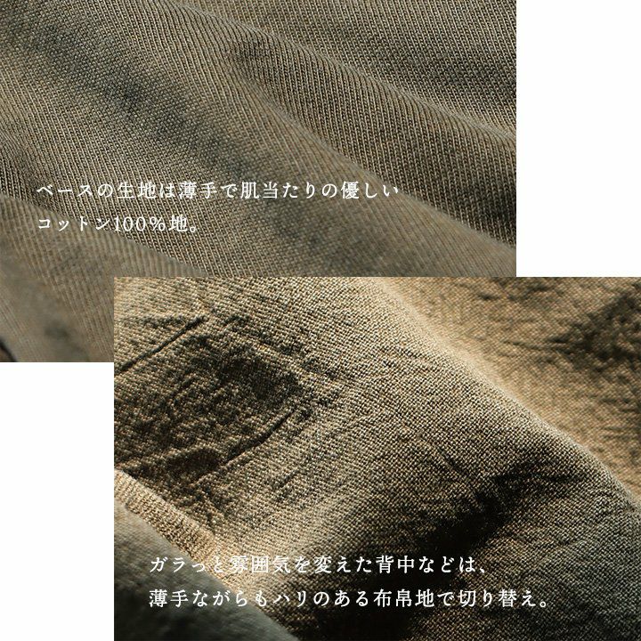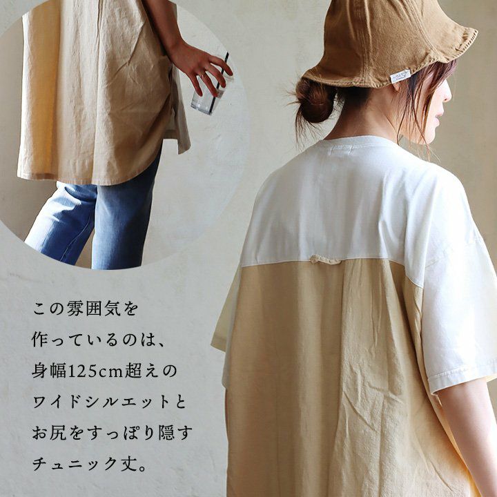メンズっぽい見た目に、レディースならではの安心感を。 着痩せ tシャツ ワイド 5分袖 チュニック 夏 レディース ピグメント 異素材 綿100 コットン 布帛 お尻 二の腕 体型カバー 大きいサイズ カジュアル ヴィンテージ パティ GENTIL ジャンティ