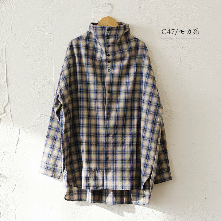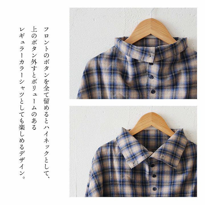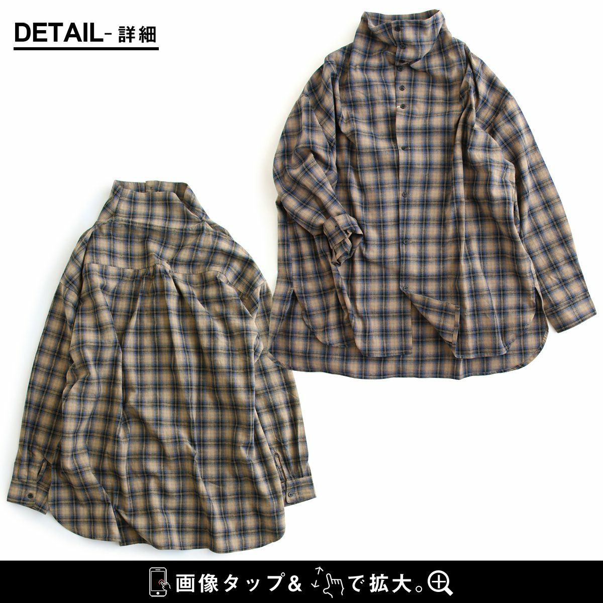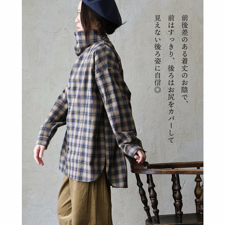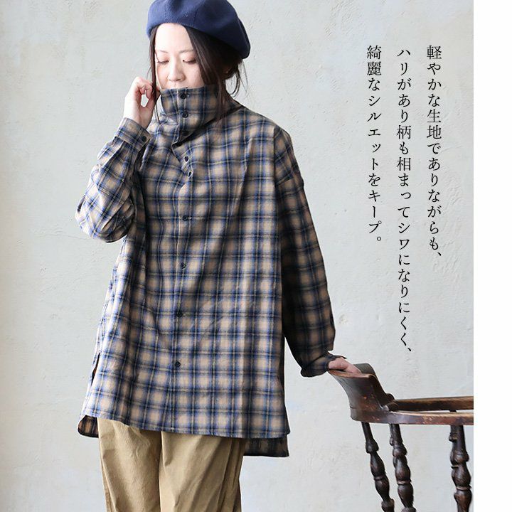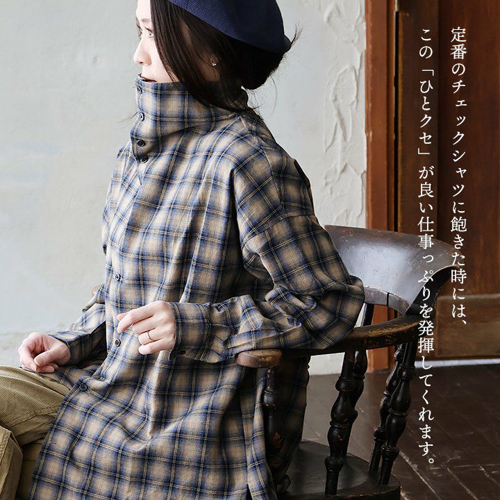 この「ひとクセ」が良い仕事っぷり。 シャツ 長袖 レディース ハイネック 変形ネック チェック柄 コットン しっかり生地 ハリ タフ お尻隠れる 体型カバー 着痩せ すっきり カジュアル 秋 冬 パティ GENTIL ジャンティ