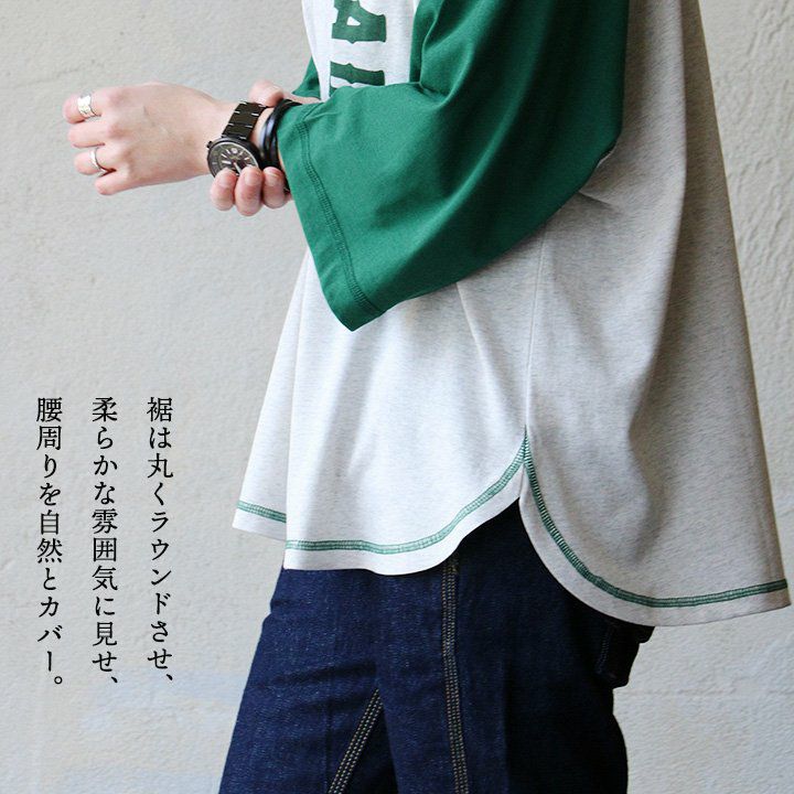 レトロ可愛い「着痩せ」ロンT。 ロングTシャツ 長袖 ワイドシルエット クルーネック 配色 リブ 切り替え 綿100% トリムTシャツ レディース トップス 無地 薄手 ワイド すっきり 着痩せ 重ね着 ドロップショルダー 落ち感 柔らかい 軽い パティ GENTIL ジャンティ