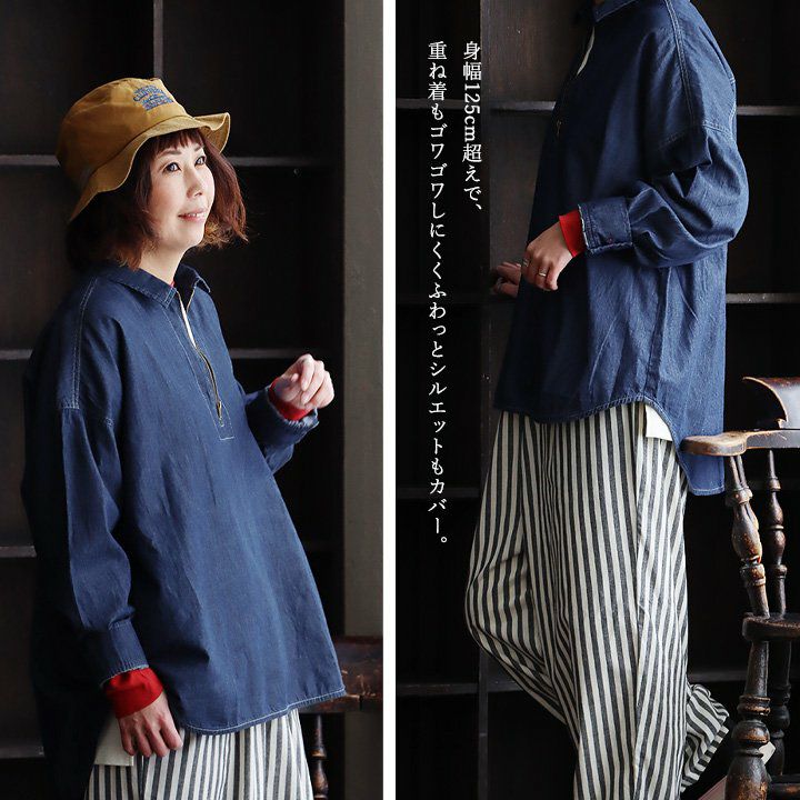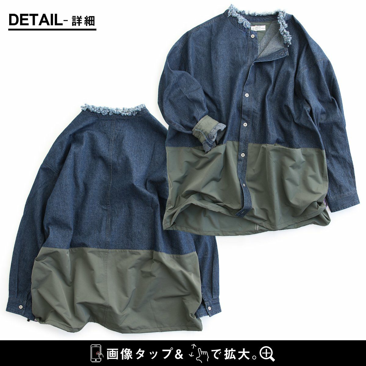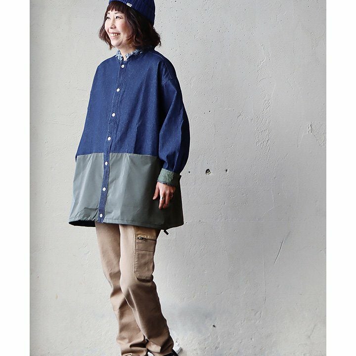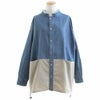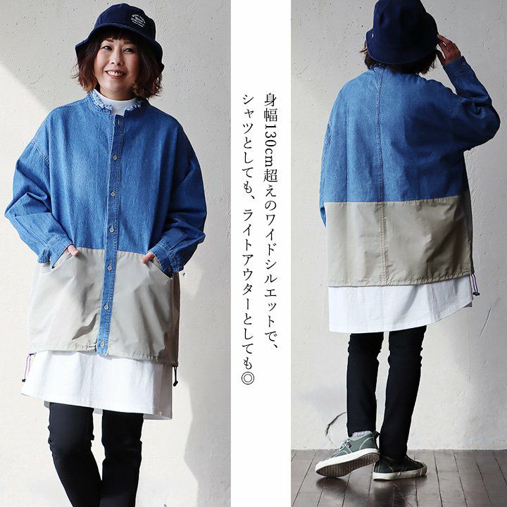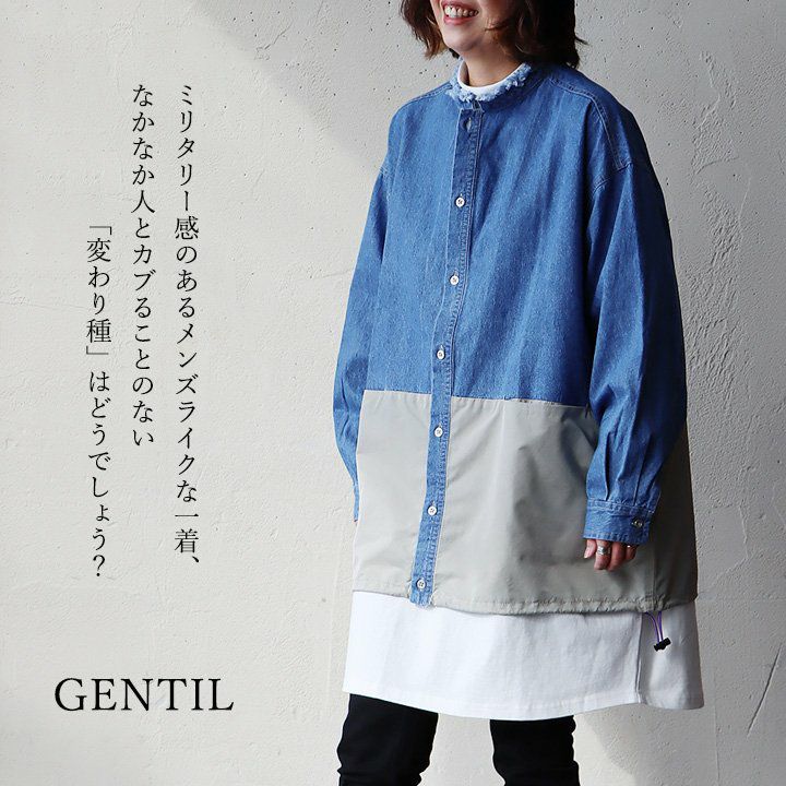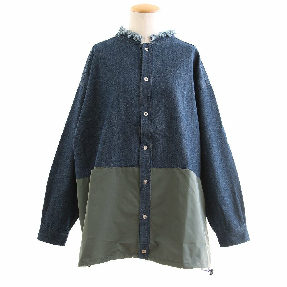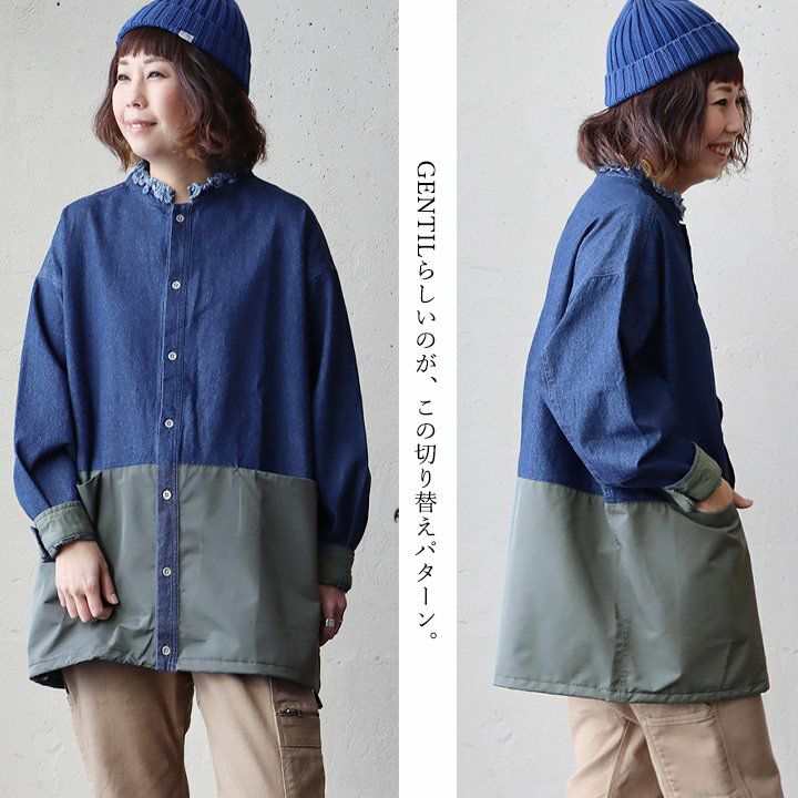 メンズライクがお好きなら、たまには「変わり種」も。 シャ ツデニムシャツ レディース ノーカラー 異素材切り替え コットン100% 綿 配色 フリンジ 大きいサイズ ゆったり 体型カバー カジュアル メンズライク PATY パティ GENTIL ジャンティ