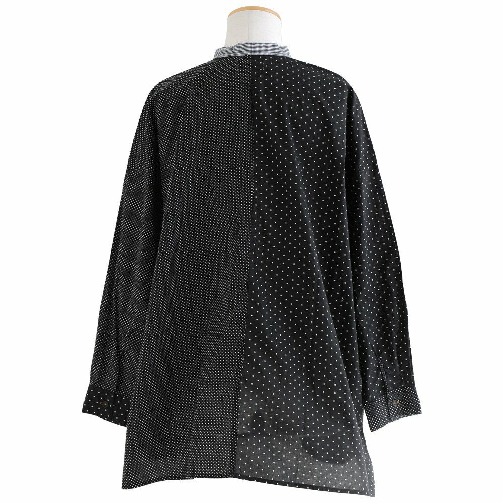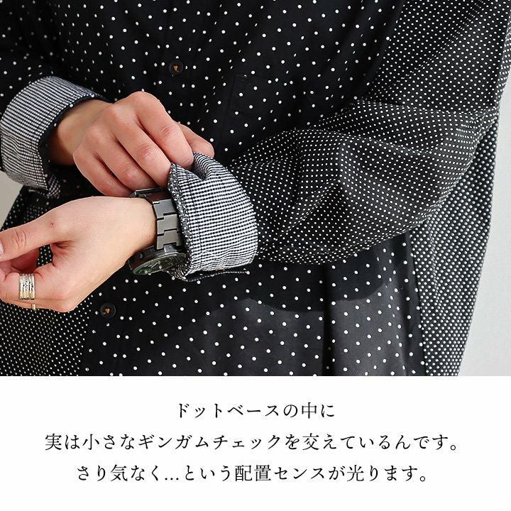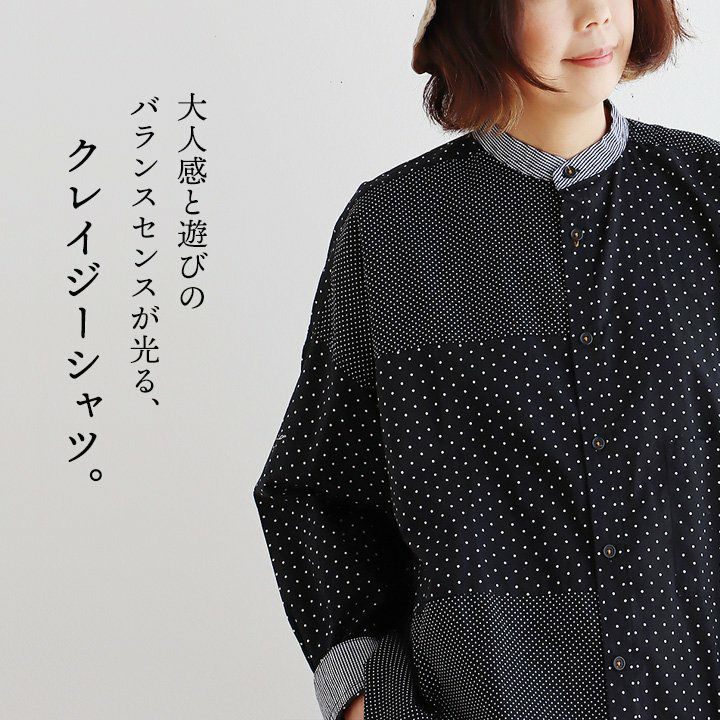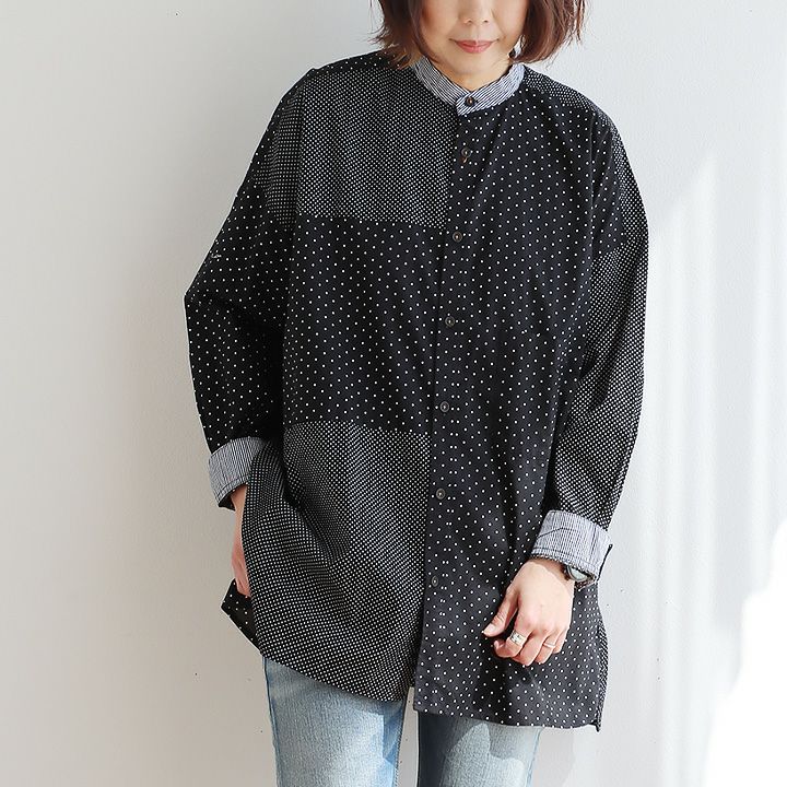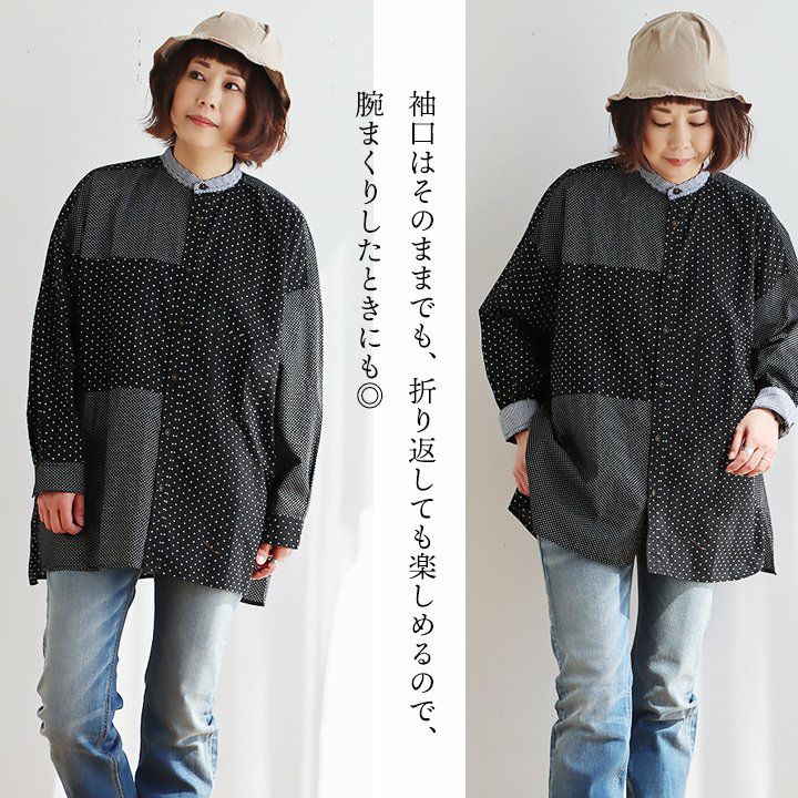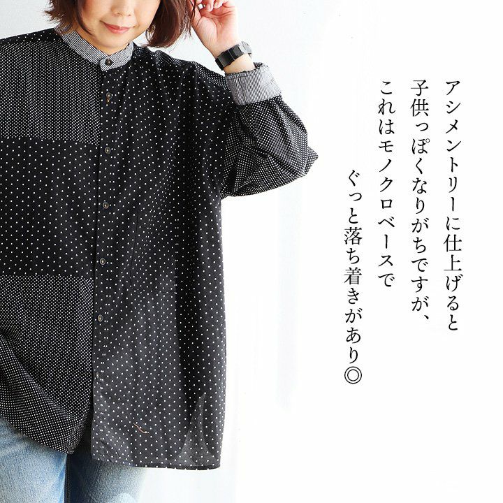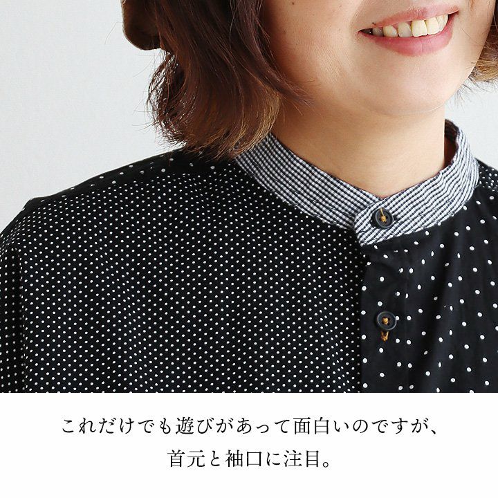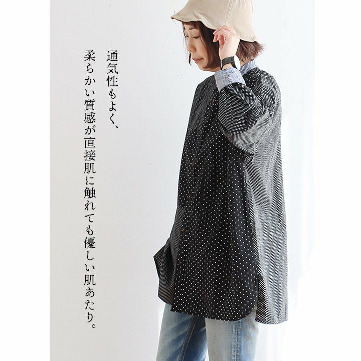 大人感と遊びのバランスセンスが光る、クレイジーシャツ。 シャツ 長袖 レディース バンドカラー ドット柄 パッチワーク ギンガムチェック 綿100% コットン 薄手 軽い 大きいサイズ ゆったり 体型カバー カジュアル 春 夏 パティ GENTIL ジャンティ