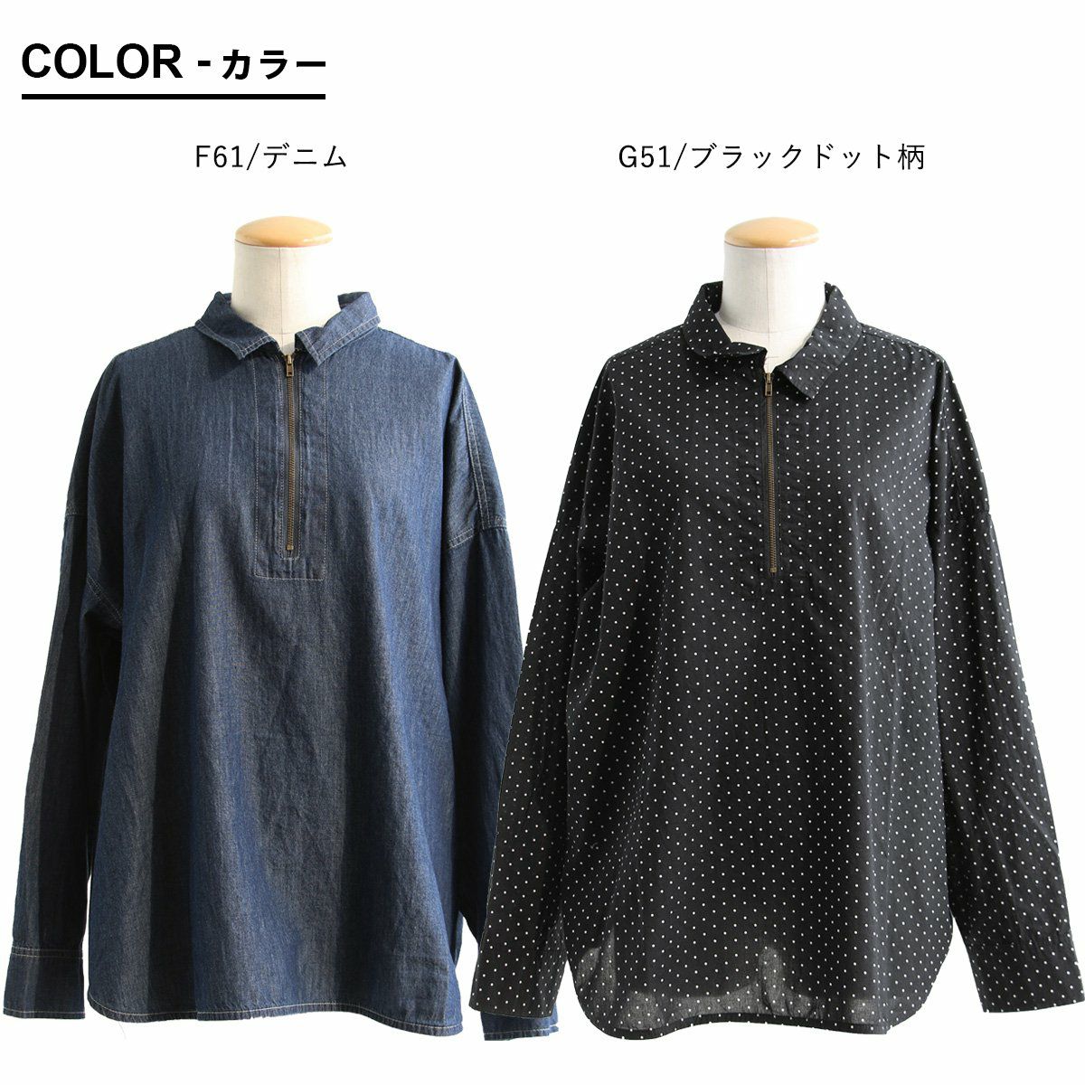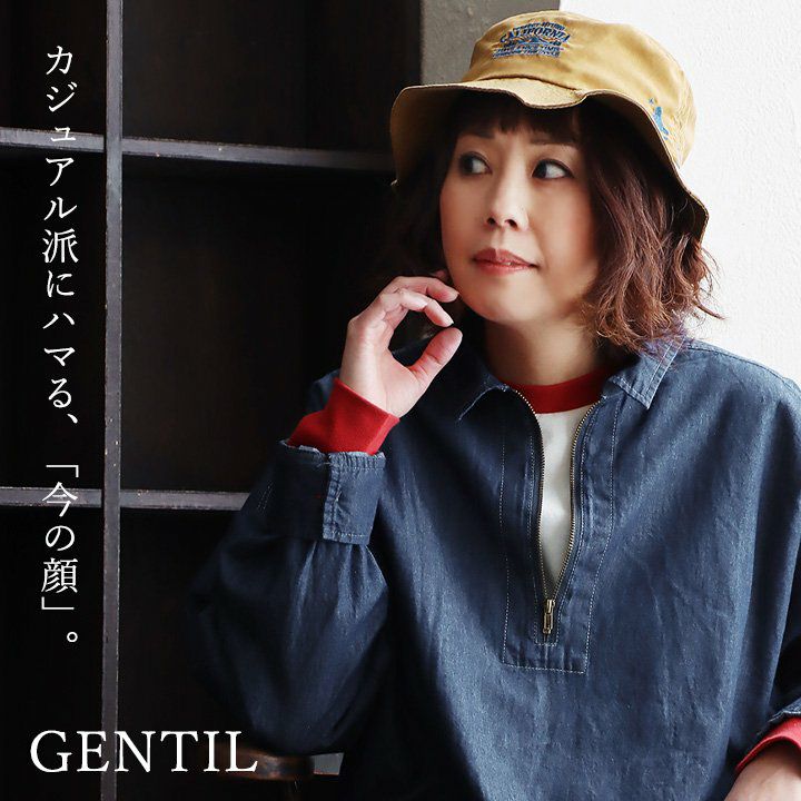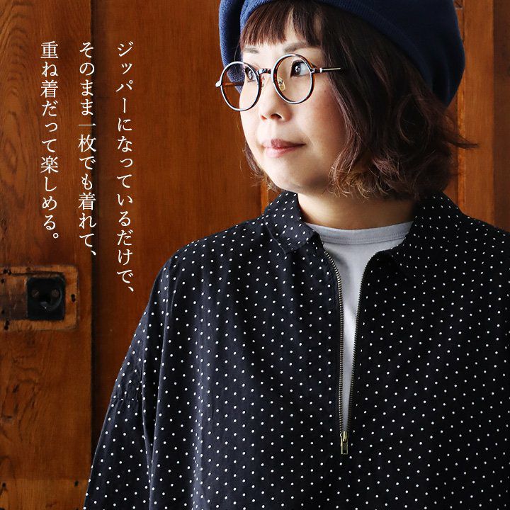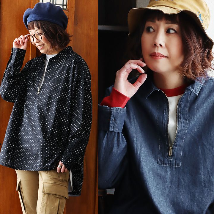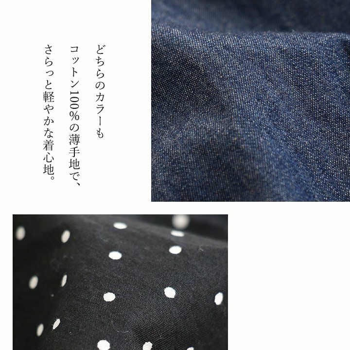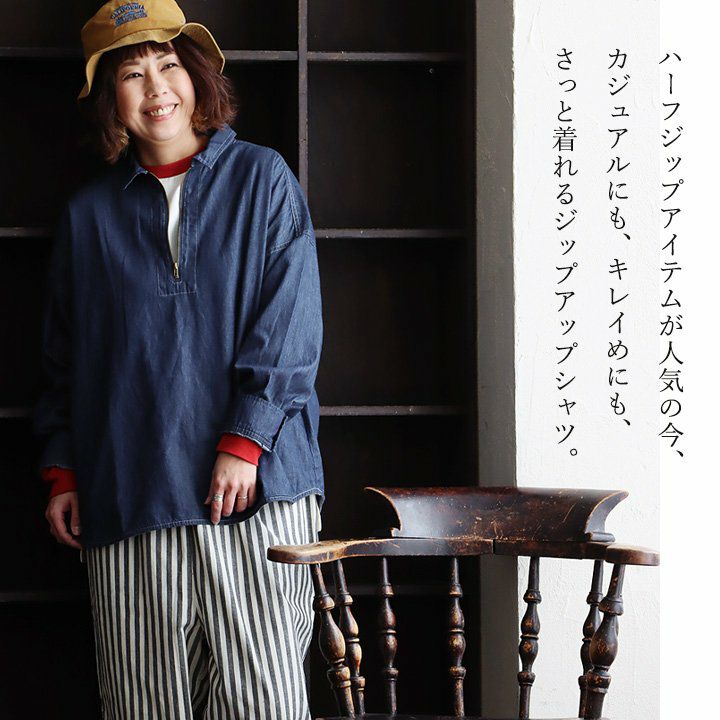 カジュアル派にハマる、「今の顔」。 デニムシャツ ジップアップシャツ デニム 長袖 レディース 重ね着 お尻隠れる デニム ドット柄 コットン100% 綿 薄手 軽い ジップ 体型カバー 大きいサイズ 着痩せ カジュアル PATY パティ GENTIL ジャンティ