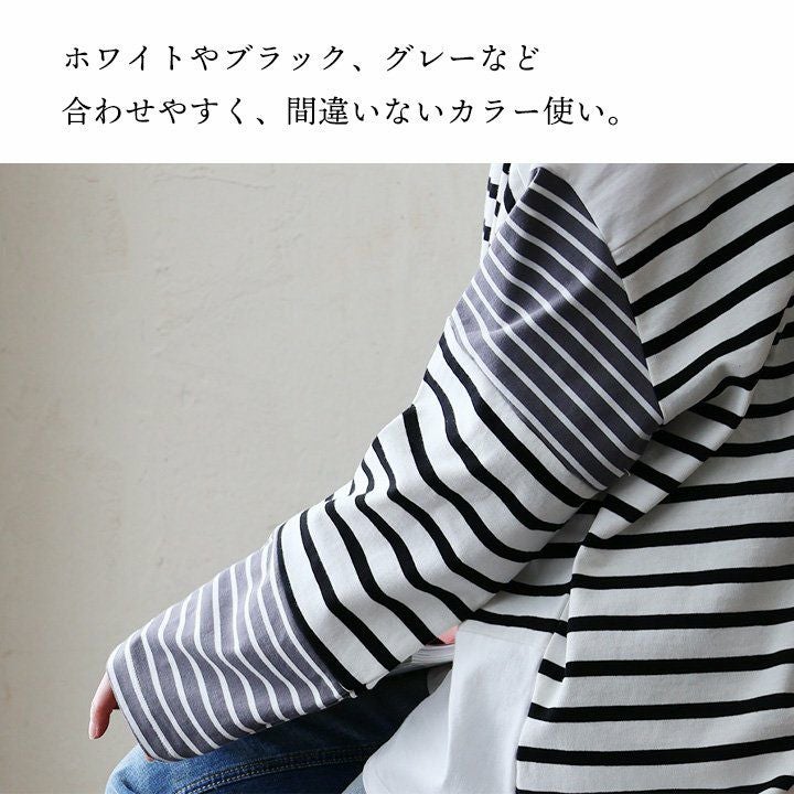 重ね着も、一枚着も「袖」で遊んみるのもイイかも。 カットソー ロンT 長袖 レディース クルーネック 袖切り替え 無地 マルチボーダー 配色 綿100% コットン 伸縮性 滑らか しっかり生地 重ね着 春 春服 カジュアル パティ GENTIL ジャンティ