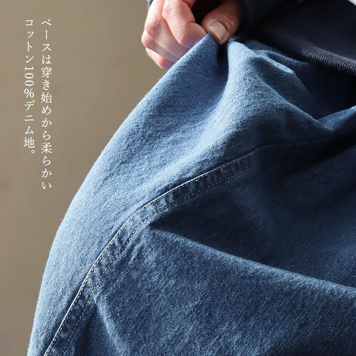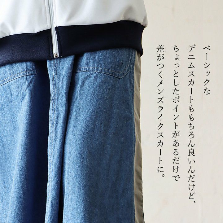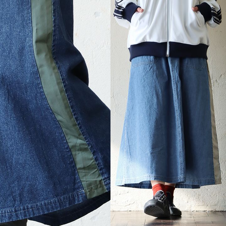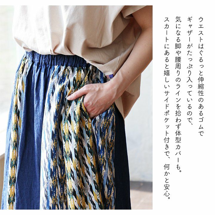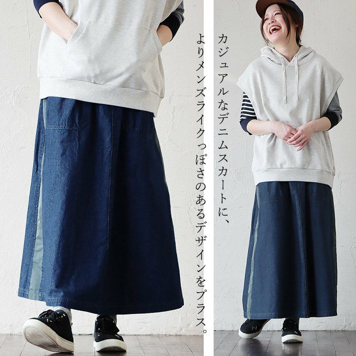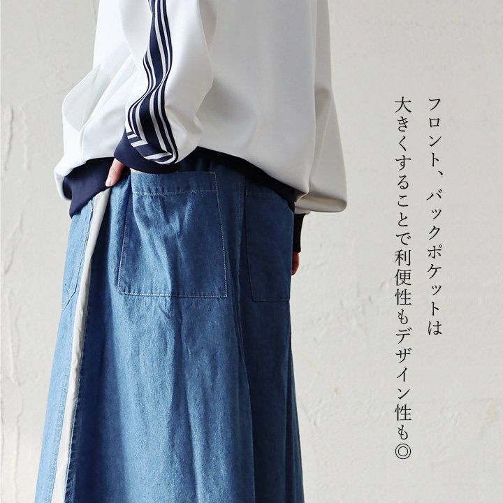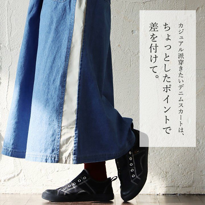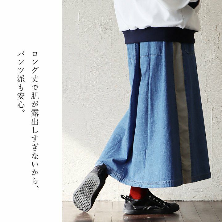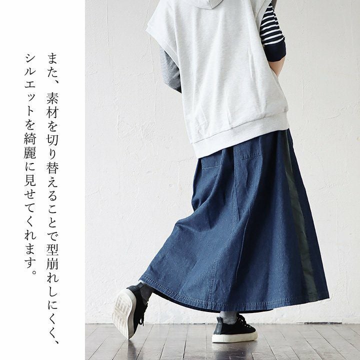 カジュアル派穿きたいデニムスカートは、ちょっとしたポイントで差を付けて。 スカート ロング丈 フレア レディース デニム コットン100% 綿 しっかり生地 異素材切り替え ウエストゴム 紐付き ポケット ゆったり 体型カバー 大きいサイズ カジュアル メンズライク PATY パティ GENTIL ジャンティ
