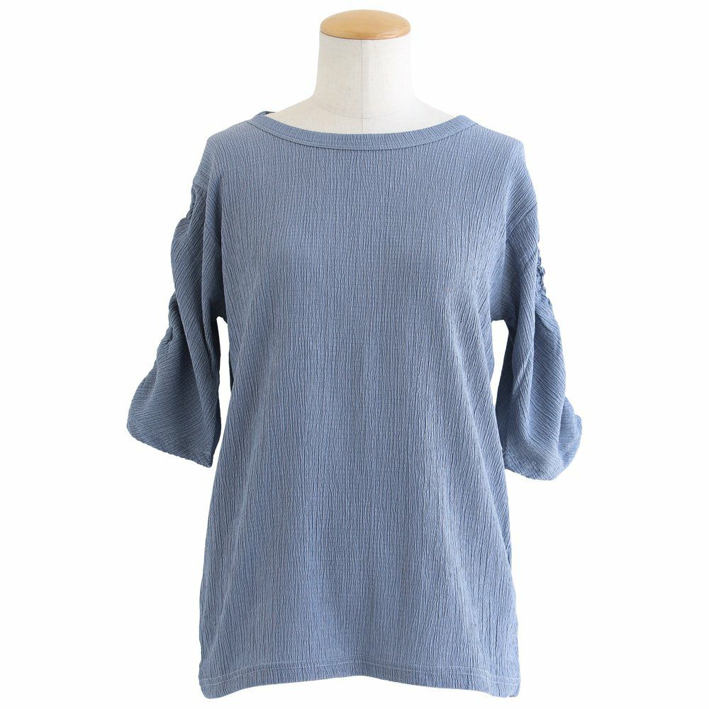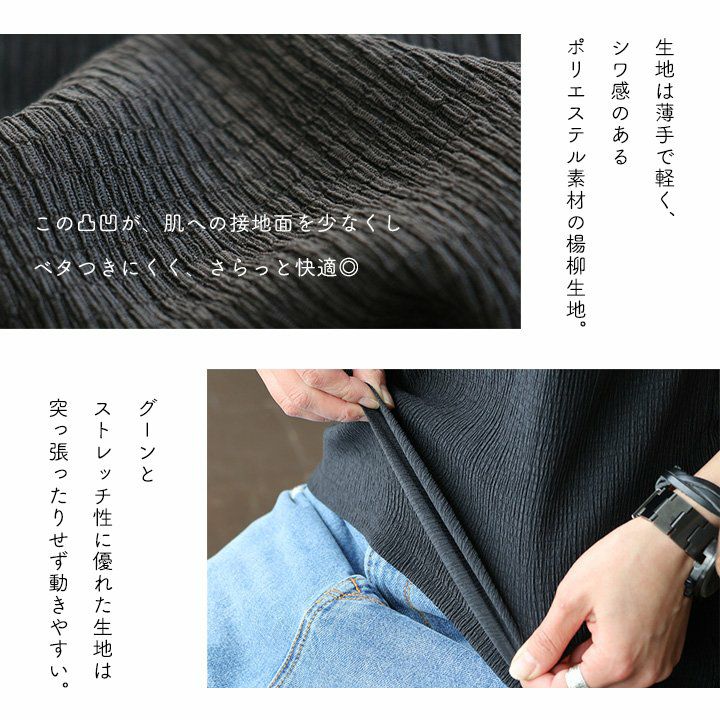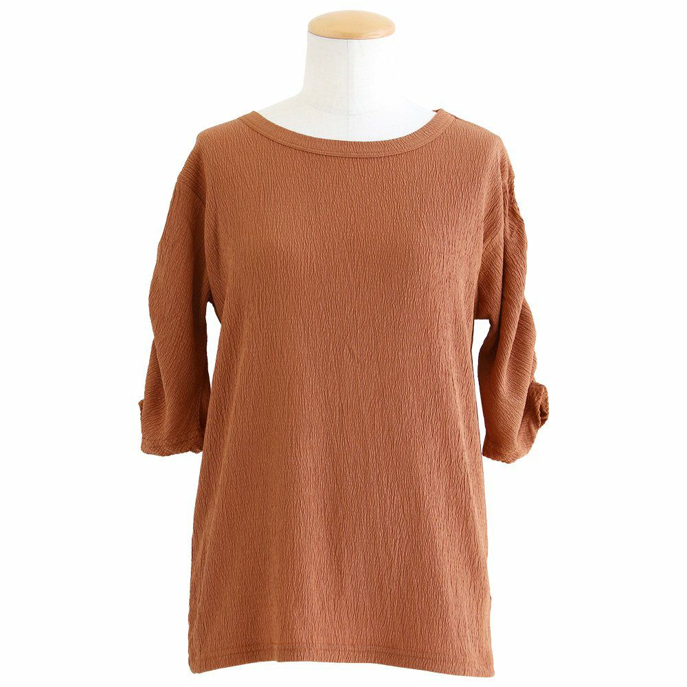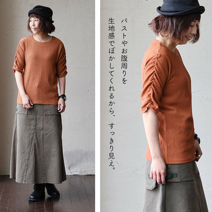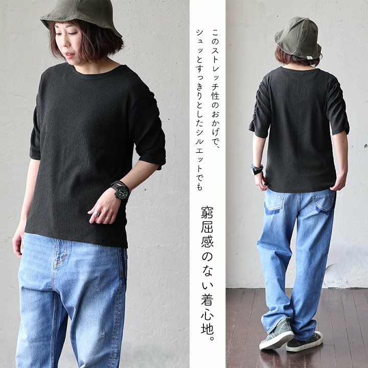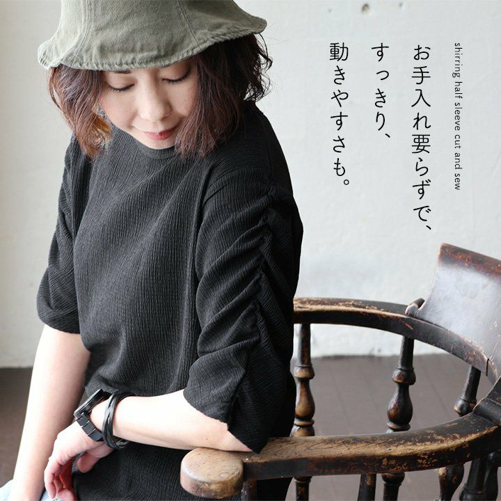 お手入れ要らずで、すっきり、動きやすさも。 トップス カットソー 5分袖 クルーネック すっきり 着痩せ 袖シャーリング 二の腕カバー ストレッチ 動きやすい ポリエステル 薄手 楊柳 大人カジュアル パティ le colis ルコリ