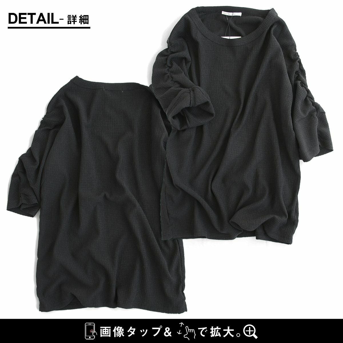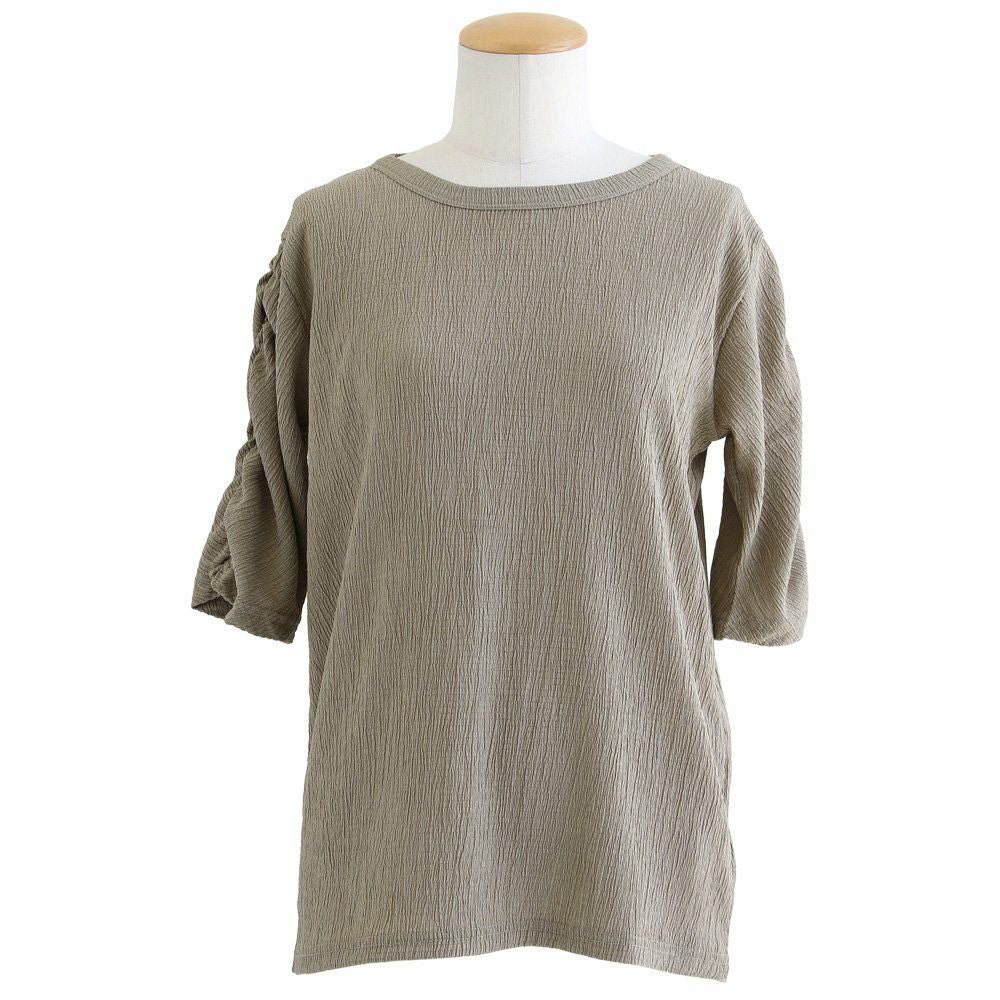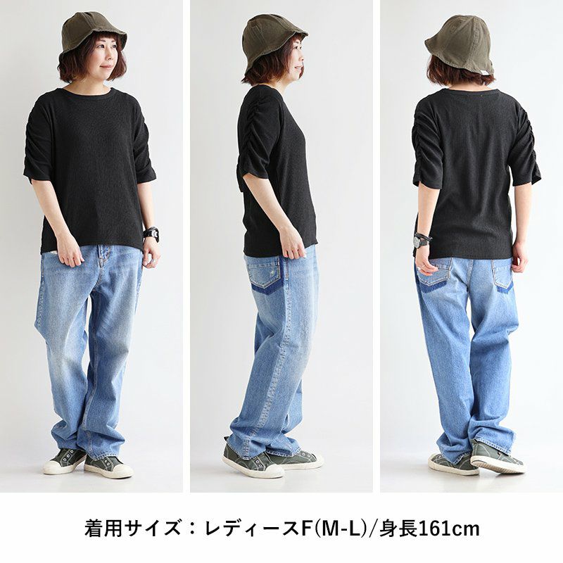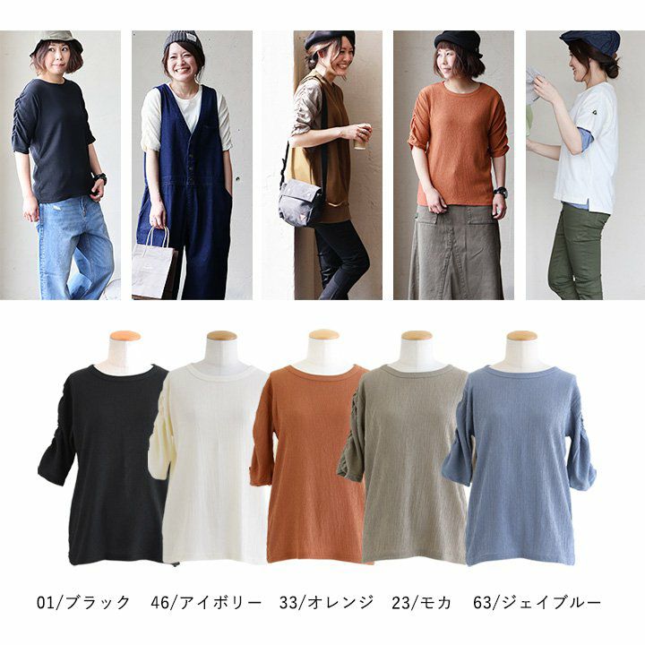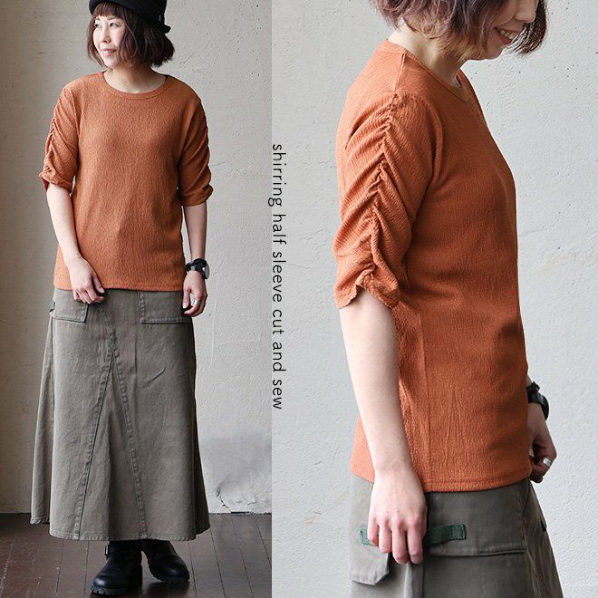 お手入れ要らずで、すっきり、動きやすさも。 トップス カットソー 5分袖 クルーネック すっきり 着痩せ 袖シャーリング 二の腕カバー ストレッチ 動きやすい ポリエステル 薄手 楊柳 大人カジュアル パティ le colis ルコリ