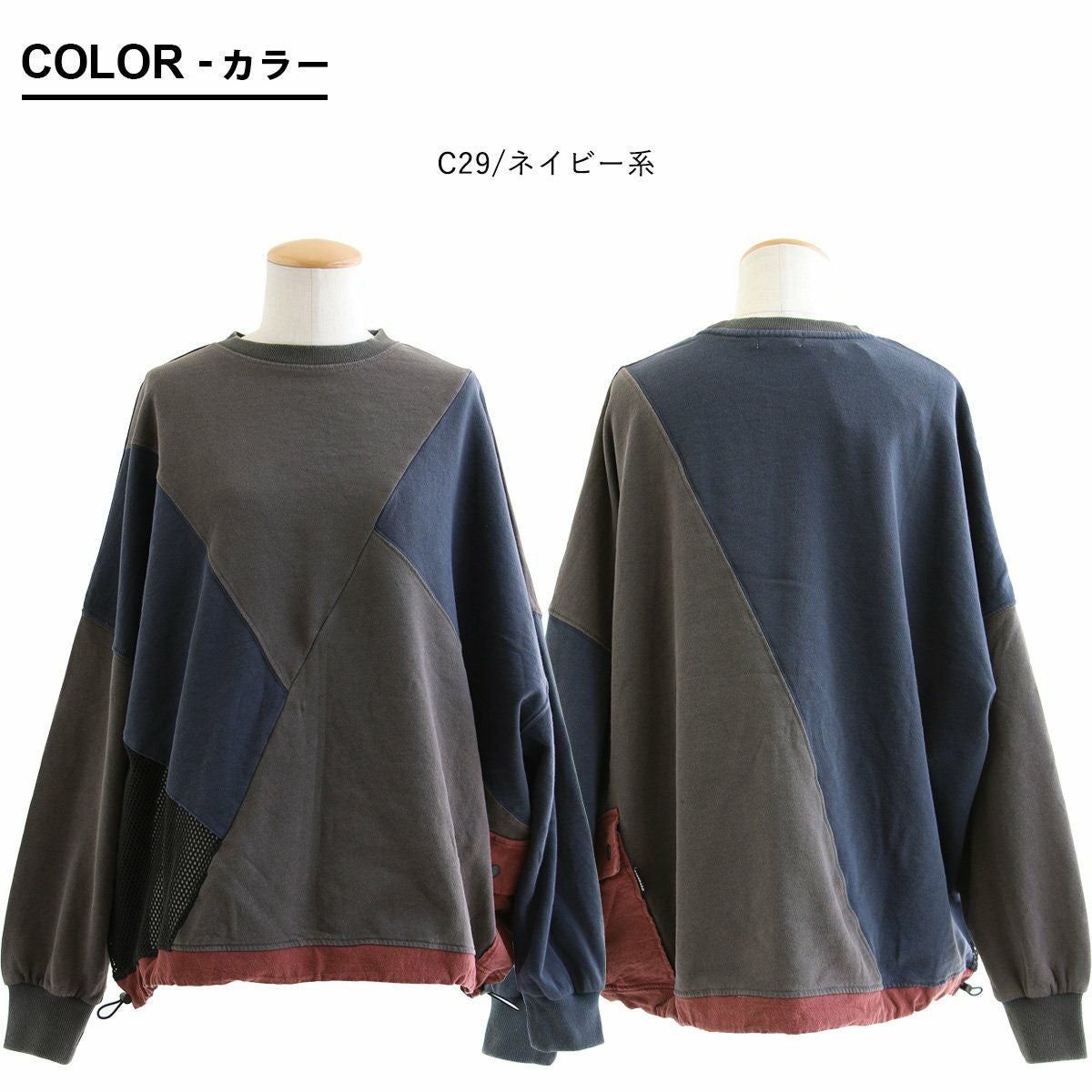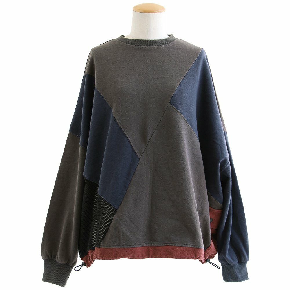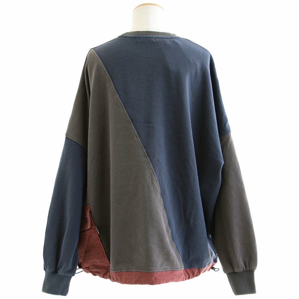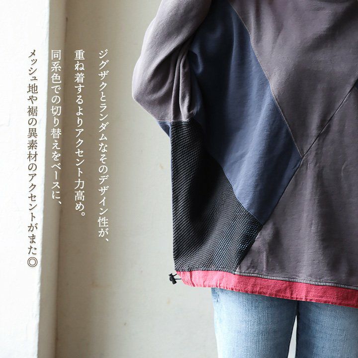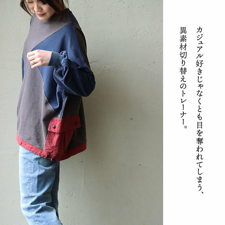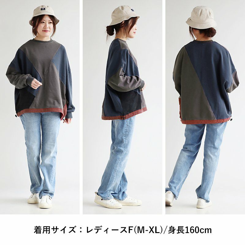 「ダボっとジグザク」がお気に入り。 スウェット トレーナー 長袖 レディース クルーネック 配色 異素材切り替え 綿100% コットン 裏毛 布帛 メッシュ ポケット ロックコード ゆったり 大きいサイズ 体型カバー カジュアル パティ GENTIL ジャンティ