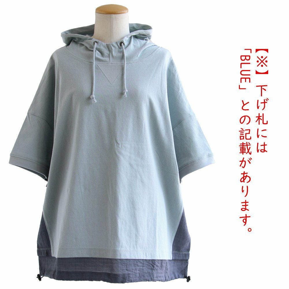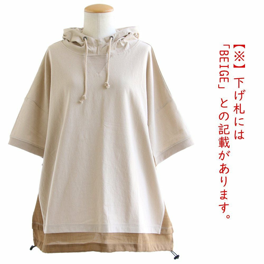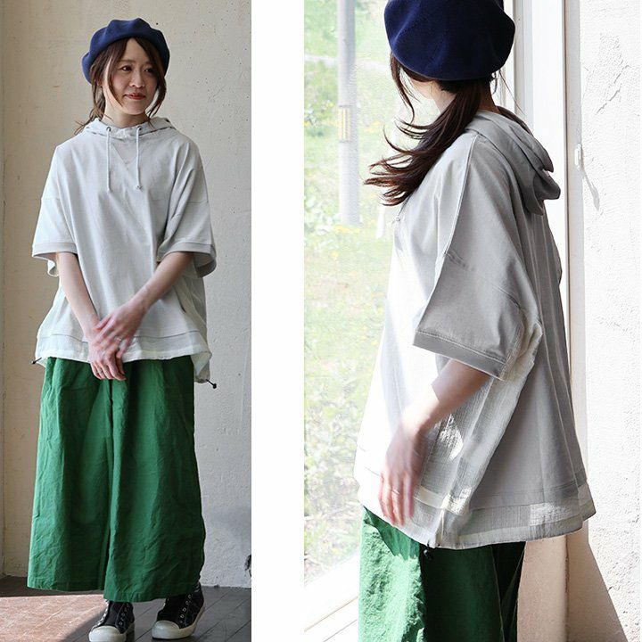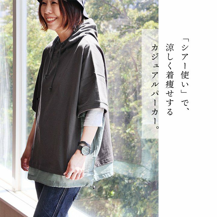 「シアー使い」で、涼しく着痩せするカジュアルパーカー。 【メール便50】 パーカー 半袖 プルオーバー レディース 着痩せ 綿100% コットン 配色 異素材 伸縮性 しっかり生地 体型カバー 大きいサイズ ゆったり カジュアル メンズライク 夏 パティ GENTIL ジャンティ
