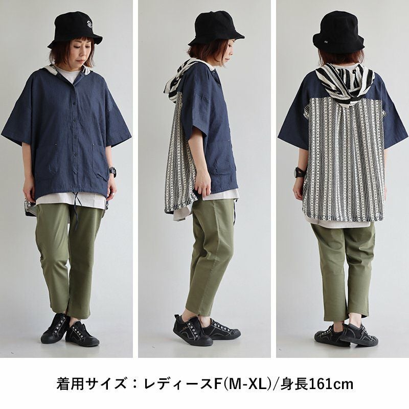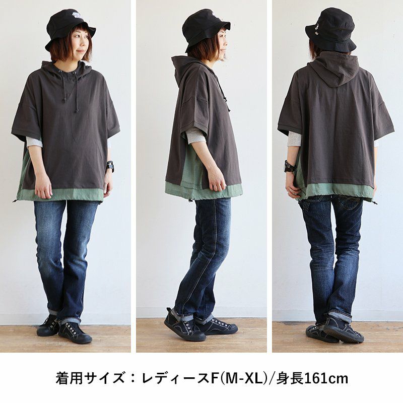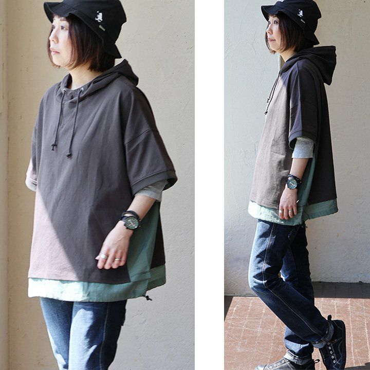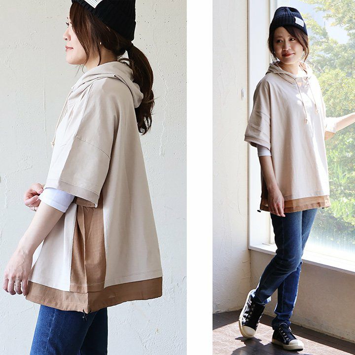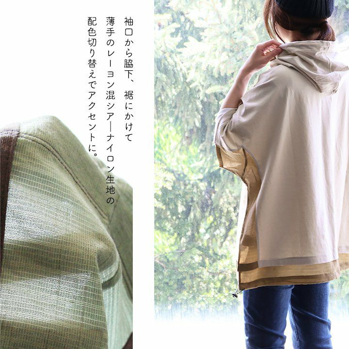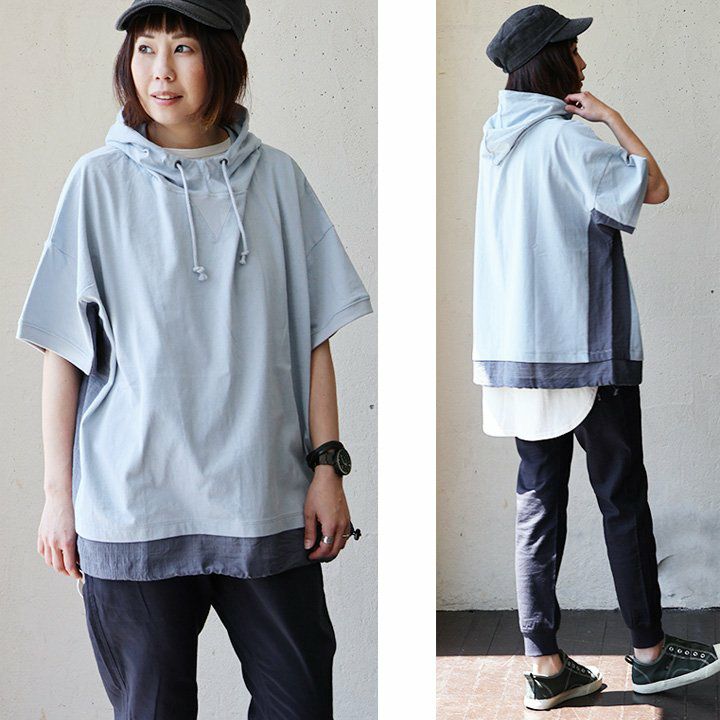 「シアー使い」で、涼しく着痩せするカジュアルパーカー。 【メール便50】 パーカー 半袖 プルオーバー レディース 着痩せ 綿100% コットン 配色 異素材 伸縮性 しっかり生地 体型カバー 大きいサイズ ゆったり カジュアル メンズライク 夏 パティ GENTIL ジャンティ