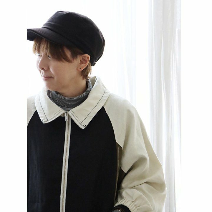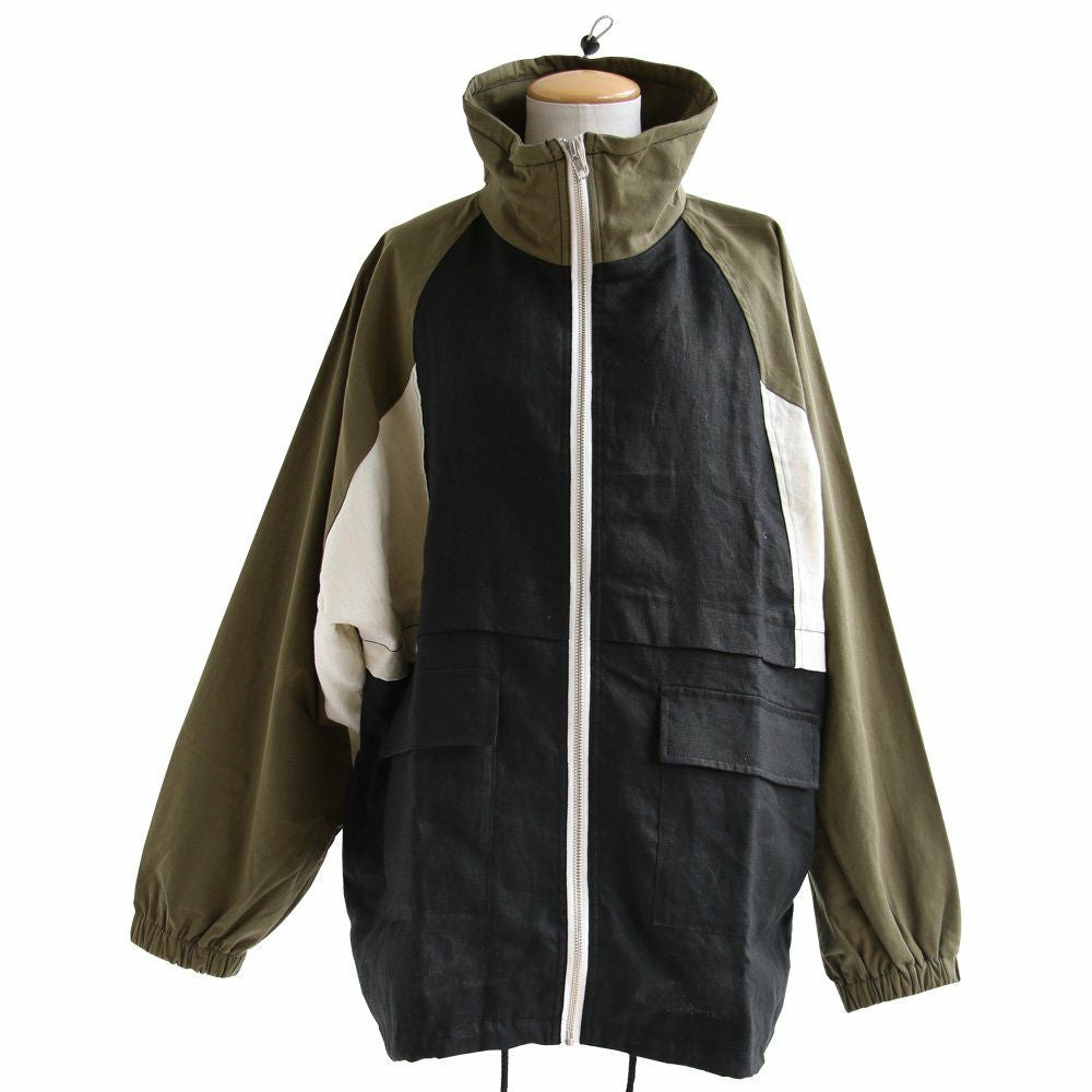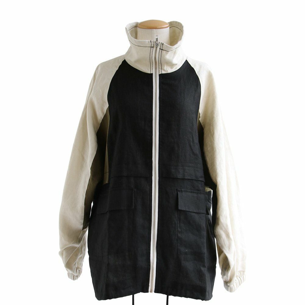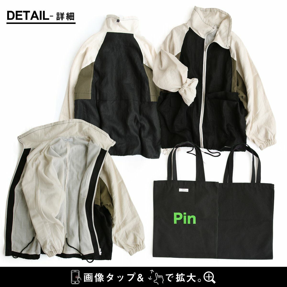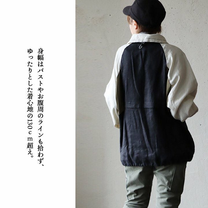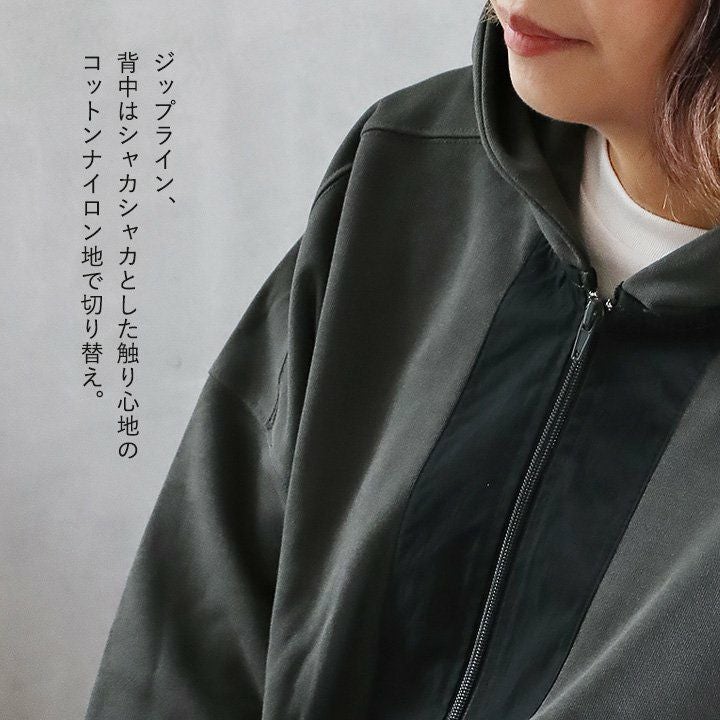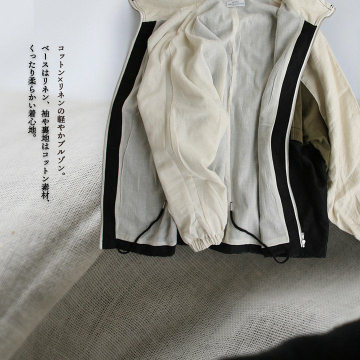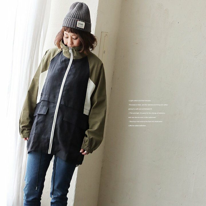 このくらいの軽やかさが羽織りやすくて、丁度良い。 ブルゾン 長袖 レディース 配色切り替え コットン リネン スタンドネック 薄手 ポケット付き ゆったり 大きいサイズ エコバッグ付き カジュアル メンズライク PATY GENTIL ジャンティ