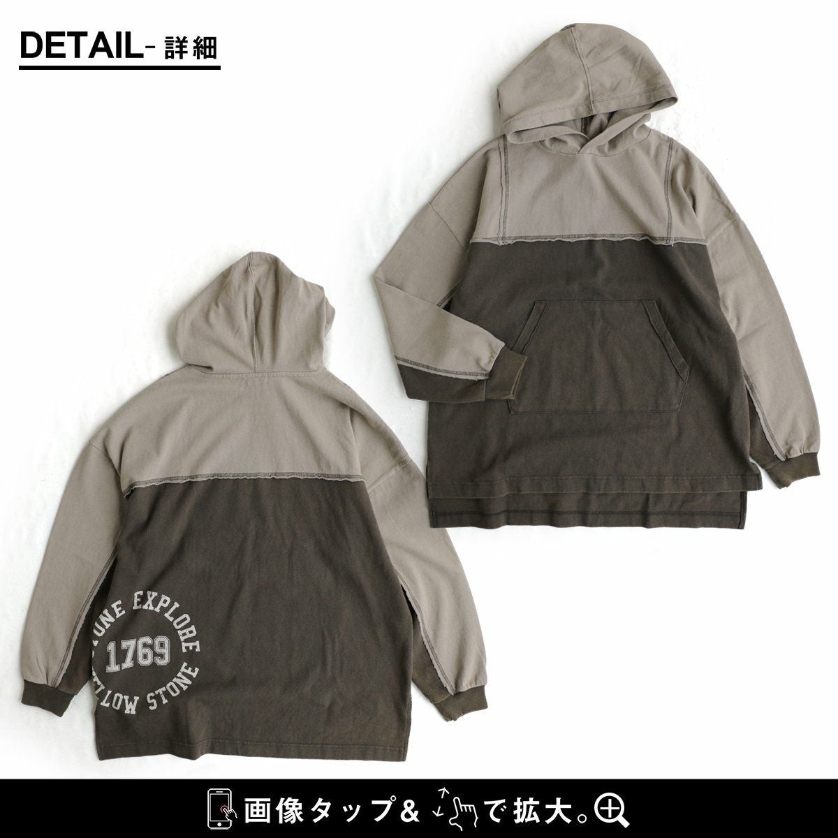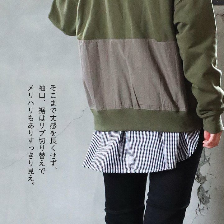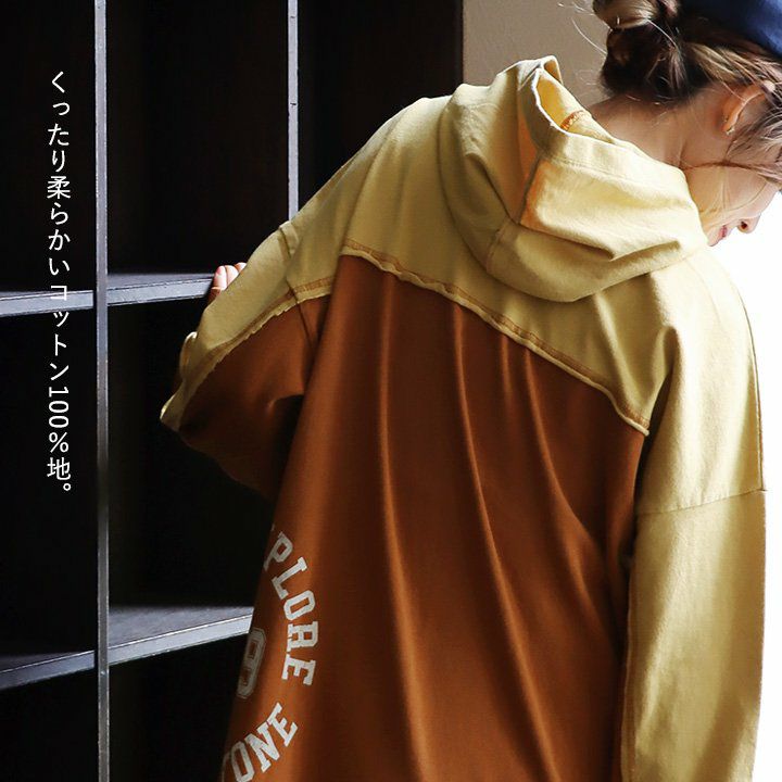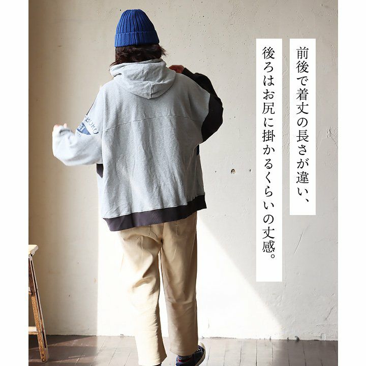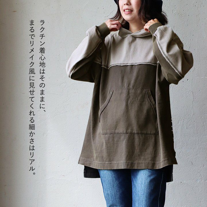細かさがリアル。 チュニック パーカー 長袖 レディース 着痩せ お尻隠れる ワイドシルエット リメイク風 配色切り替え ステッチ バックプリント 綿100% コットン 裏毛 カジュアル メンズライク GENTIL ジャンティ