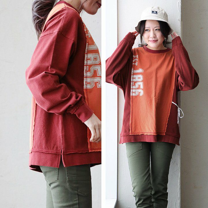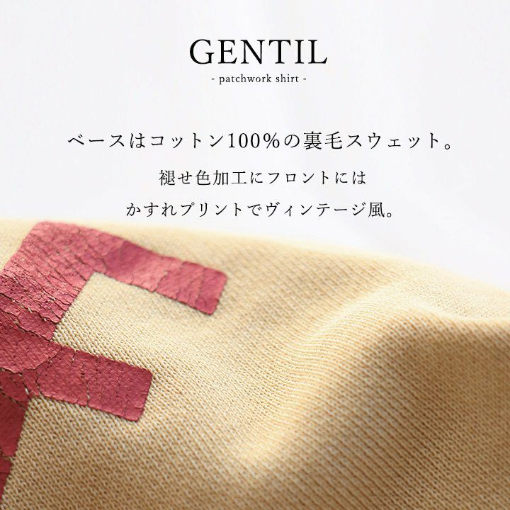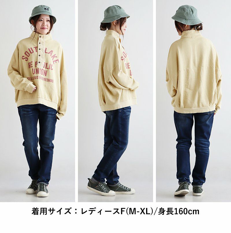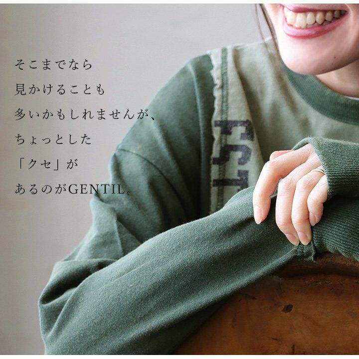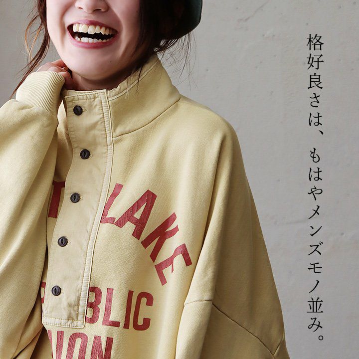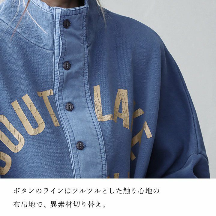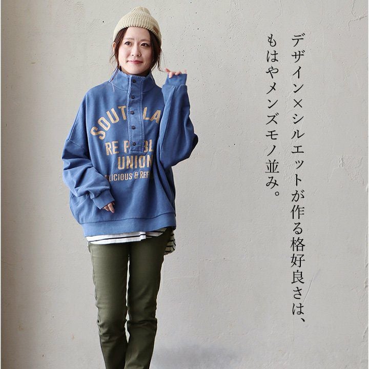 格好良さは、もはやメンズモノ並み。 スウェット プルオーバー レディース ヘンリーネック ハイネック 異素材切り替え コットン 綿100 褪せ色 ピグメント ロゴプリント ゆったり 大きいサイズ ゆったり 体型カバー カジュアル メンズライク PATY パティ GENTIL ジャンティ