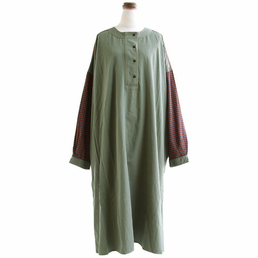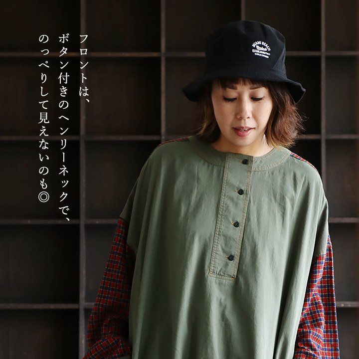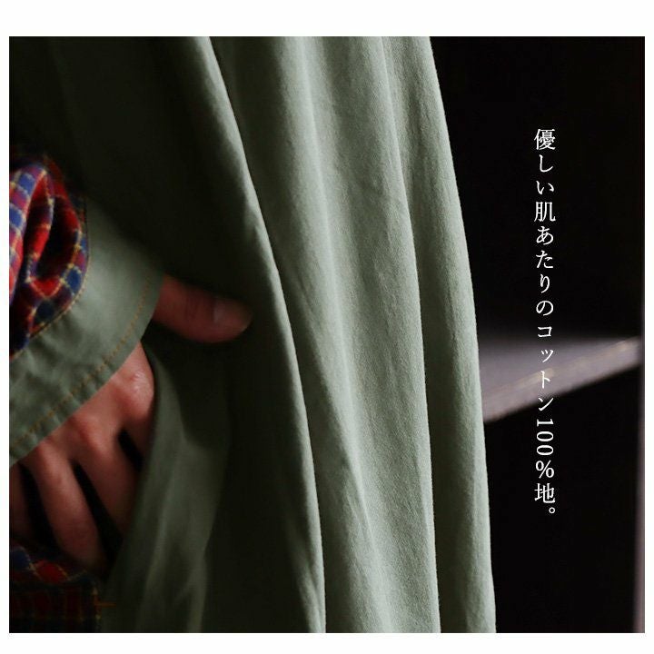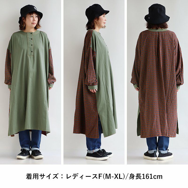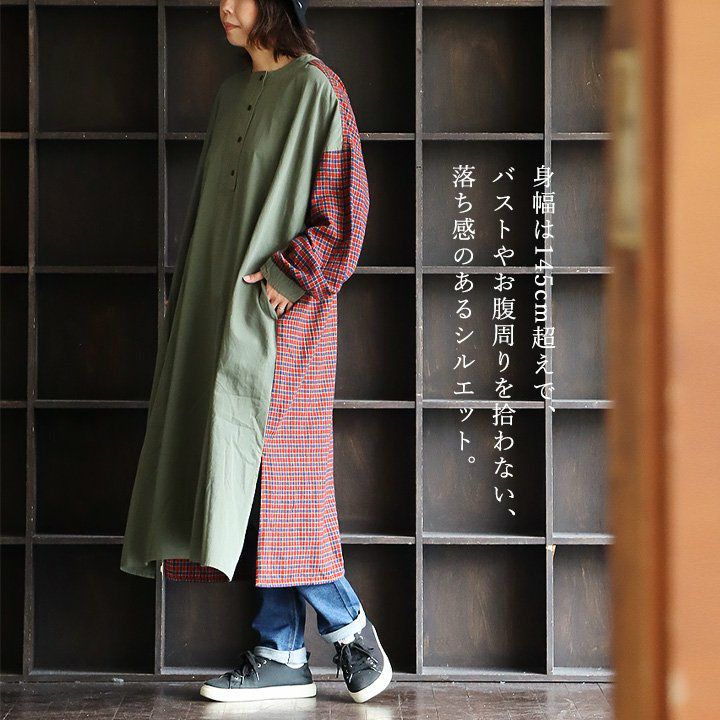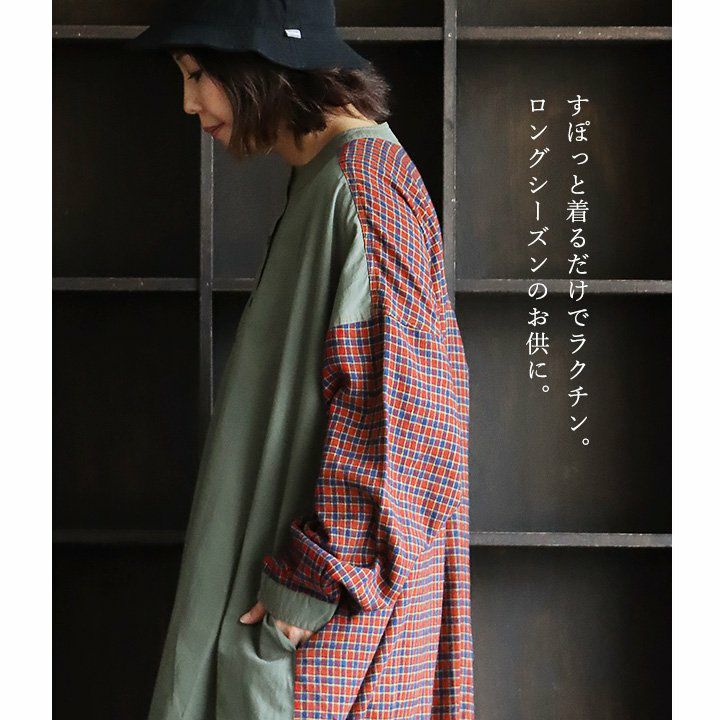 大胆っぷりに惹かれます。 ワンピース ワンピ レディース お尻隠れる ヘンリーネック ミリタリー チェック 切り替え 綿100% コットン 体型カバー ゆったり カジュアル GENTIL ジャンティ