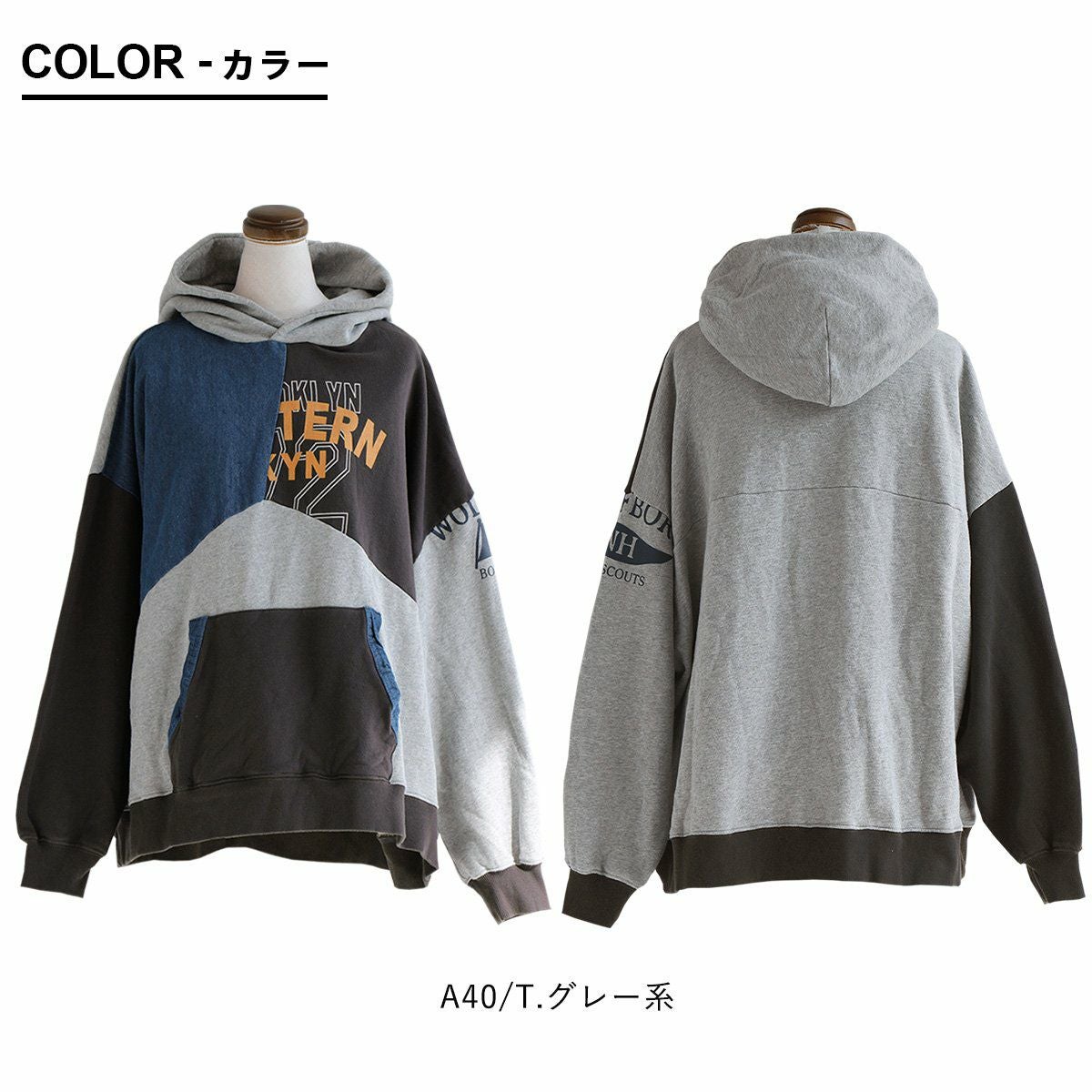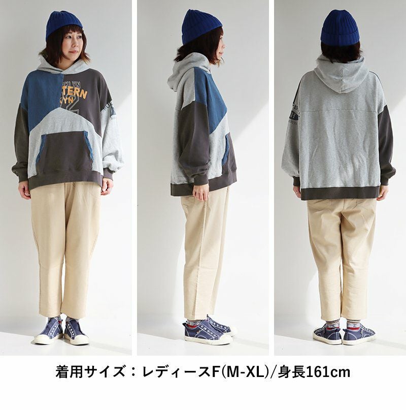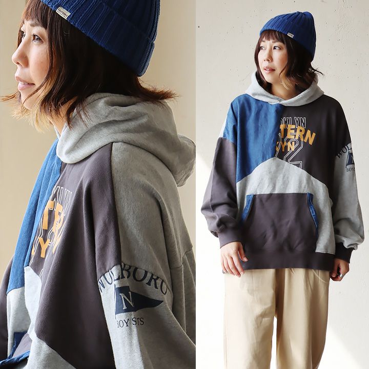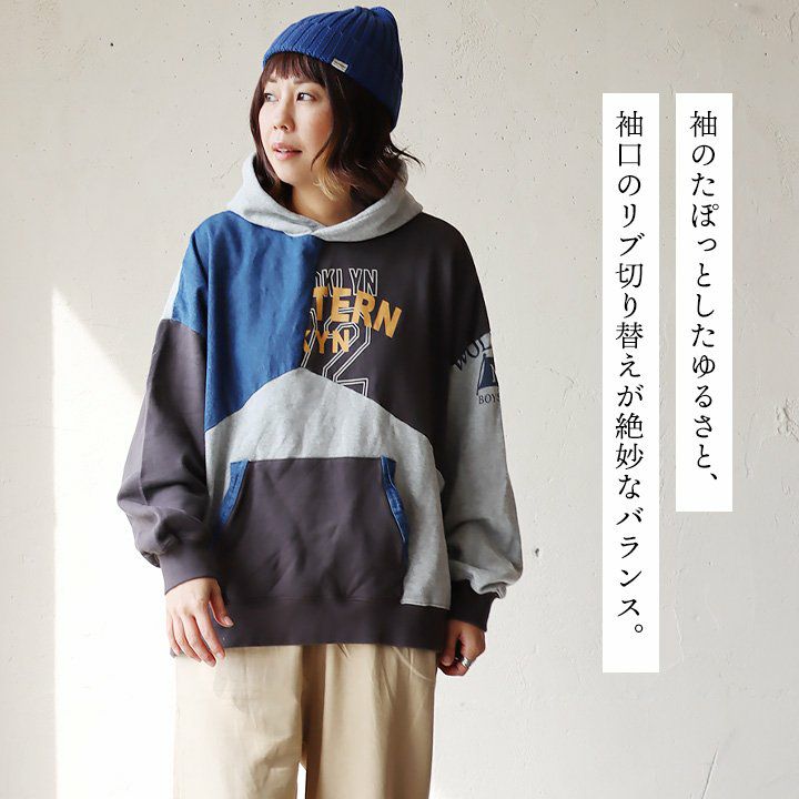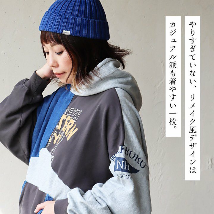 このくらいのリメイク感なら。 パーカー プルオーバー 長袖 レディース 配色切り替え デニム ロゴ 綿100% コットン ミニ裏毛 伸縮性 ゆったり 大きいサイズ 秋 冬 カジュアル GENTIL ジャンティ