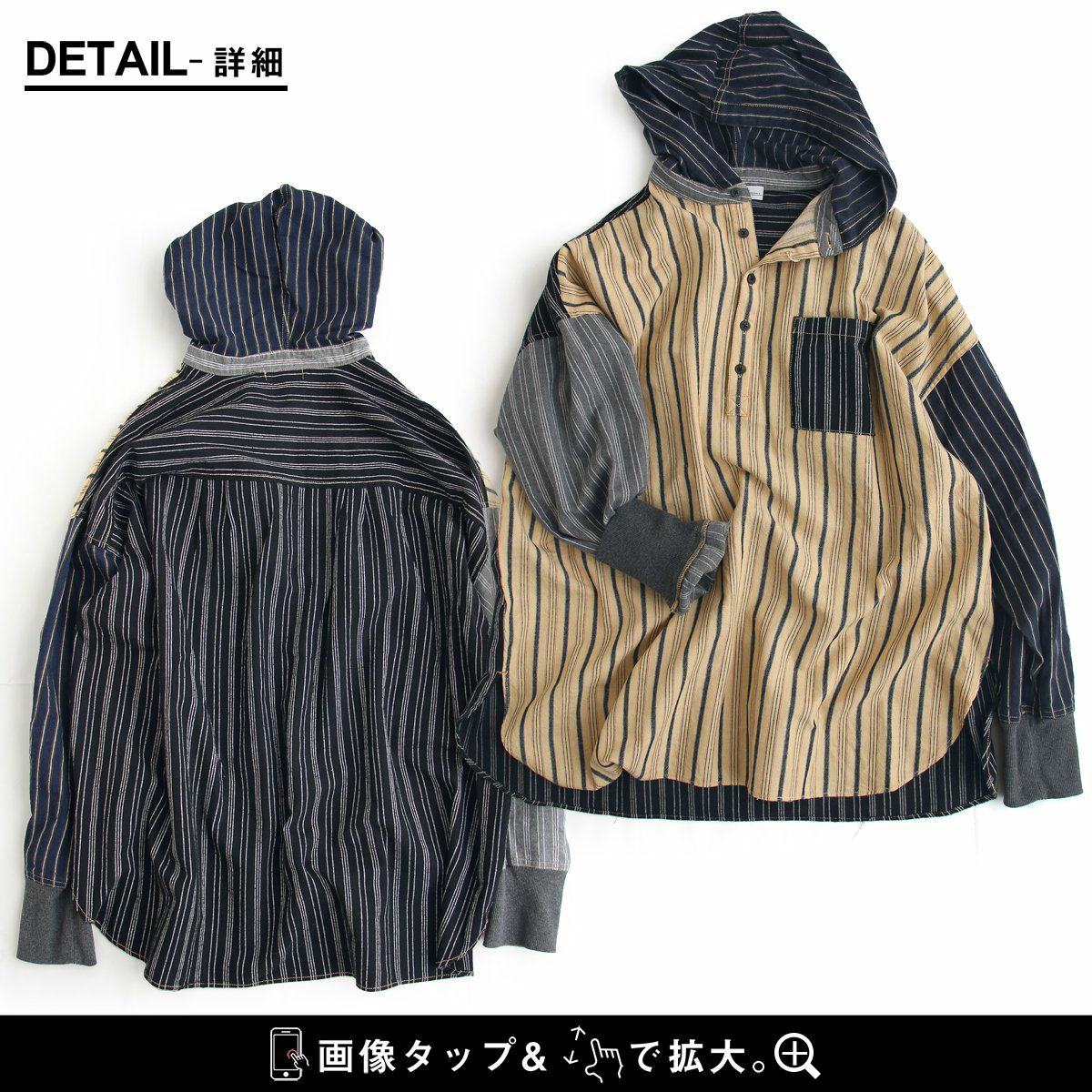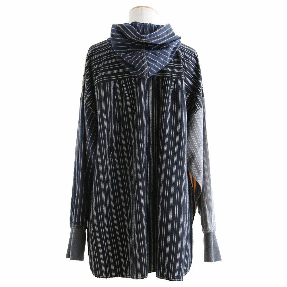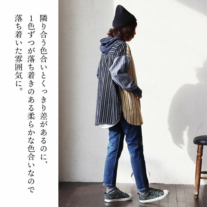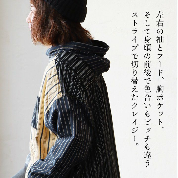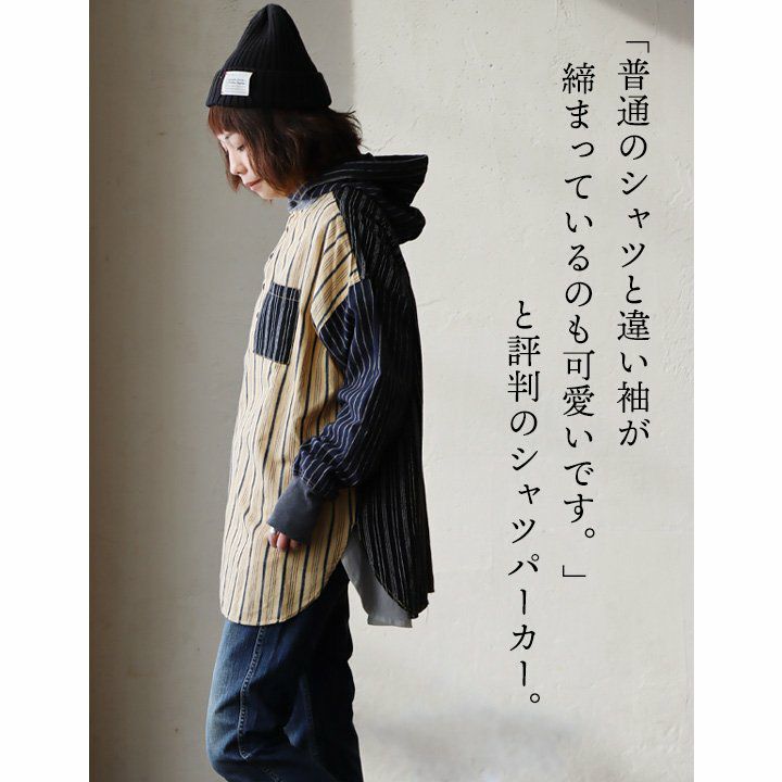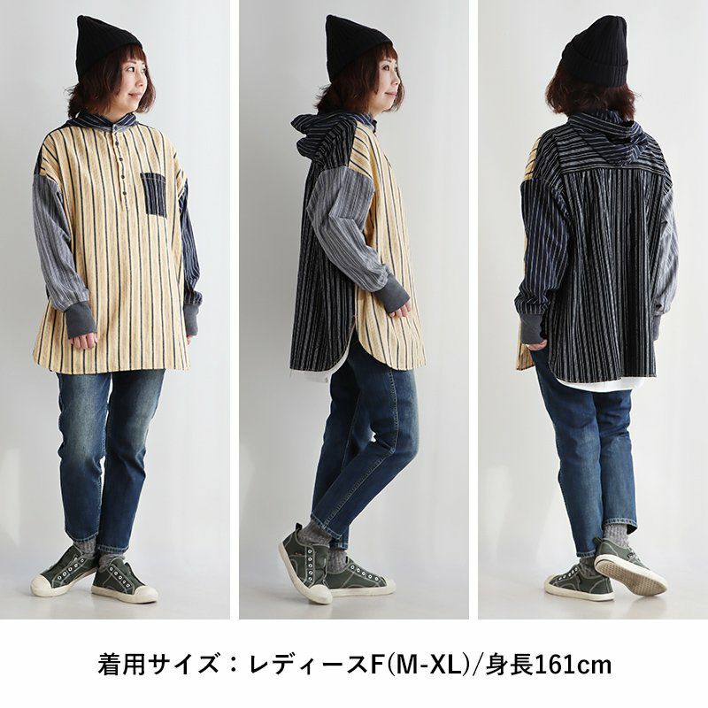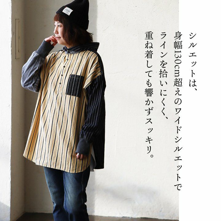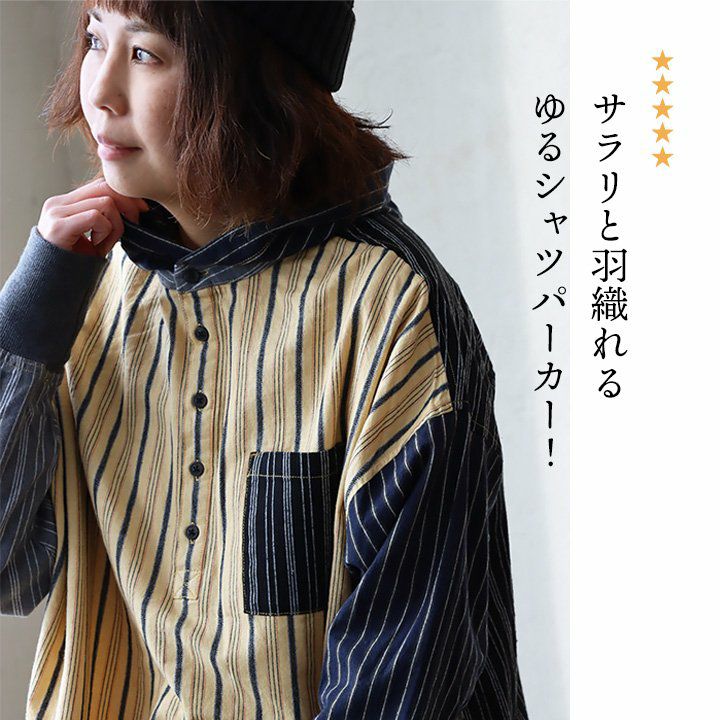 ★★★★★ サラリと羽織れるゆるシャツパーカー! パーカー プルオーバーパーカー シャツパーカー シャツ レディース 長袖 ヘンリーネック ストライプ クレイジー お尻 隠れる ロング丈 ワイド すっきり 着痩せ 重ね着 ドロップショルダー 落ち感 柔らかい 軽い GENTIL ジャンティ