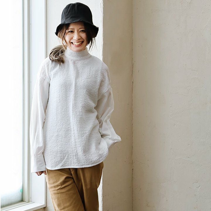 ひと際異彩を放つ、この「ひと癖」がいいんです。 シャツ 長袖 レディース 変形ネック ハイネック タートル 連ボタン お尻隠れる 綿100% 通気性 丈夫 薄手 しっかり生地 大きいサイズ ゆったり 体型カバー 春 春服 カジュアル メンズライク パティ SAIL×GENTIL セイル×ジャンティ