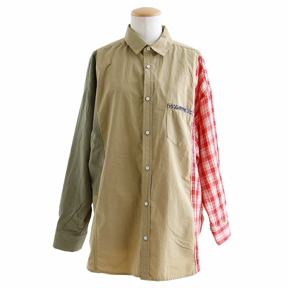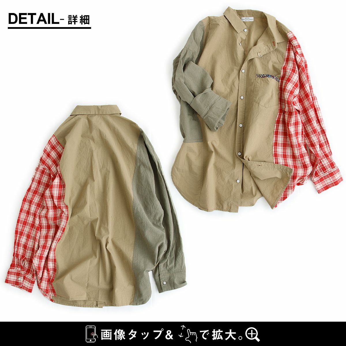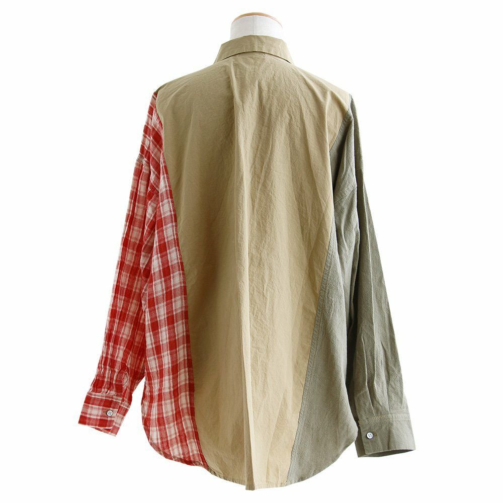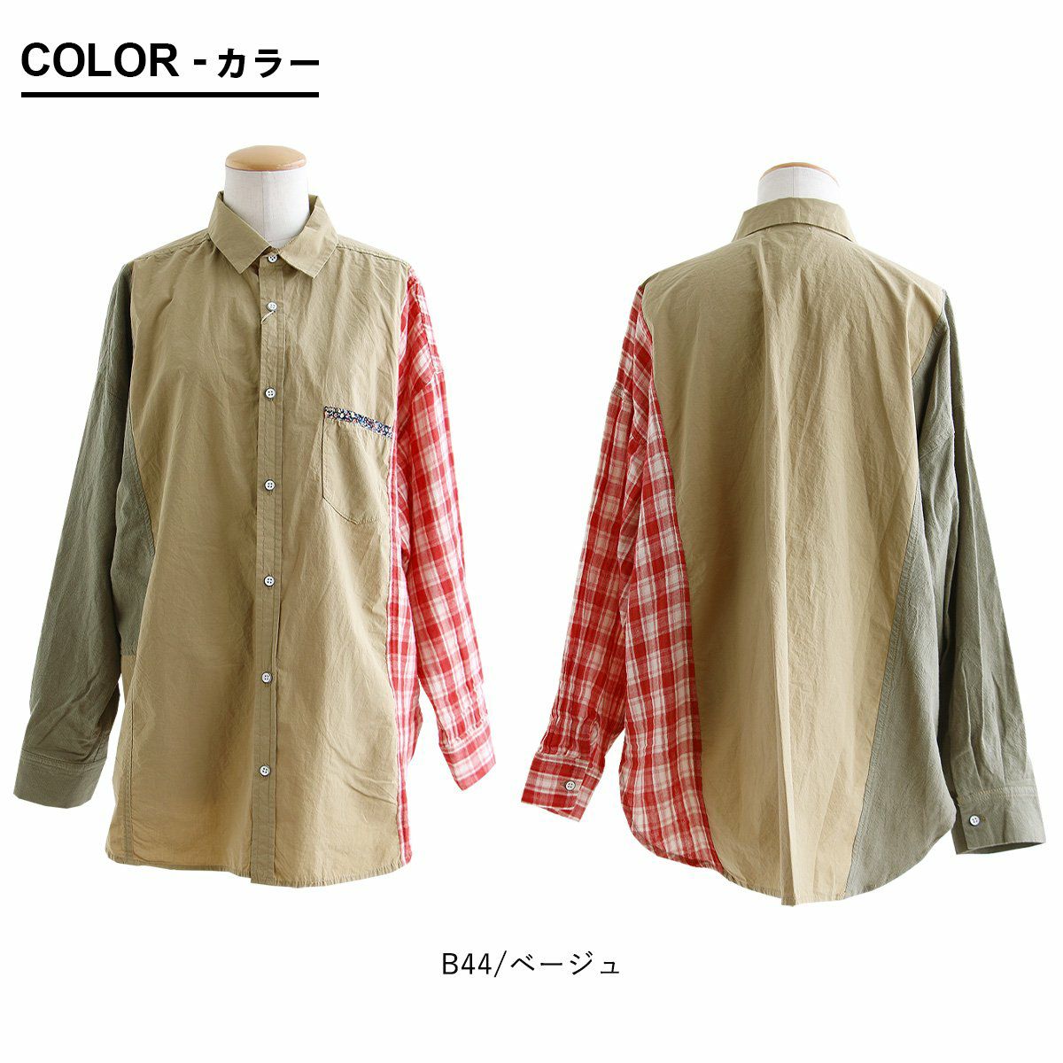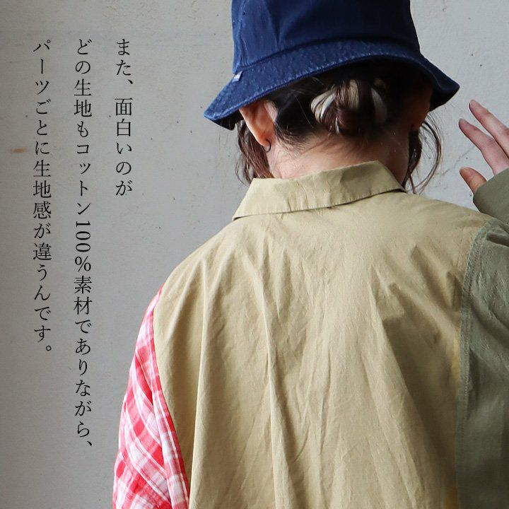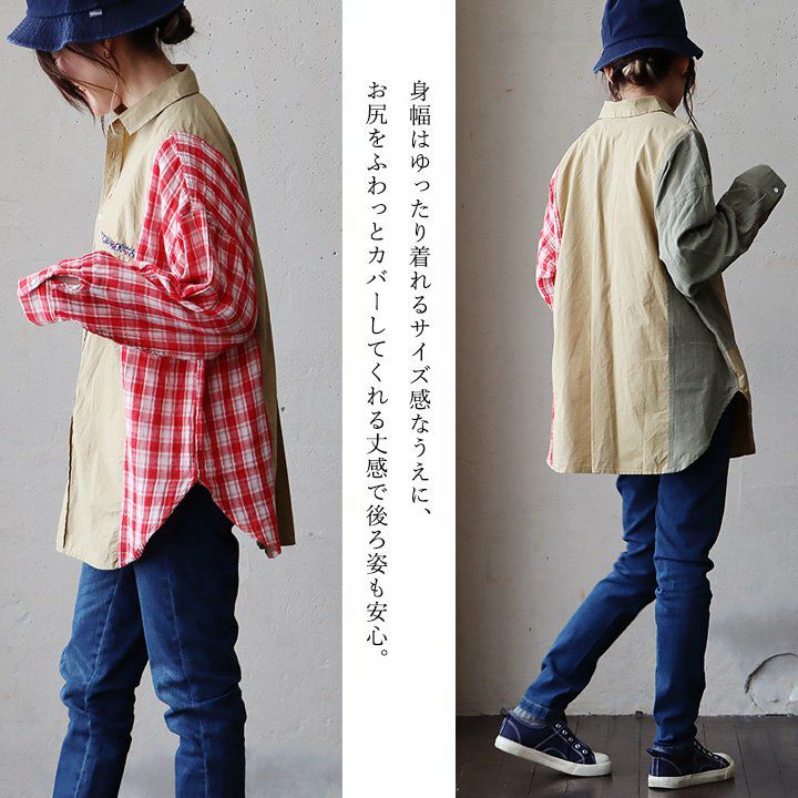やりすぎてないくらいの遊びだから。 シャツ 長袖 レディース 綿100% コットン 配色 チェック柄 無地 パッチワーク 薄手 軽い お尻カバー 大きいサイズ ゆったり カジュアル メンズライク PATY パティ GENTIL ジャンティ