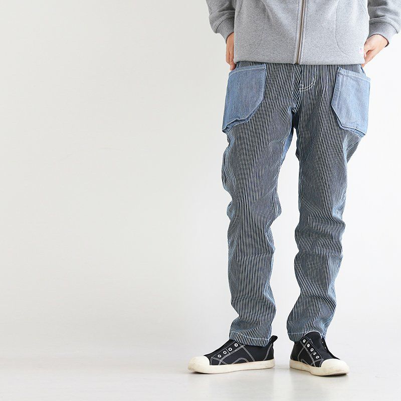 動きの馴染み、抜群です! KRIFF MAYER クリフメイヤー クライミングパンツ メンズ レディース ストレッチ 動きやすい しっかり 丈夫 ウエストゴム ウェイビングベルト テーパード 配色 ガーデニングポケット キャンプパンツ デニム ヒッコリー アメカジ カジュアル メンズライク パティ