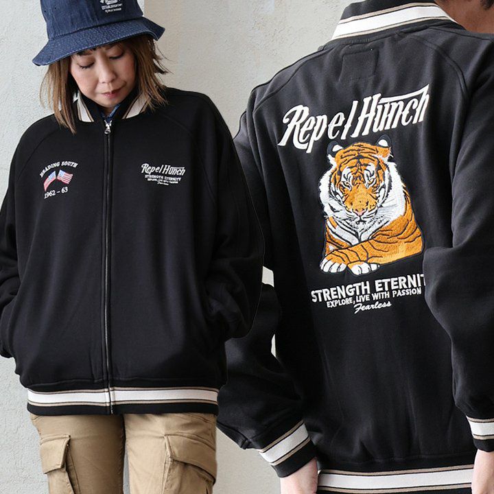 迫力のある虎。なのに羽織ると軽やか。 スカジャン 長袖 メンズ レディース コットン スウェット 裏起毛 暖かい 軽い 伸縮性 トラ 虎 アニマル 刺繍 袖リブ カジュアル 秋 冬 パティ