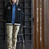 【モデルコメント】中は、シャツや多少厚手のトップスも合わせやすそうです。程好くゆとりがあって、ボクは着るならこのサイズが良いですね。 【客観的コメント】まもるくらいの体型なら、ジャストサイズで着るならMサイズ、中に、色々合わせて着たいならLサイズって感じのサイジングだね。