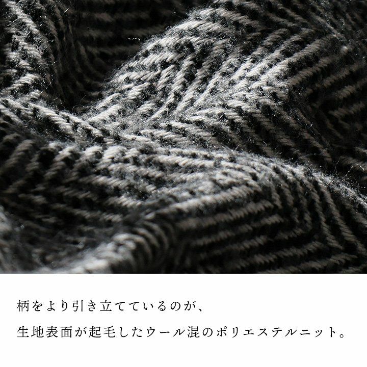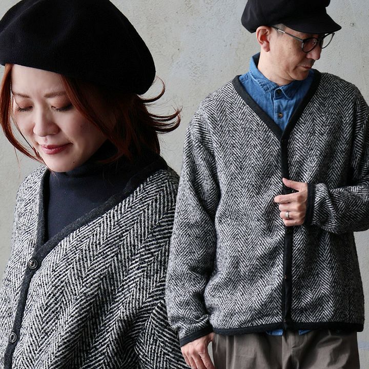 大人好みのシックな「ヘリンボーン」。 カーディガン 長袖 メンズ レディース Vネック 重ね着 ヘリンボーン モノクロ ポリエステル ウール 軽い 暖かい ゆったり カジュアル レトロ ヴィンテージ 秋 冬 パティ modem Design モデムデザイン