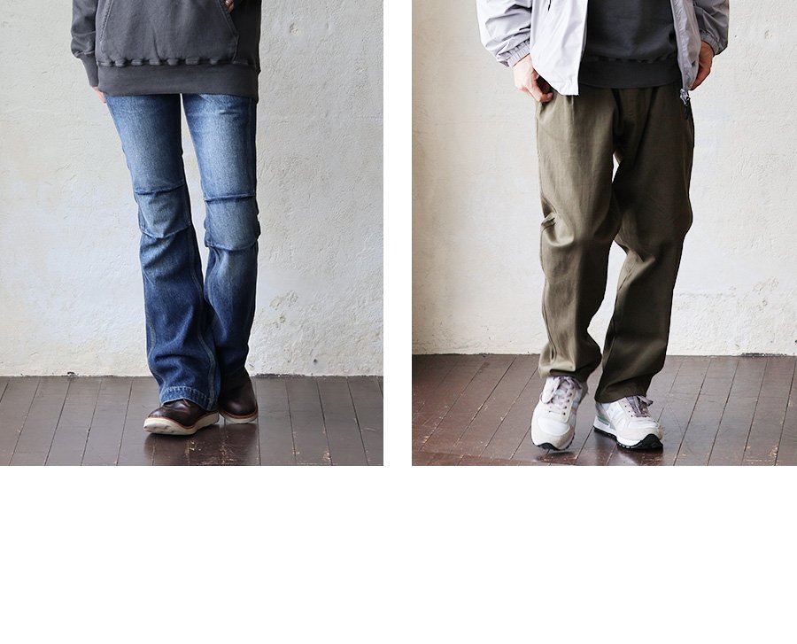 【モデルコメント】中は、カットソー1枚くらいは合わせやすそうです。窮屈感はありませんが、腰周りにフィット感のあるサイジングでした。 【客観的コメント】お尻はすっぽりと隠れる着丈の長さです。見た感じでも、分かるくらいのフィット感はありましたね。