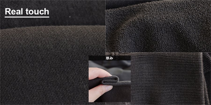 適度な厚みで軽く、サラサラの肌触りで吸水性に優れた米綿100%の9オンスフレンチテリー(裏毛)。裏側はパイル状になっていて、編地による伸縮性があり、透け感はありません。