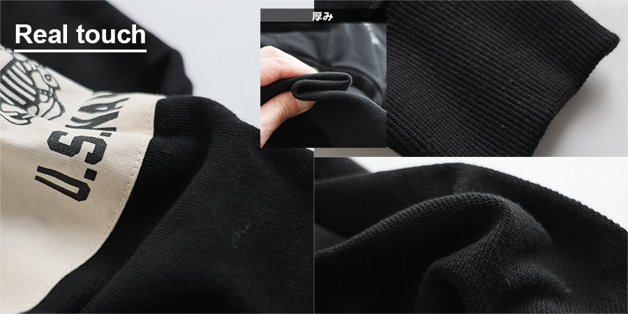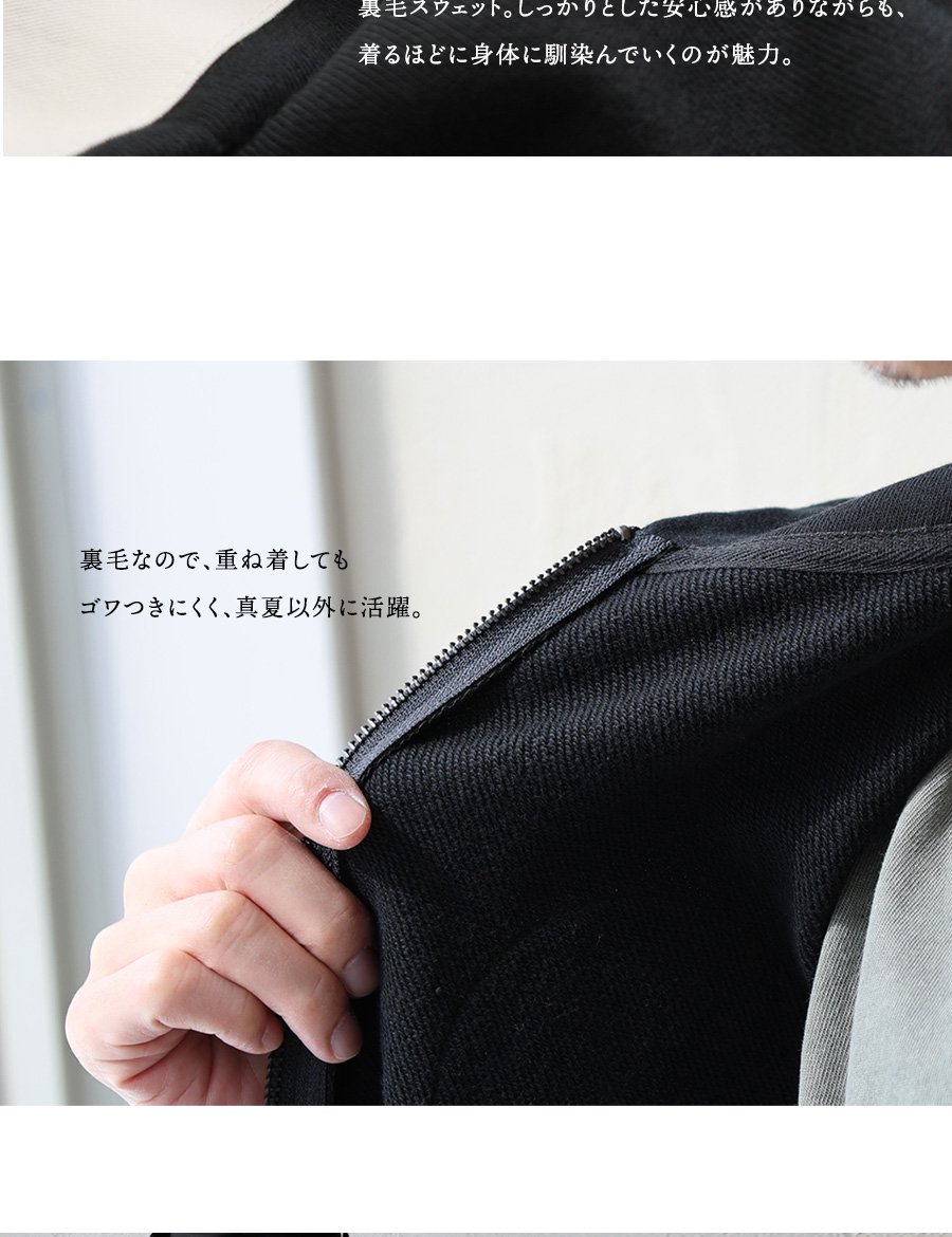 本体:程よく厚みがありガシッとタフなコットン100%の裏毛スウェット。編地による伸縮性があり、透け感はありません。