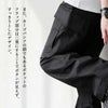 【モデルコメント】骨盤より少し上で穿きました。窮屈感はありませんが、ウエストやお尻はジャストって感じです。中は、タイツくらいは合わせやすそうなゆとりがありました。 【客観的コメント】裾は地面に擦れる丈の長さです。バランスの良いシルエットで穿けていましたね。