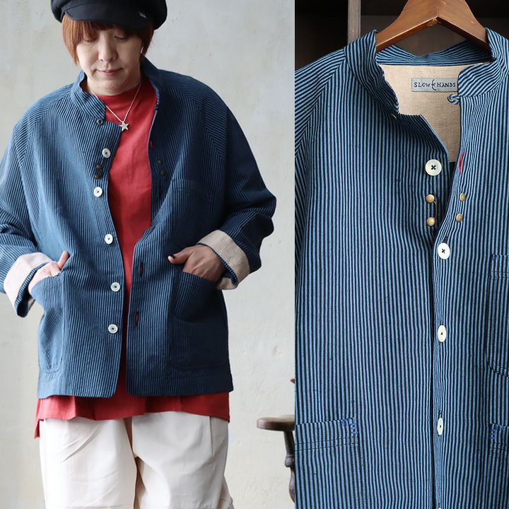 5. SLOW HANDS スローハンズ ジャケット カバーオール カンフージャケット メンズ レディース スタンドネック ストライプ 綿麻 コットン リネン 薄手 軽い ゆったり 大きいサイズ カジュアル パティ