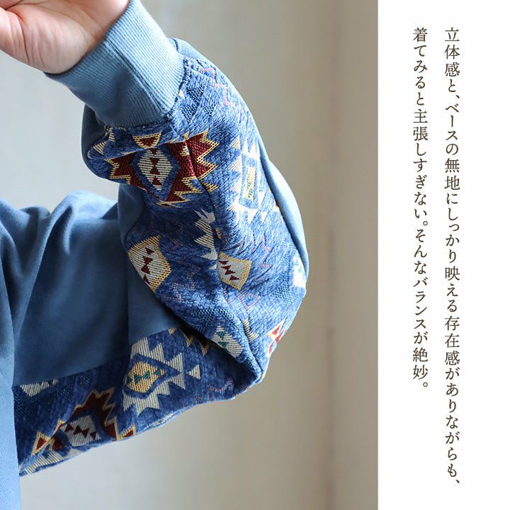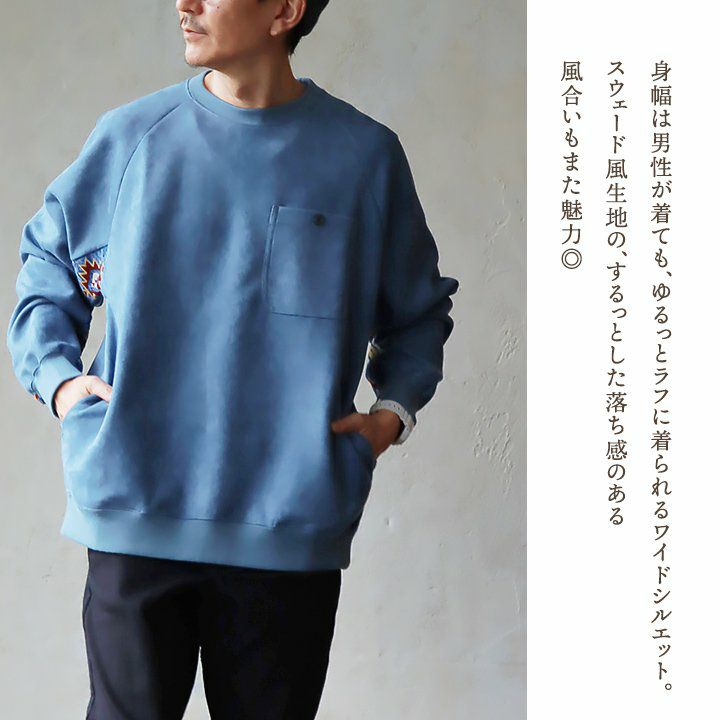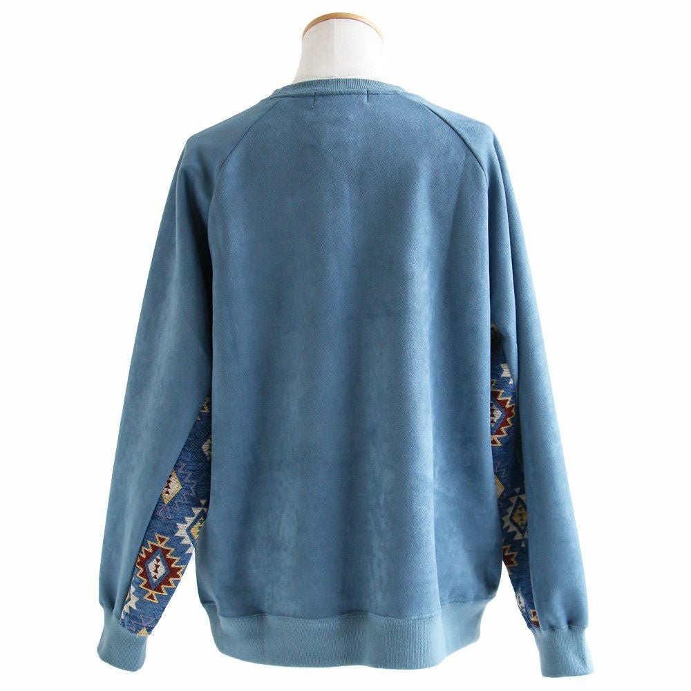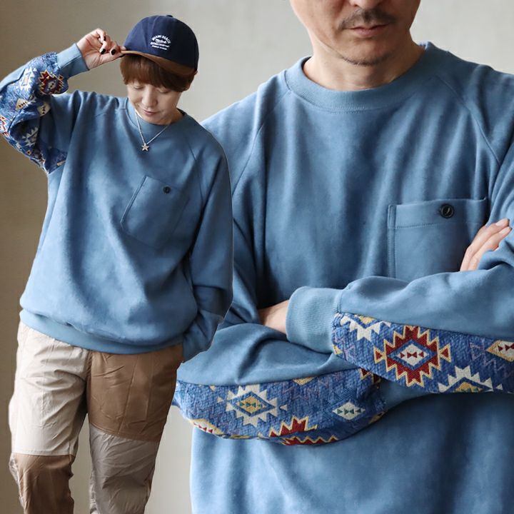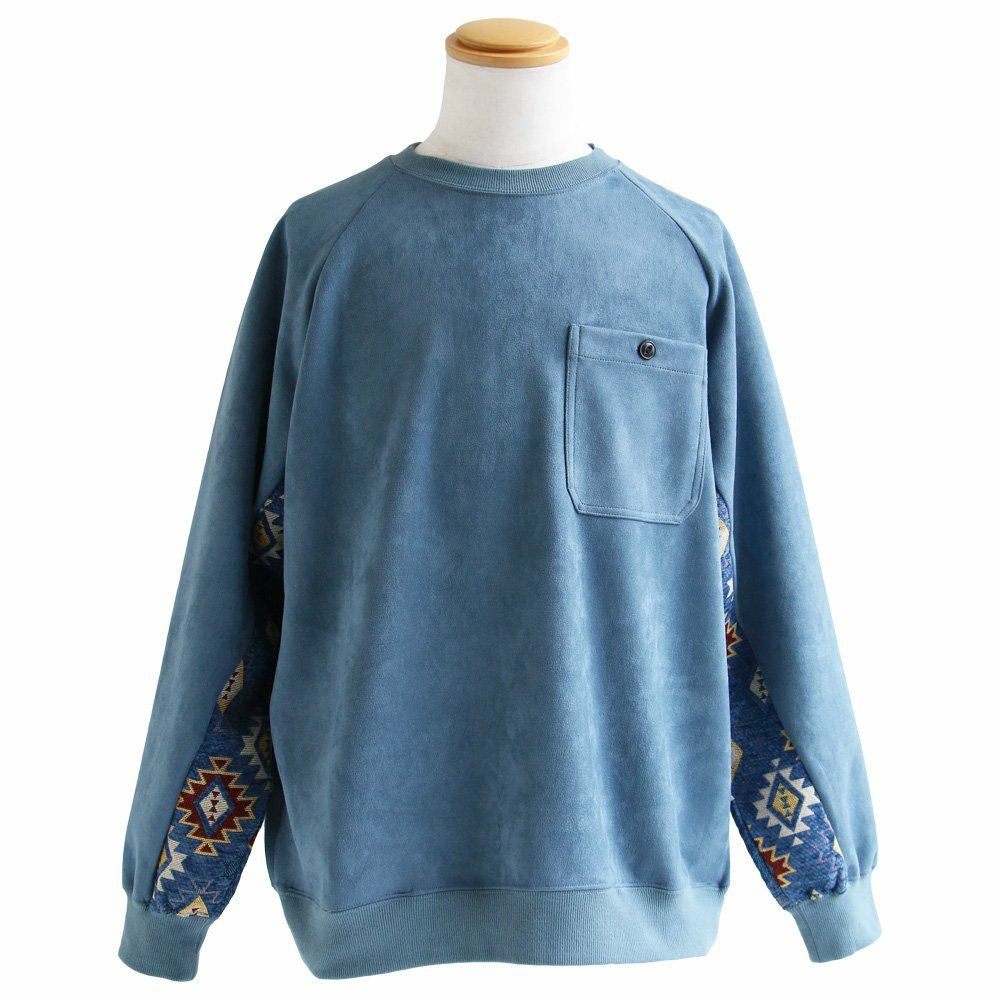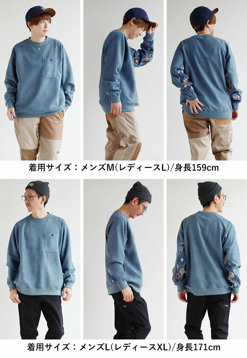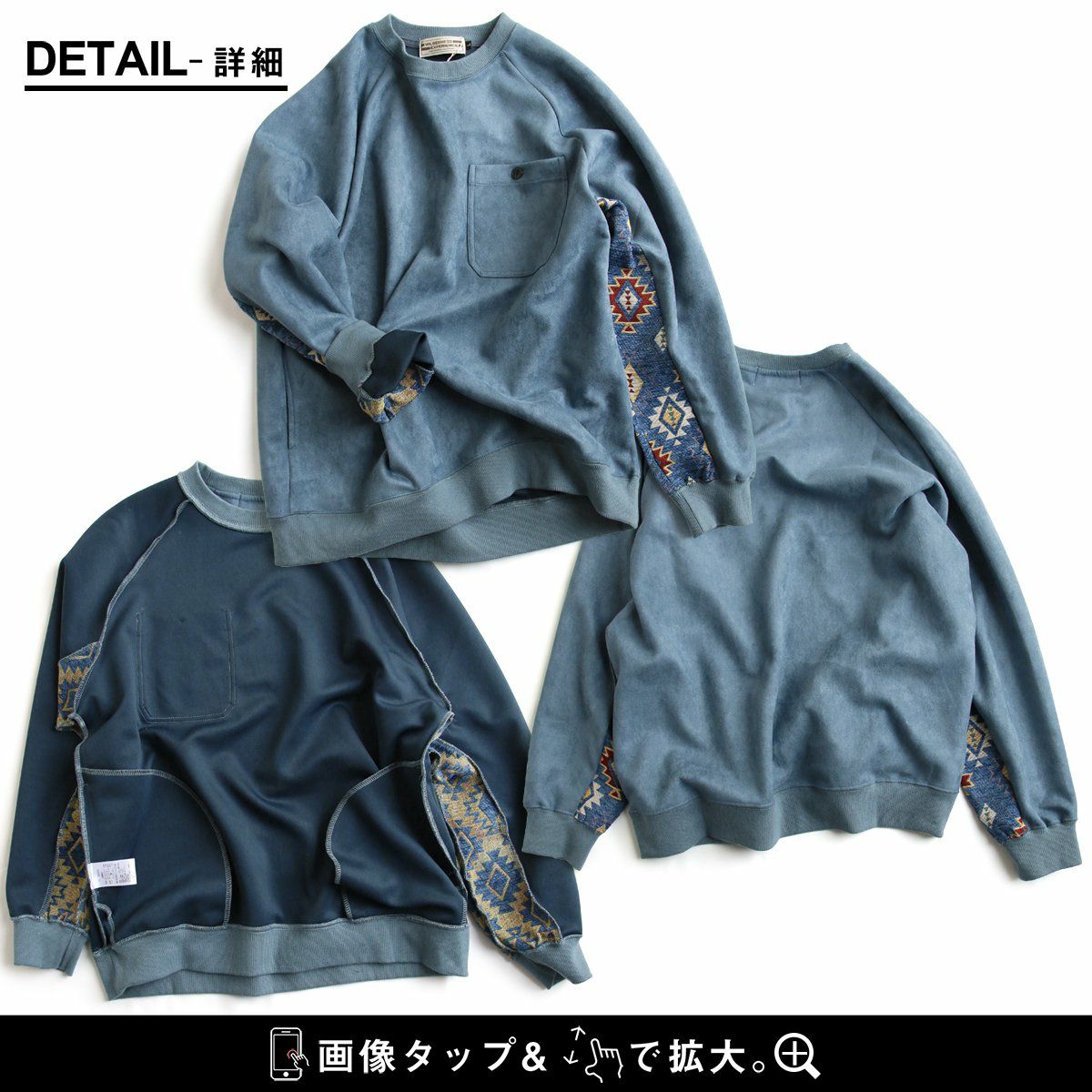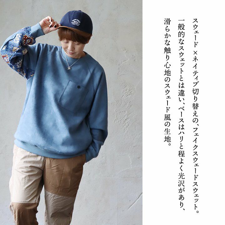 雰囲気が違うだけで、こんなにカッコいいだなんて。 スウェット 長袖 メンズ レディース クルーネック フェイク スウェード ハリ 異素材切り替え ネイティブ柄 伸縮性 ストレッチ ゆったり 大きいサイズ アメカジ カジュアル 秋 冬 パティ WILDERNESS EXPERIENCE ウィルダネスエクスペリエンス