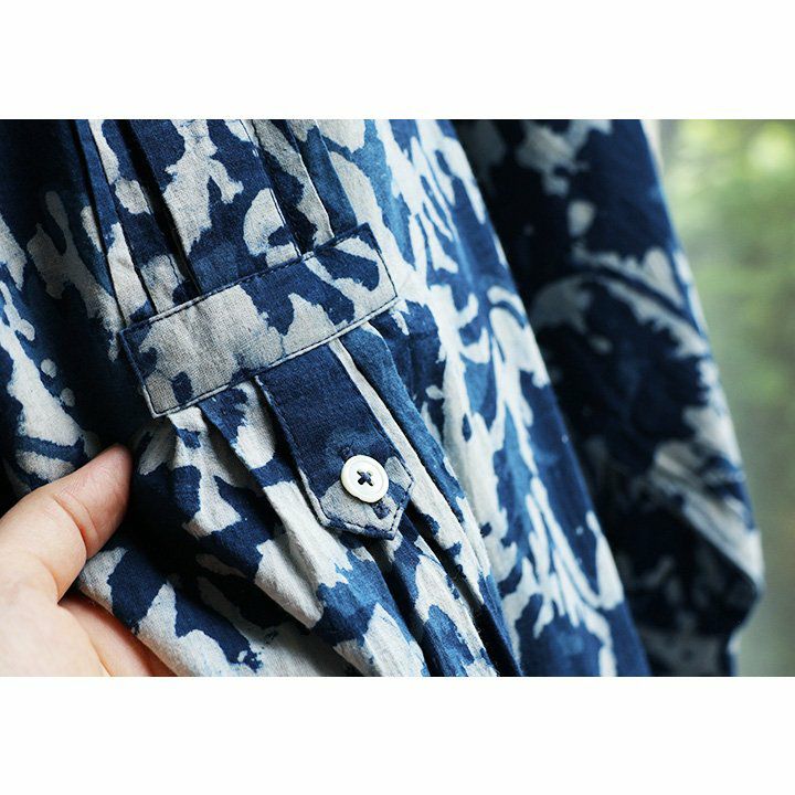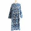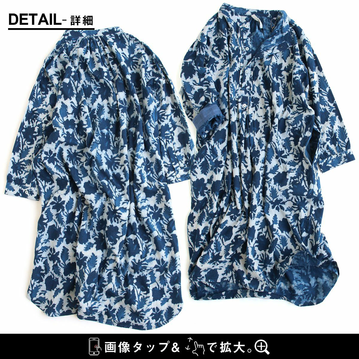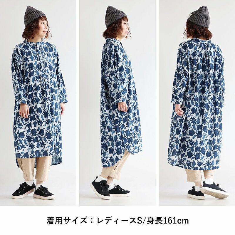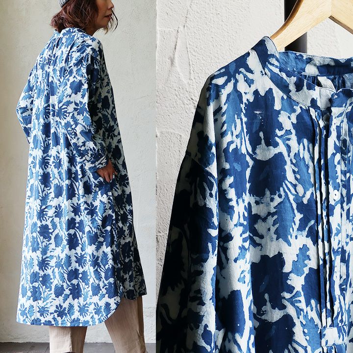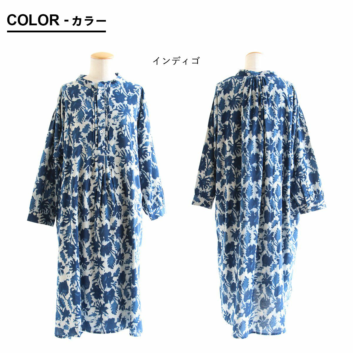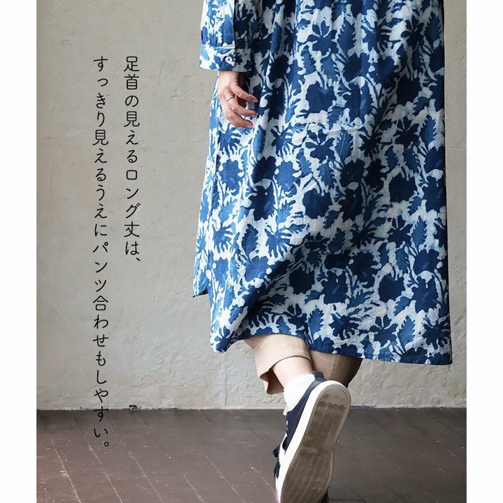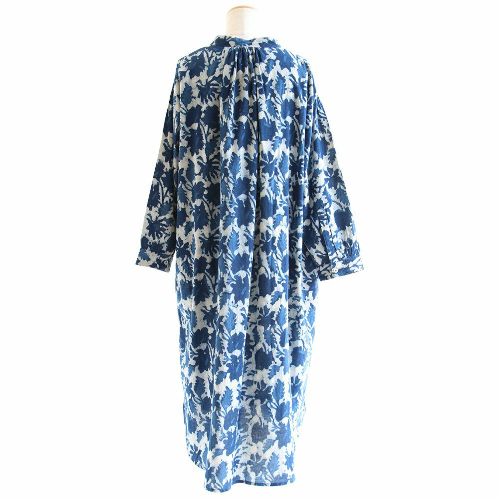 清涼感ある「藍の花」。 SLOW HANDS スローハンズ ワンピース ワンピ 長袖 バンドカラー ロング丈 レディース 綿100 コットン ブロックプリント 手作業 花柄 涼しい 軽い 薄手 体型カバー カジュアル 春 夏 秋 パティ