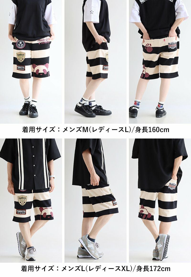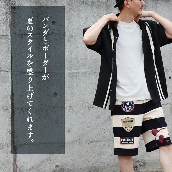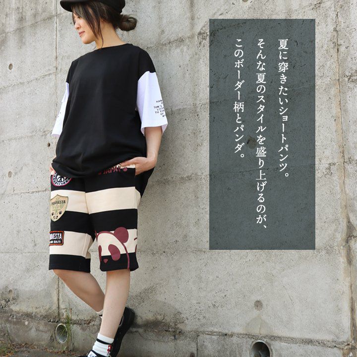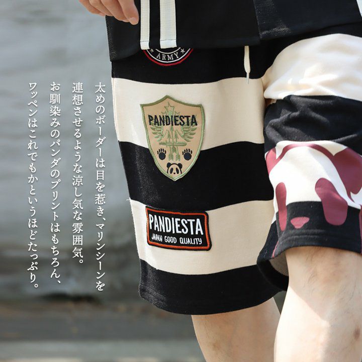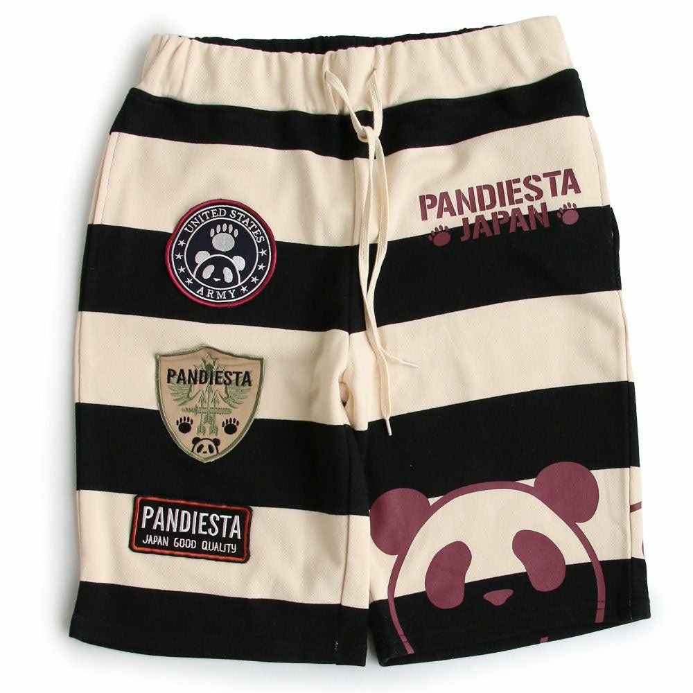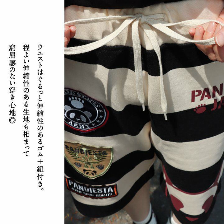 マリンなパンダ。 PANDIESTAJAPAN パンディエスタジャパン ショートパンツ パンツ ハーフパンツ メンズ レディース パンダ 熊猫 ボーダー 配色切り替え ワッペン プリント 綿100 裏毛 コットン 伸縮性 ウエストゴム ゆったり 大きいサイズ カジュアル 夏 夏服 パティ