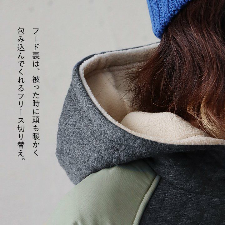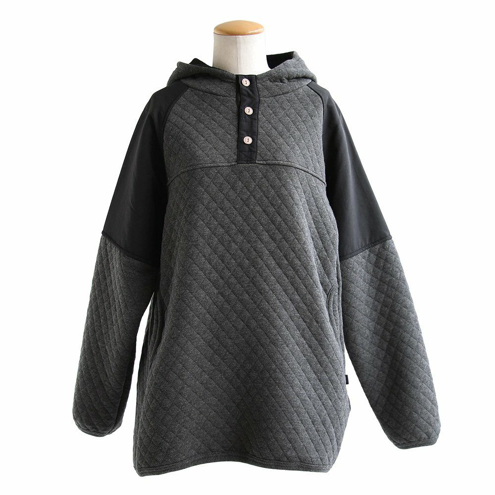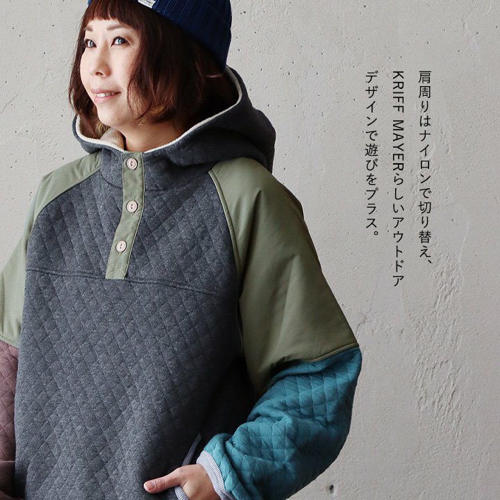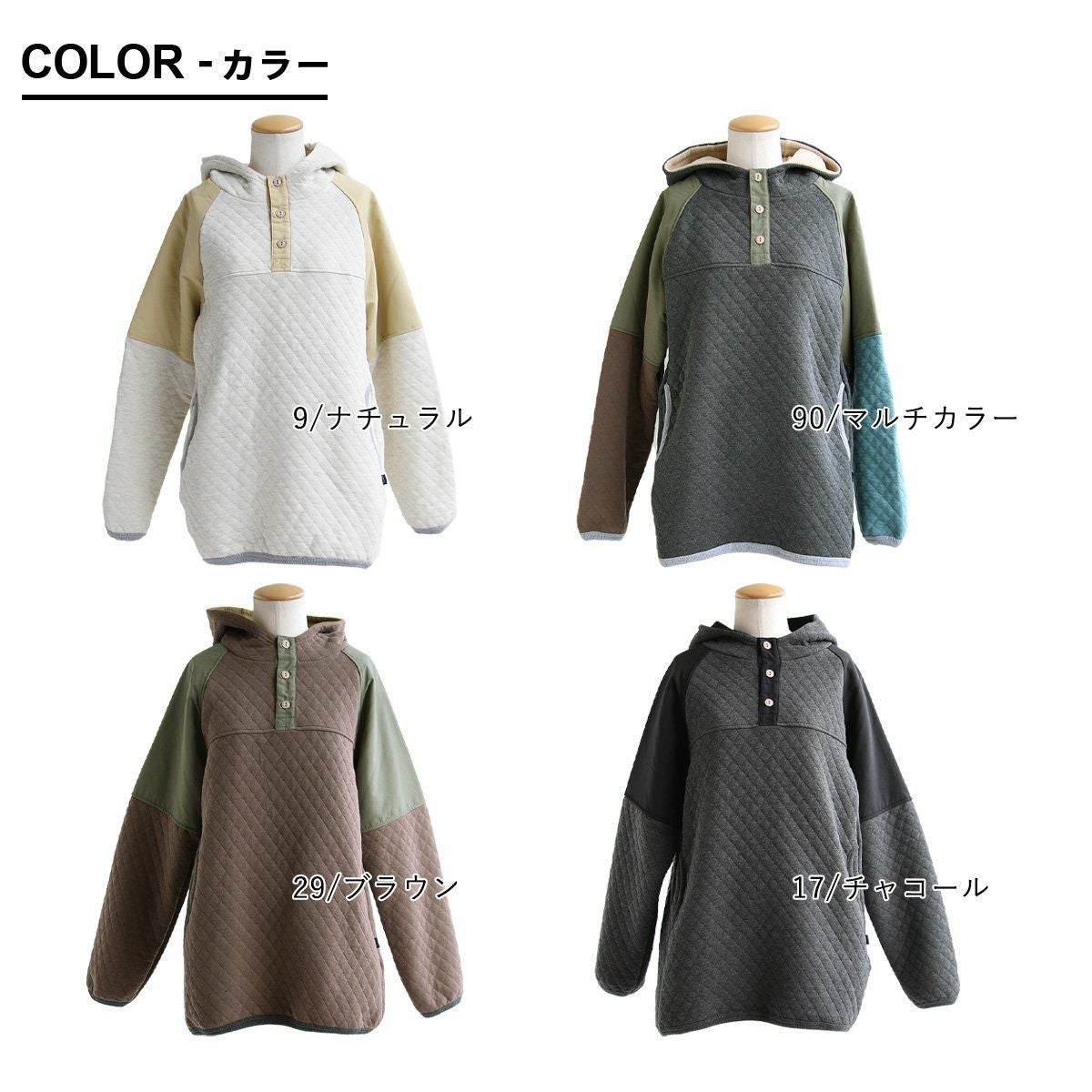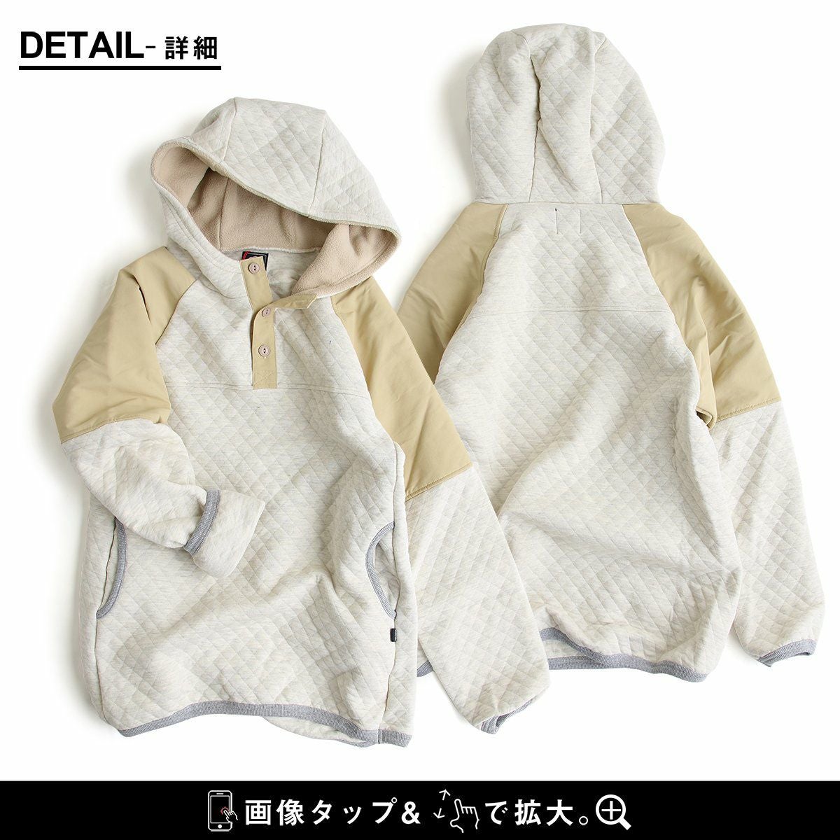 アウトドアにも、インドアにも、両方にマッチ。 KRIFF MAYER クリフメイヤー パーカー チュニック レディース お尻隠れる 異素材切り替え コットンキルト ナイロン 配色 フリース 暖かい 軽い ゆったり 体型カバー 秋 冬 カジュアル アウトドア お家時間 PATY