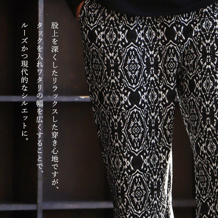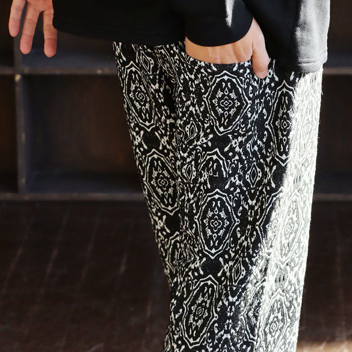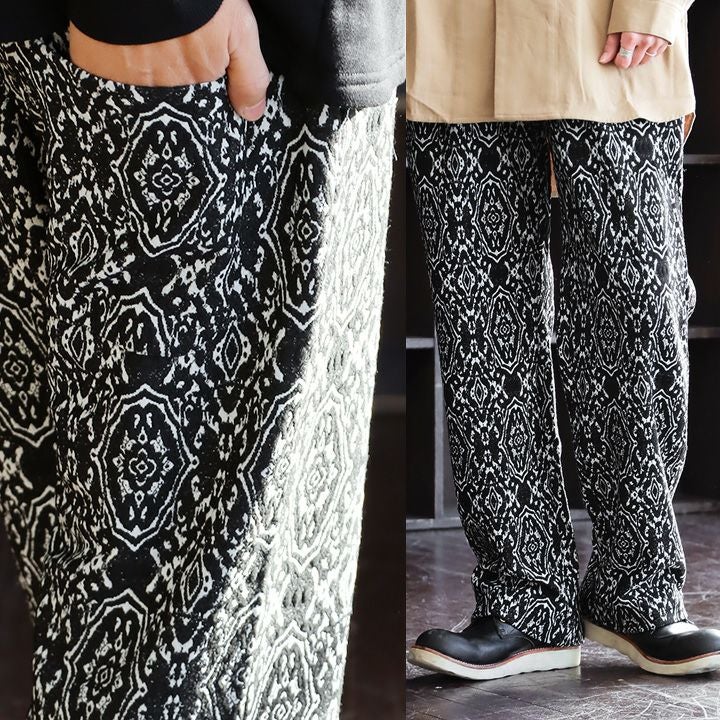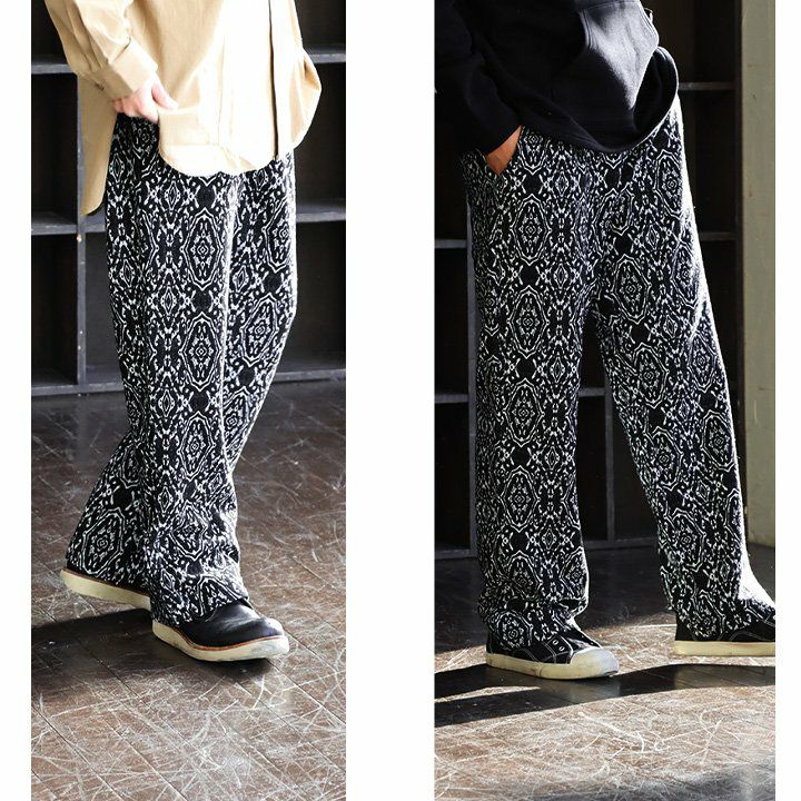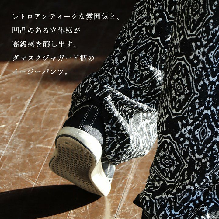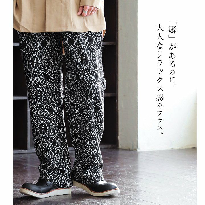 「癖」があるのに、大人なリラックス感をプラス。 パンツ ストレート メンズ レディース ウエストゴム カットソー地 セミワイド タック 深股上 総柄 レトロ アンティーク ダマスクジャガード 楽ちん リラックス