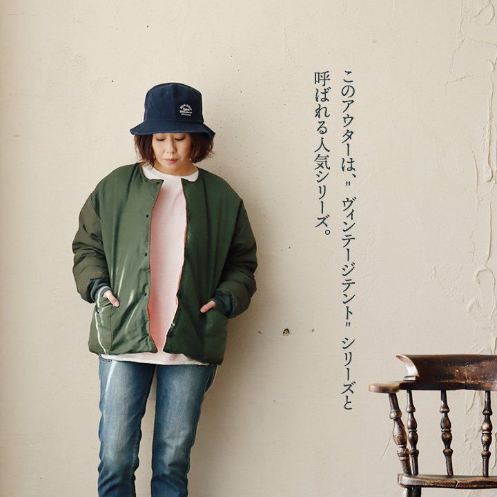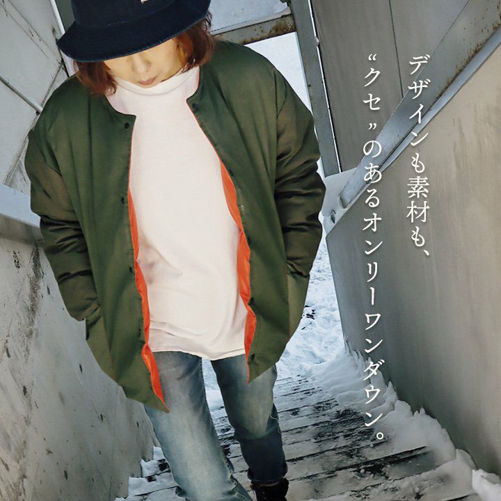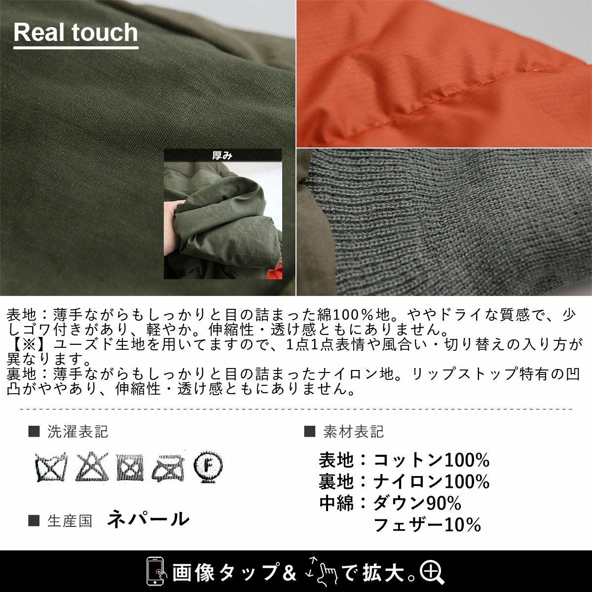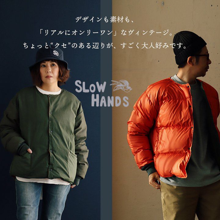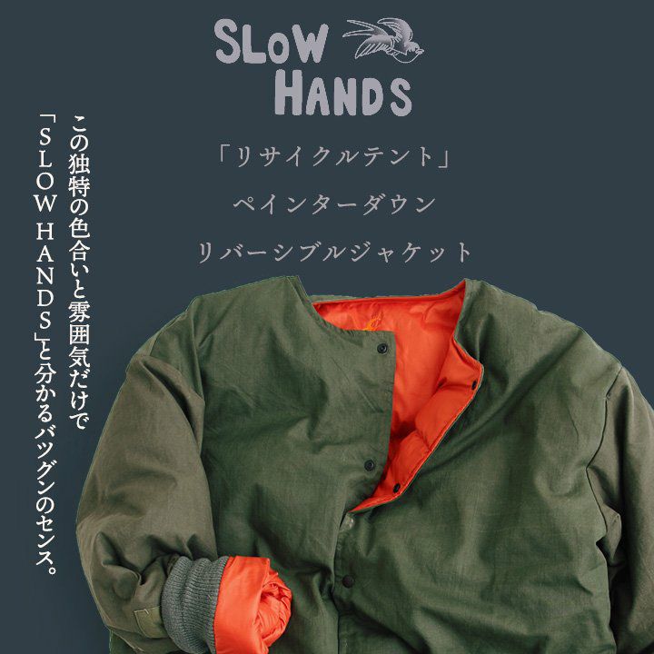 デザインも素材も、“クセ”のあるオンリーワンダウン。 SLOW HANDS スローハンズ ダウン ジャケット メンズ レディース リバーシブル MA-1 ペインター パッチワーク インド軍 テント地 ナイロン リップストップ ミリタリー 冬