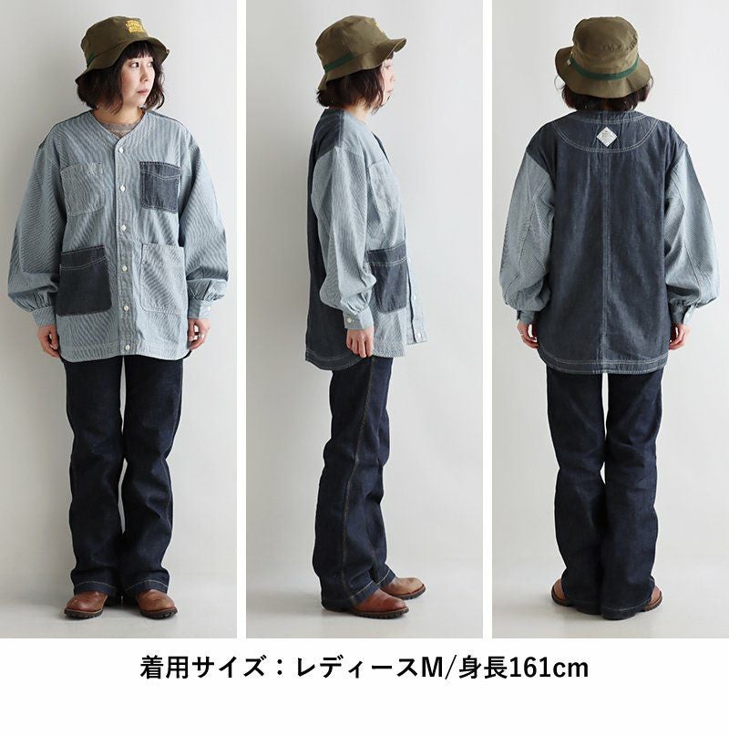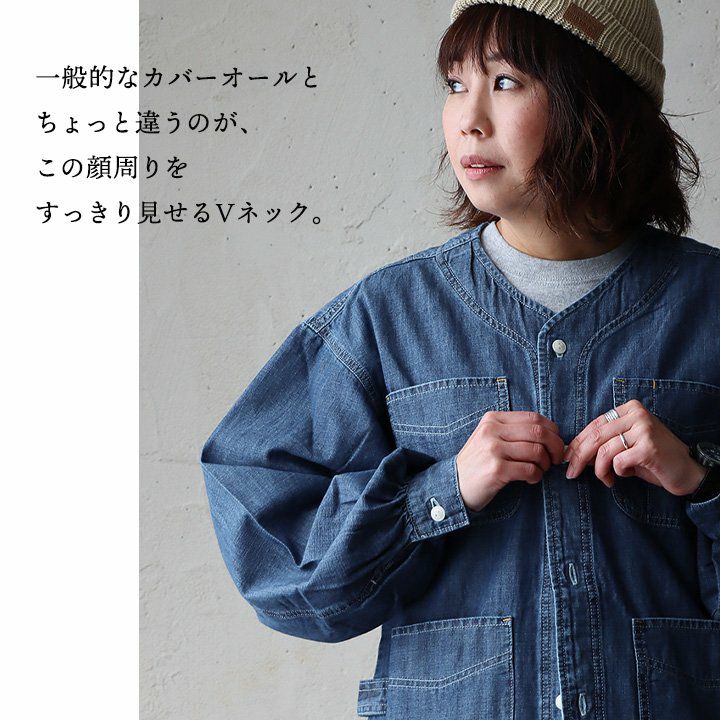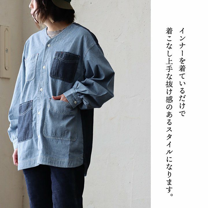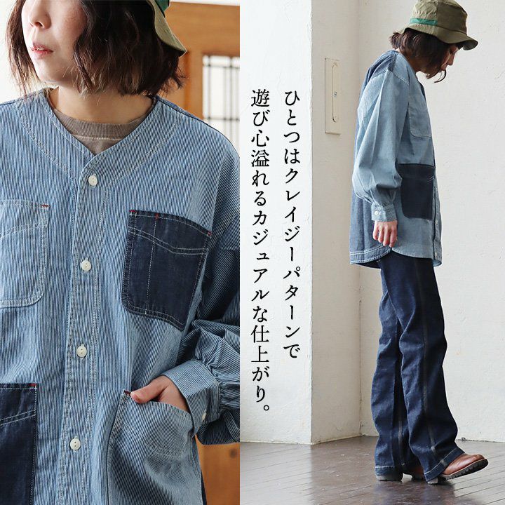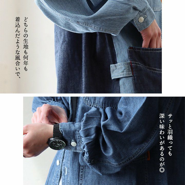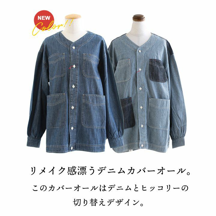 ヒッコリーとデニムの「粋」な使い方がツボ。 KRIFF MAYER クリフメイヤー カバーオール シャツ デニムシャツ レディース Vネック 切り替え リメイク風 ヒッコリー ストライプ デニム 綿100% しっかり生地 ポケット付き 春 カジュアル ヴィンテージ アメカジ パティ